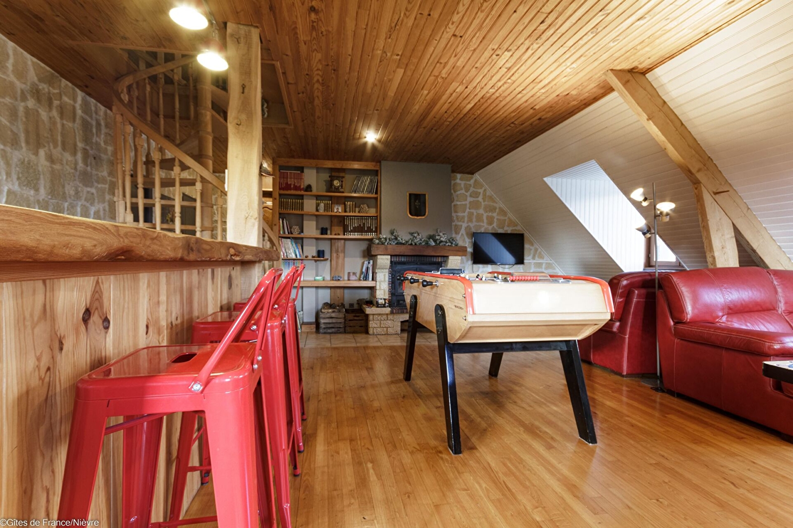 Au 1er étage : 2 chambres ayant chacune 1 lit 160x200, wc indépendant, 1 salle d'eau avec douche grande dimension et double vasque; une grande pièce à vivre (bibliothèque, babyfoot et billard).