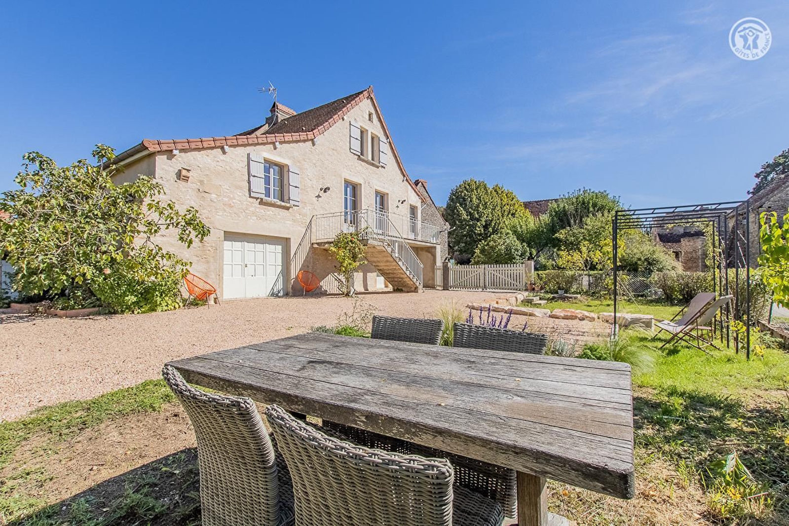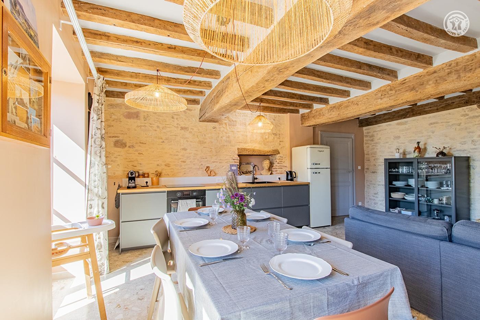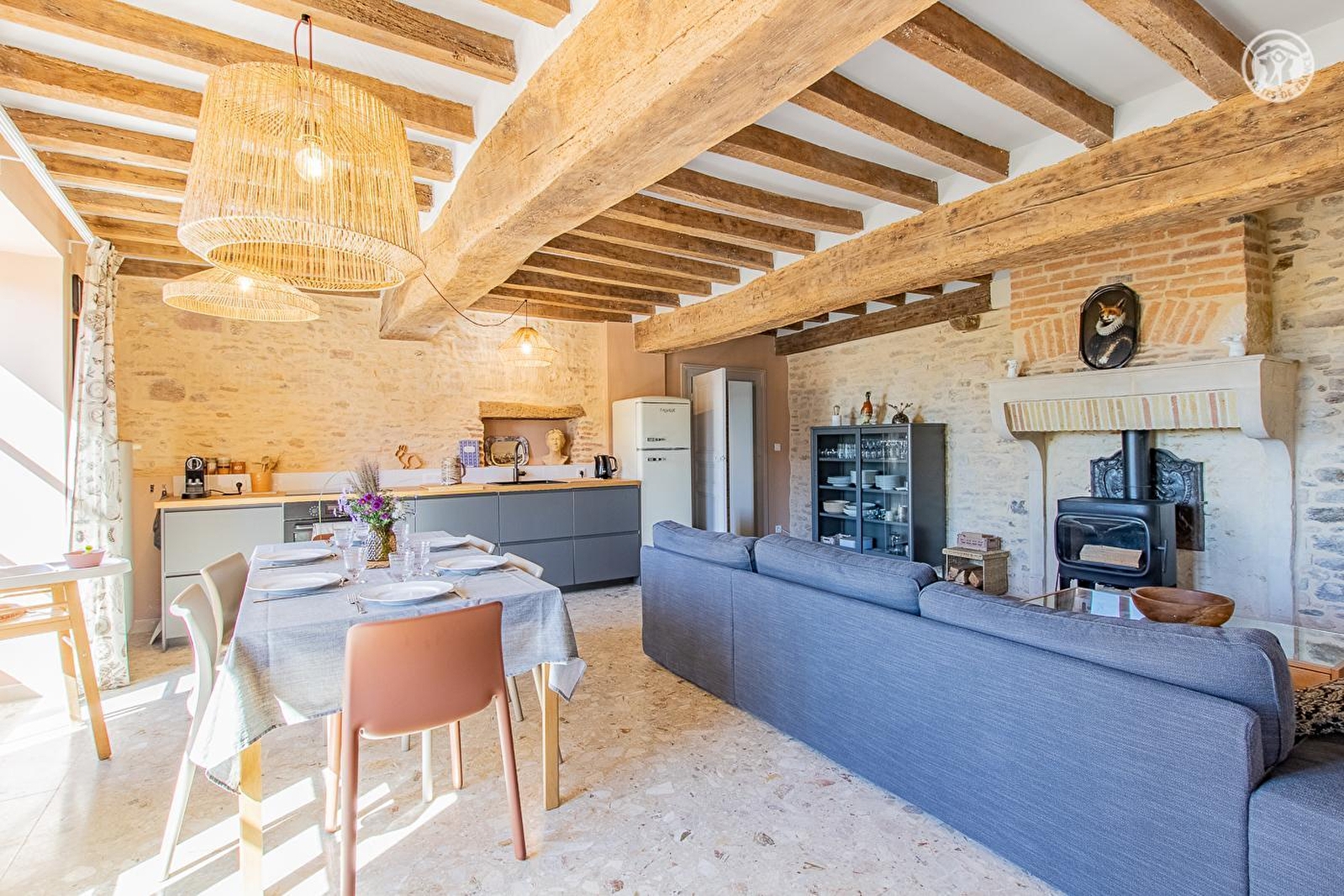 Ravissante demeure mâconnaise traditionnelle du XVIIIe soigneusement restaurée dans les règles de l'art, blottie au calme en bordure de ruelle & prairies, aux confins d'un paisible hameau chargé de "grande histoire", ayant jadis abrité un Prieuré fondé au XIe - dont demeurent les vestiges - dédié aux jeunes filles issues de la noblesse locale (les célèbres "Dames de Lancharre"). Parfaitement préservé & riche d'un exceptionnel patrimoine (église romane classée du XIe, belles maisons typiques, pierres tombales médiévales classées, tuilerie du XVe, porte fortifiée d'une ancienne abbaye royale…), le site profite d'un bucolique écrin champêtre & naturel, lové en bordure de champs à l'orée d'une vaste forêt, non loin des premiers vignobles & collines boisées du massif Sud Bourgogne (superbe espace sauvage à parcourir à pied ou VTT). Spacieux gîte de très bon confort. Chaleureux cachet campagnard aux accents contemporains (ponctuée de quelques insolites touches "sixties") sublimé par une restauration patrimoniale très soignée (majestueuse poutraison, manteau de cheminée en pierre & briques, murs en pierres, imposant linteaux de portes en pierres, tomettes etc… d'origine). Énormément de charme & caractère. Ambiance cocooning & cosy conjuguée à l'âme dépaysante des lieux. Large balcon panoramique offrant une belle vue dégagée sur la campagne environnante. Agréable jardin clos de 400m², fleuri & végétalisé, doté d'une cour.