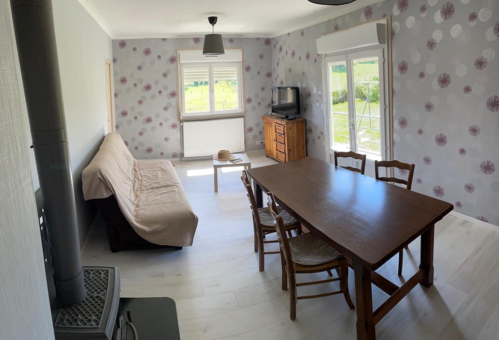 Maison indépendante de plain-pied entièrement rénovée à 5 km de Poligny. Elle se compose d'une cuisine intégrée toute équipée, d'un salon indépendant avec TV, canapé convertible et poêle à bois, d'une chambre avec 2 lits simples et sanitaires privatifs (douche et WC), d'une chambre avec 2 lits simples et d'une chambre avec un lit double, d'une salle d'eau avec cabine de douche et d'un WC indépendant. Garage avec lave-linge et possibilité de ranger des vélos ou motos. Côté extérieur : terrain attenant non clos, cour indépendante, terrasse, salon de jardin, barbecue, terrain de pétanque et balançoire. Chauffage central au fuel en partie compris. Bois fournis pour le poêle. Draps fournis à l'arrivée pour les séjours à la semaine, pour les locations au week-end, les draps peuvent être loués au tarif de 8 euros la paire. Gîte non fumeur. Accepte les chèques vacances.