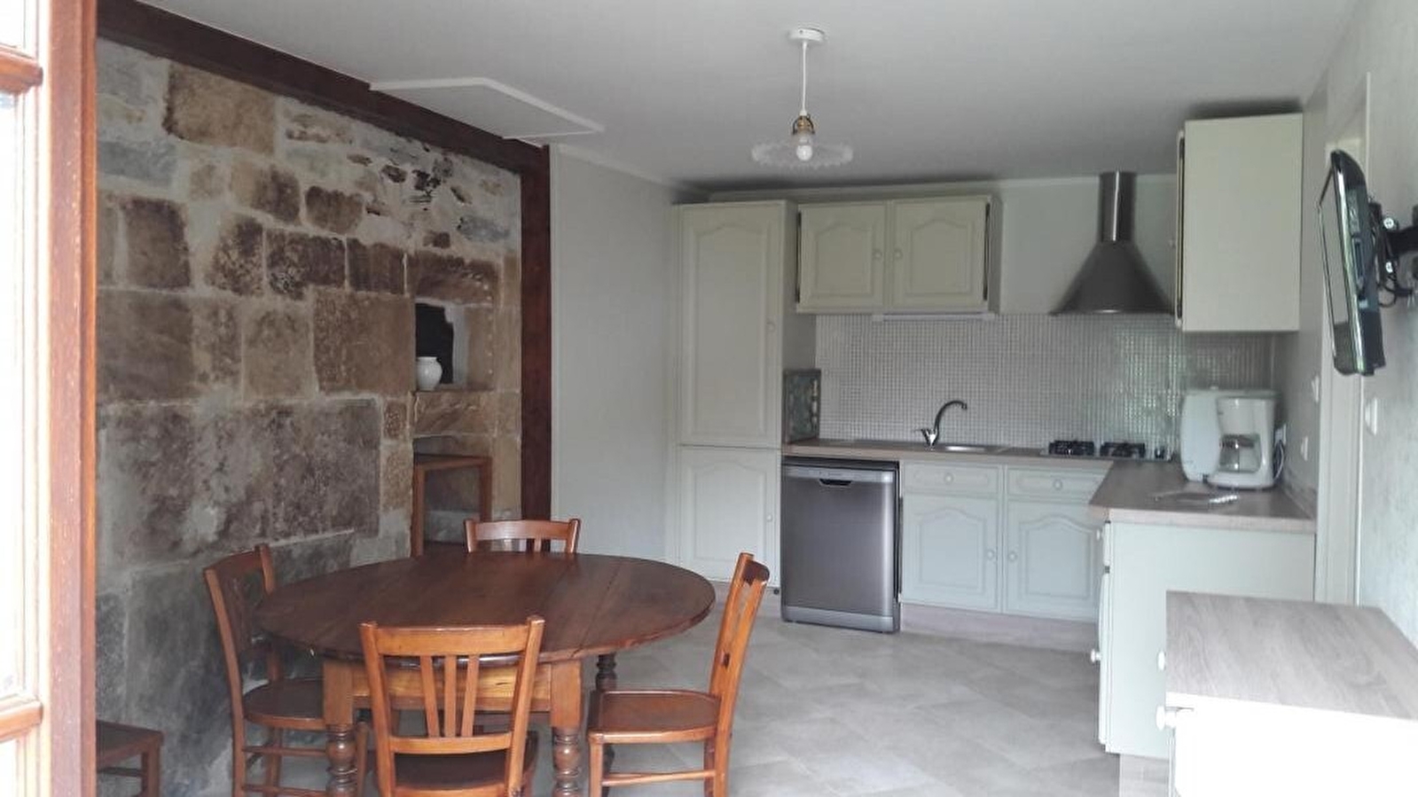 Maison mitoyenne de plain-pied. Cuisine équipée d'un lave-vaisselle, séjour, salle d'eau, toilettes indépendantes, ch1: 1 lit 2 pl, 1 lit 1 pl, ch2: 1 lit 2 pl, lit et chaise bébé à disposition. Terrain attenant privatif et clos, salon de jardin, barbecue, terrain de boules et aire de jeux dans le village. Charges comprises. Chauffage central au fuel. forfait ménage (30€). Les animaux sont les bienvenus !(prestation gratuite). WIFI