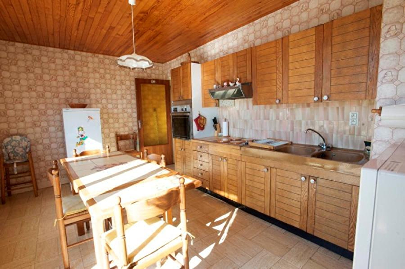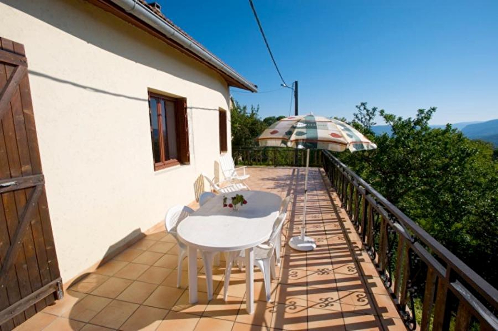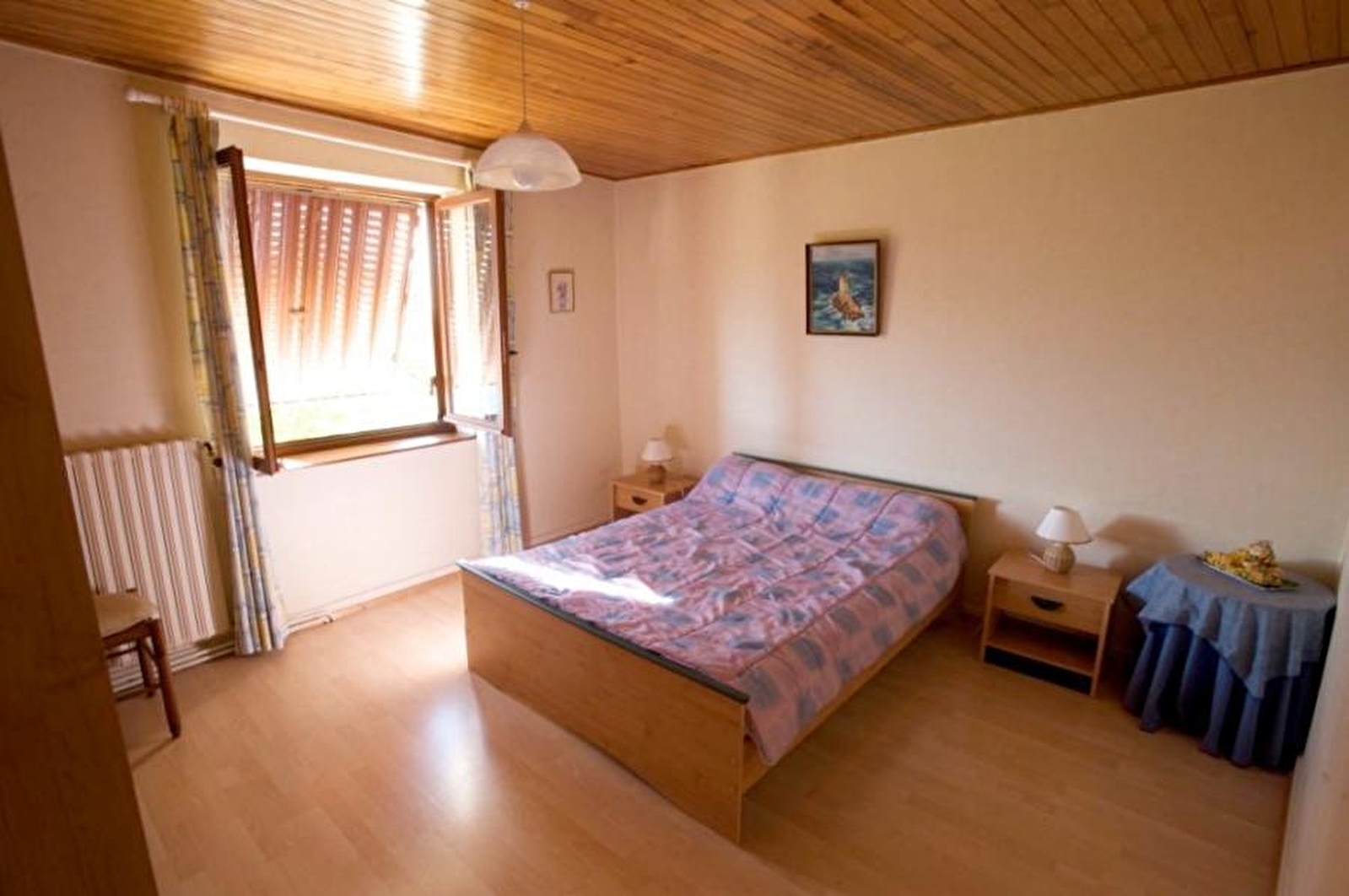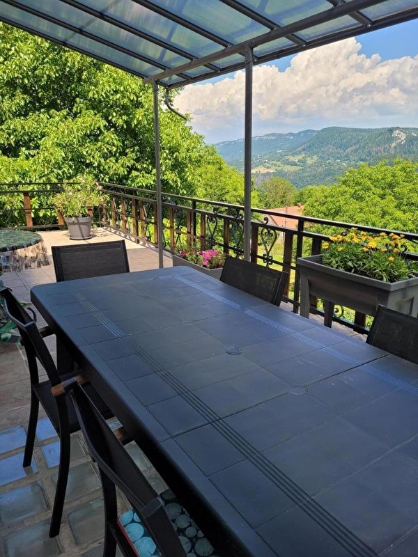 Maison au 1er étage avec vue panoramique sur les monts Jurassien. Grand hall d'entrée, cuisine indépendante, vaste salon avec cheminée, chambre1 : 1 lit 2 pl, chambre2 : 2 lits 1 pl, salle de bain avec baignoire, wc indépendant. Terrasse en balcon avec salon de jardin et barbecue. Équipement bébé sur demande.