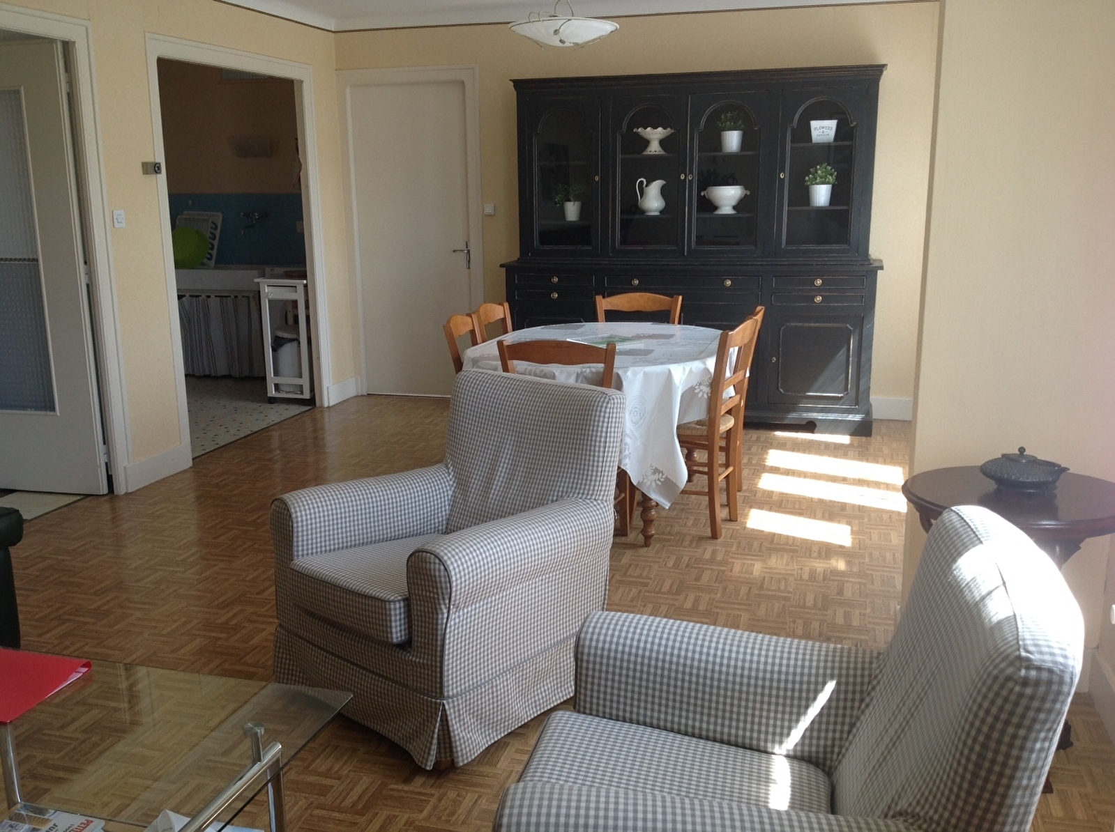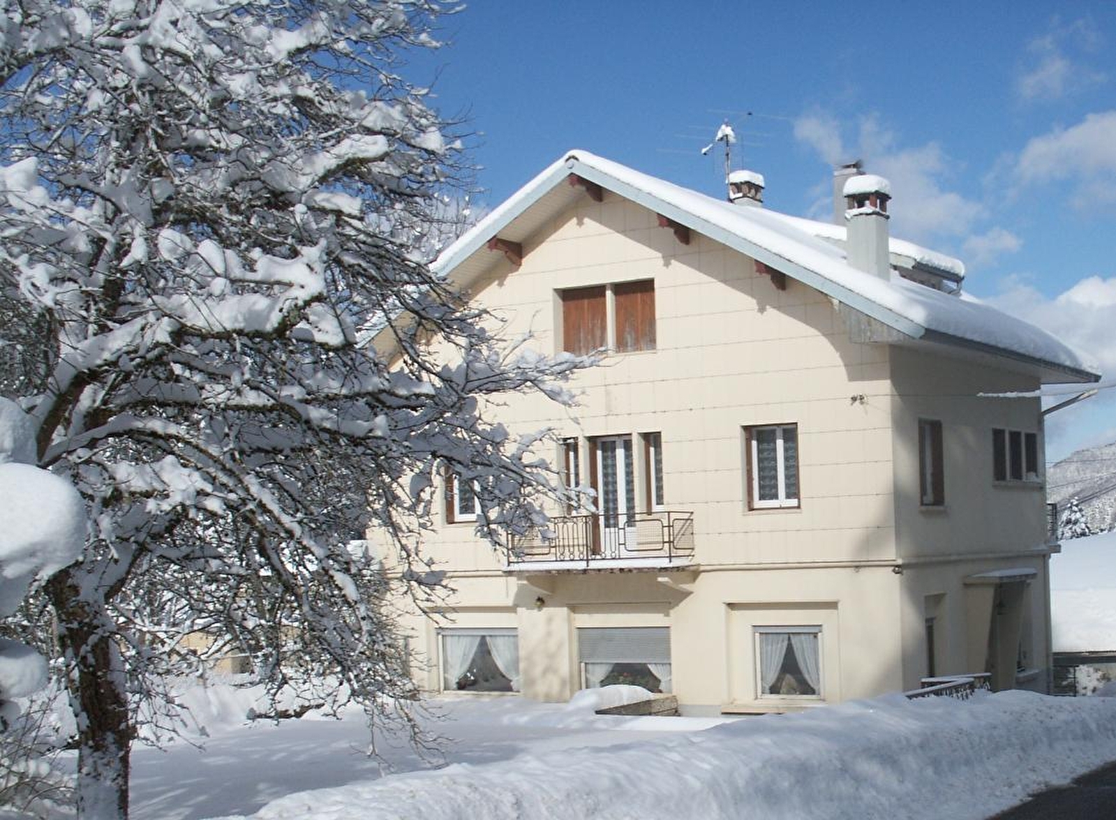 Logement au 1er étage. Cuisine, séjour, une première chambre à 2 lits et une chambre avec 1 lit 2 places, salle de bains et wc séparés, terrain attenant non clos, balcon, salon de jardin. Chauffage central. Toutes charges comprises.