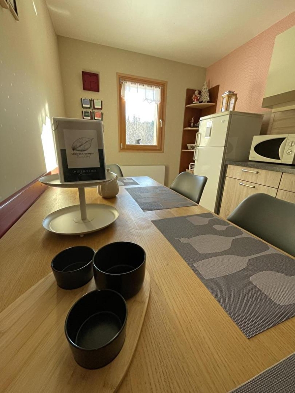 Evadez-vous à la montagne dans notre gîte situé au 1er étage d'une maison de village. Belle vue dégagée sur la nature environnante. Gîte spacieux tout confort situé au coeur du parc naturel du Haut Jura, dans une petite station familiale. Cadre idéal pour se ressourcer été comme hiver et découvrir les richesses et curiosités du Jura. Calme et tranquillité assurées durant votre séjour ! Vous pourrez profiter d'une cuisine équipée (récemment rénovée), d'une salle d'eau avec douche, d'une chambre avec 2 lits 1 place à rapprocher selon configuration, et d'une seconde chambre avec 1 lit 2 places. Les "plus" de notre gîte : terrain attenant privatif non clos, cour permettant de garer la voiture, salons de jardin, chaises longues, barbecue, local pour les vélos et les skis. A disposition : table de tennis de table, livres et jeux de société. Chauffage électrique. Toutes charges comprises. Gîte proche du village (5 min à pied de la boulangerie et 10 min à pied des autres commerces). Un endroit idéal pour skier, faire de la randonnée, se baigner dans les lacs alentours et profiter du grand air. Proche des domaines skiables de Foncine, Chaux Neuve et Chapelle des Bois. Également à proximité de la Suisse si vous souhaitez visiter Lausanne ou Genève. Possibilité de louer une chambre supplémentaire pour 2 pers avec sanitaires privés (70€/ nuit).