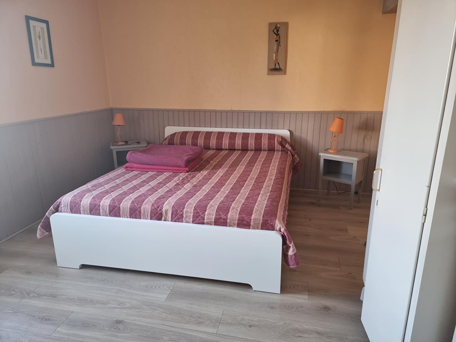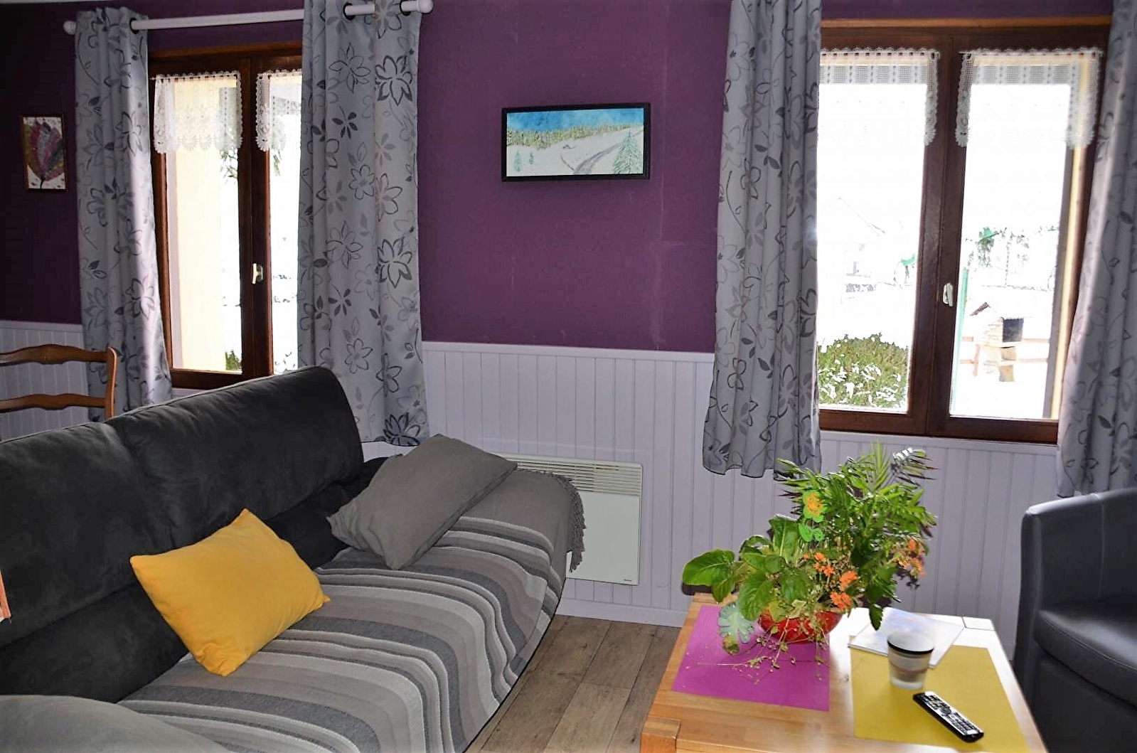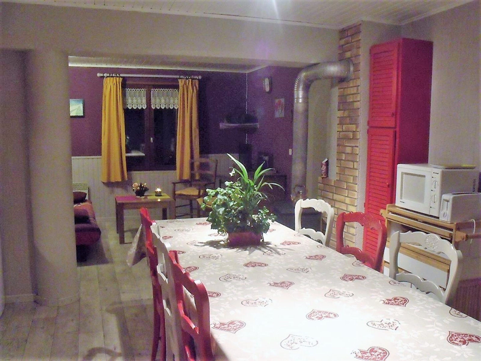 Logement au RDC d'une maison mitoyenne qui abrite un autre gîte. Cuisine-séjour avec poêle à bois, canapé, ch1: 1 lit 2 pl (160*200), ch2: 1 lits 1 pl et 1 lit double (140*190), ch3: 1 lit 2 pl (160*200), salle d'eau, wc indépendants, cellier. Cour commune non close, salon de jardin, barbecue commun. Chauffage électrique. Charges non comprises. A disposition: chaise bébé, 1 lit d'appoint, lecteur dvd bluray. Bois vendu. 1 seul animal accepté.