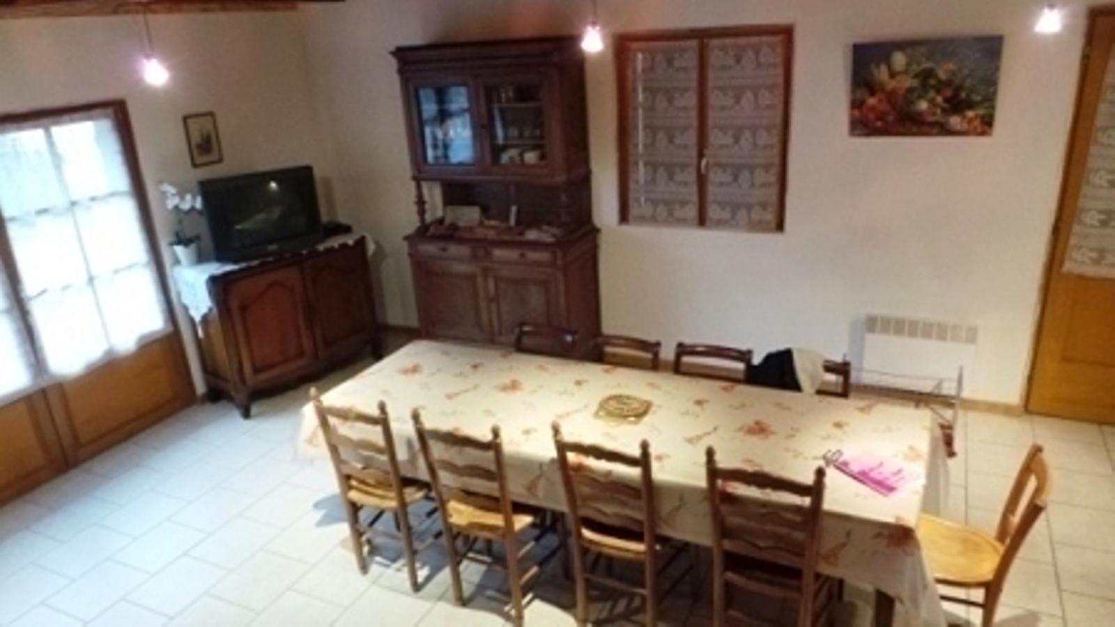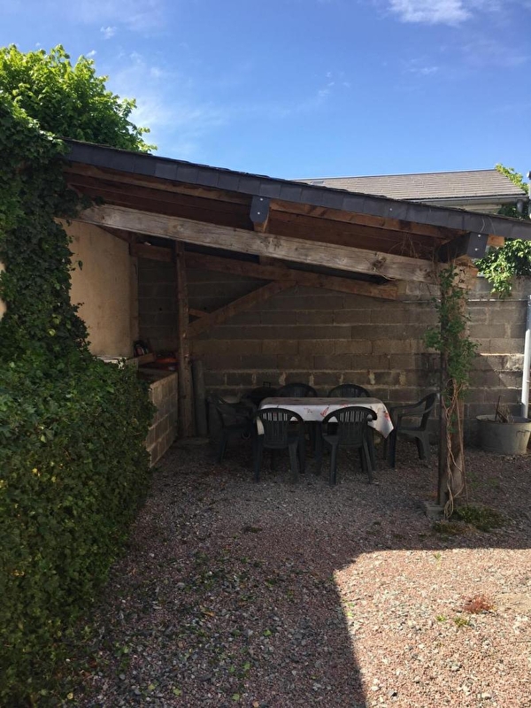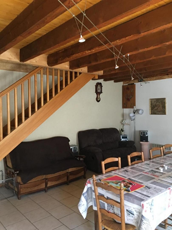 Composition : Maison mitoyenne (à un garage non utilisé). Chauffage électrique. Rdc : séjour-cuisine-salon, salle d'eau (douche), WC indépendant. 1er étage : 2 chambres (1 lit 1 p. 90x190cm + 1 lit 2 p. 140x190cm / 1 lit 1 p. 90x190cm + 1 lit 2 p. 140x190cm). Cour non close + terrasse couverte (au fond de la cour) + 4 VTT. Parking privé. Commerces & services 6 km. Gare TGV : Le Creusot 47 km.