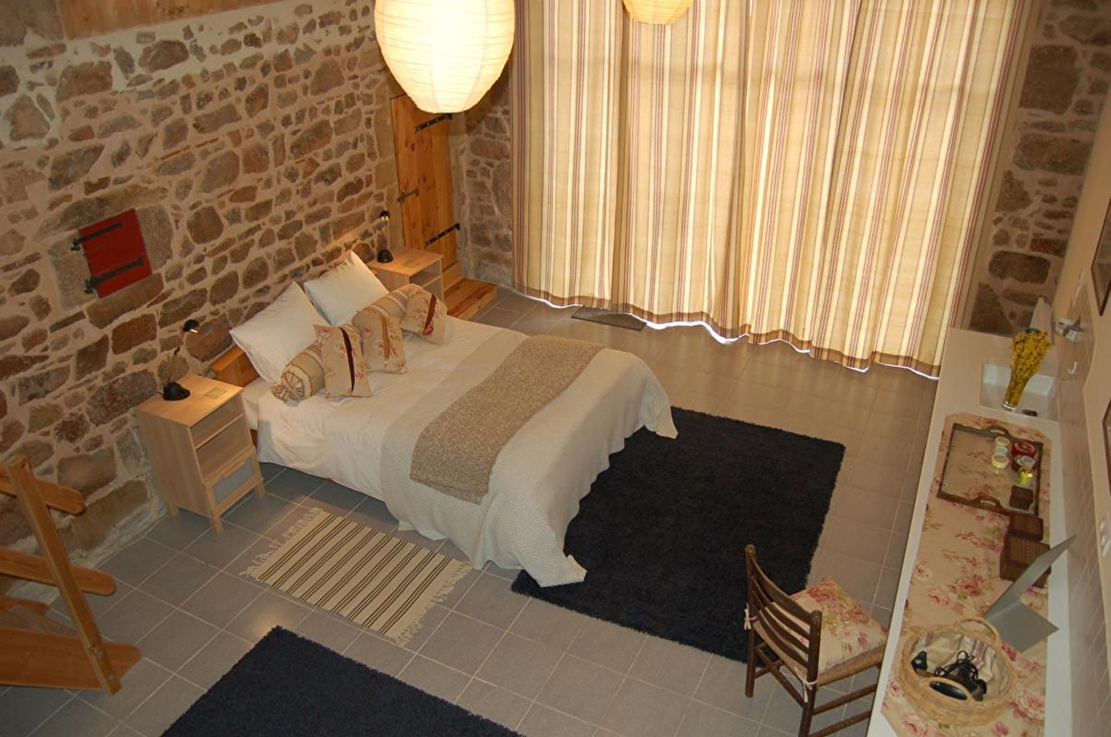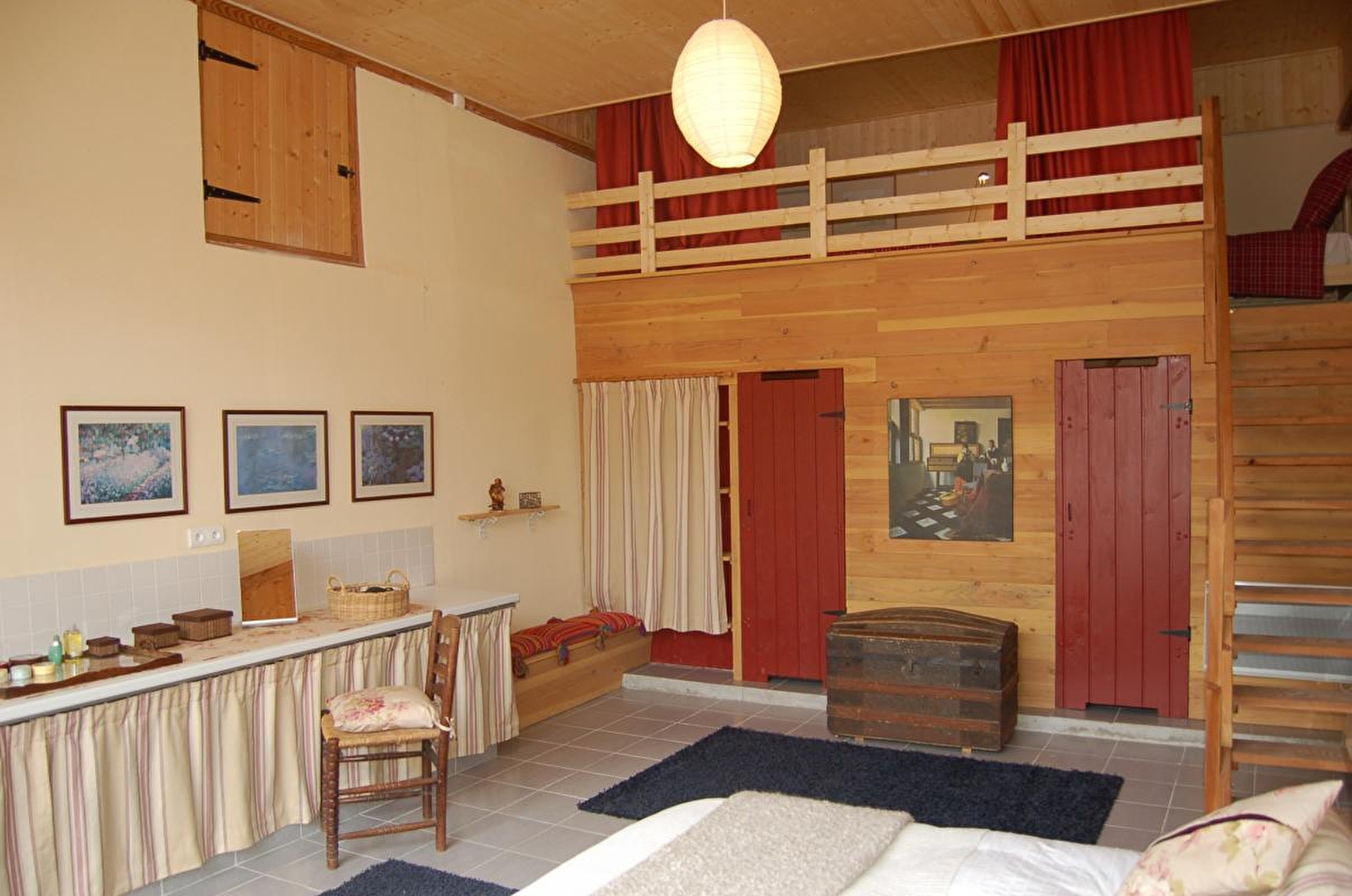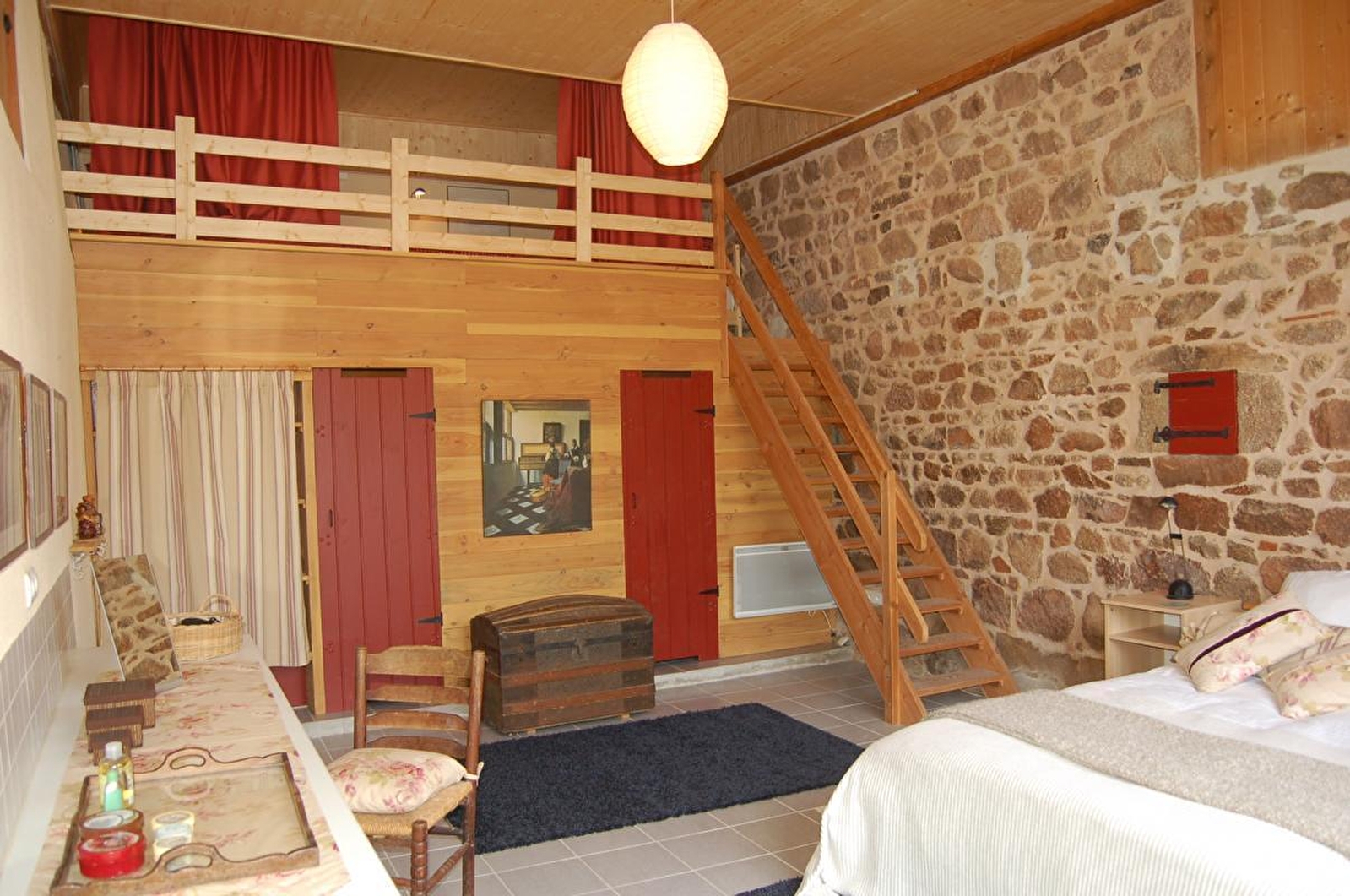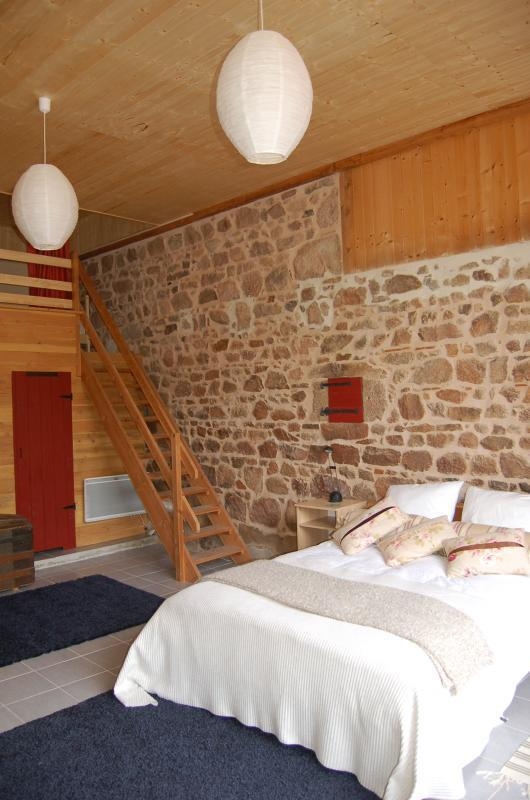 Composition : Maison individuelle voisinant maison propriétaire (totale indépendance). Wifi (fibre). Chauffage électrique. Lave-linge partagé (buanderie commune côté maison propriétaire). Rdc : cuisine, séjour-salon (canapé convertible 2 p. 140x190cm en appoint), chambre duplex avec mezzanine sous hauteur 1.79cm (lit 2 p. 160x200cm / 2 lits 1 p. 90x200cm) avec sdb privée (baignoire/Wc), salle d’eau (douche/Wc). Terrasse + terrasse abritée + parking privés. Jardin en commun (3000m²). Local vélos. Supérette 4.5 km. Petits commerces & mini supermarché 10 km.
