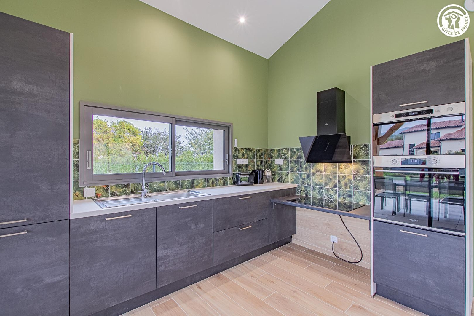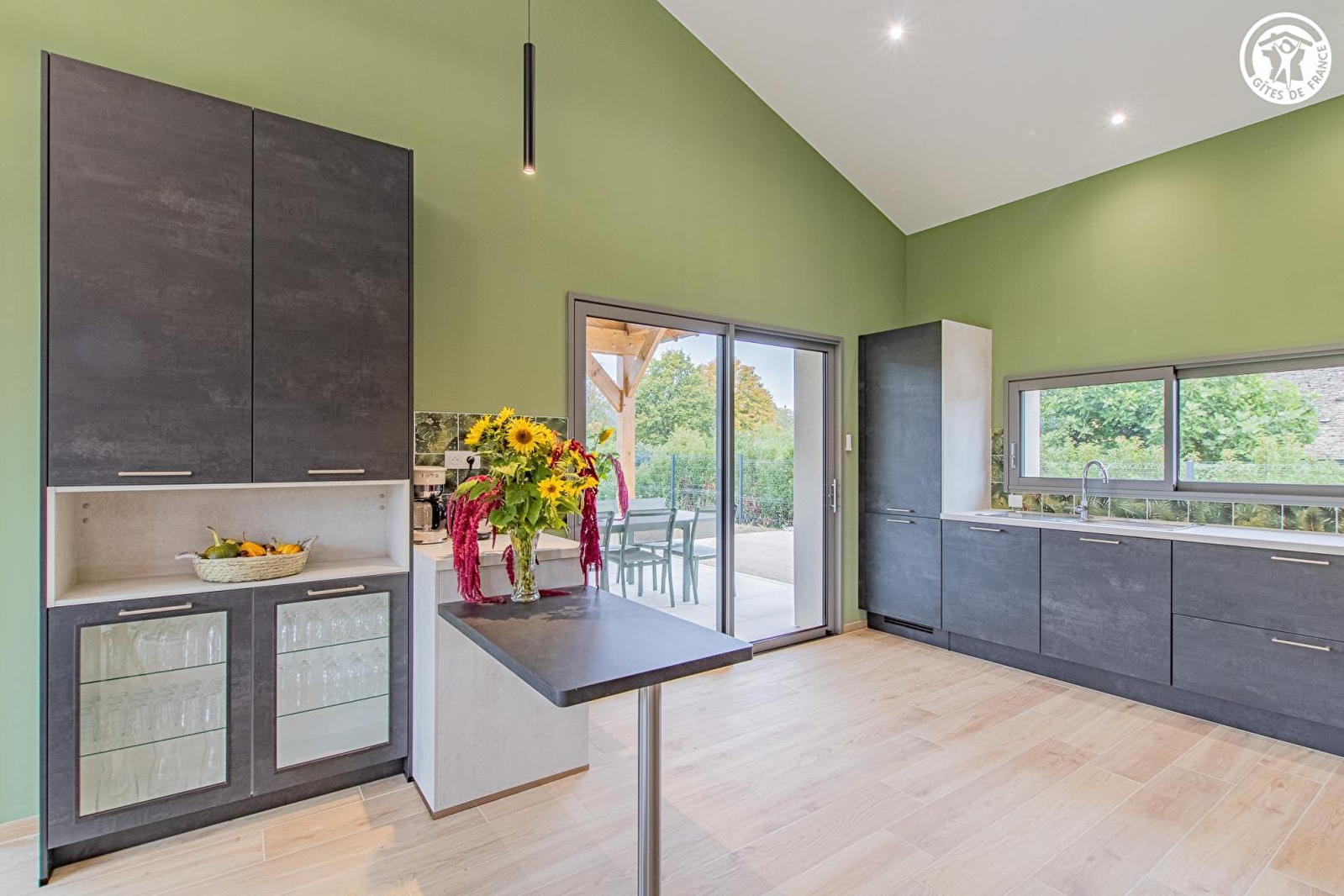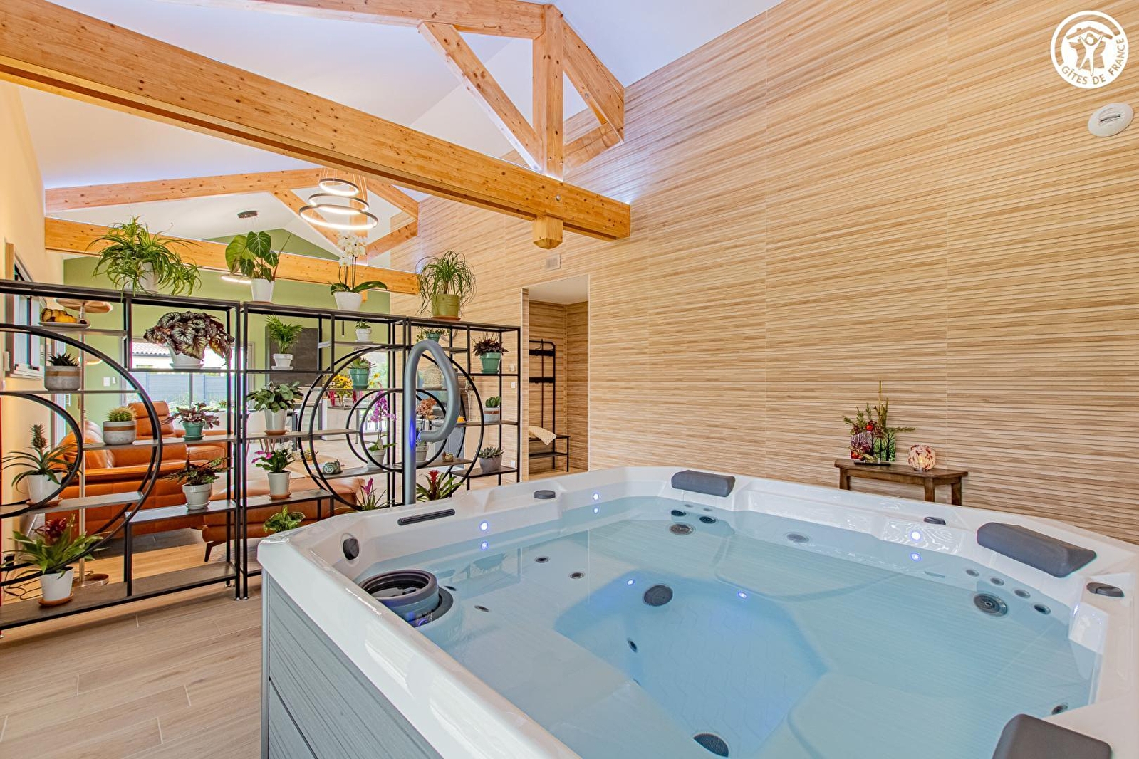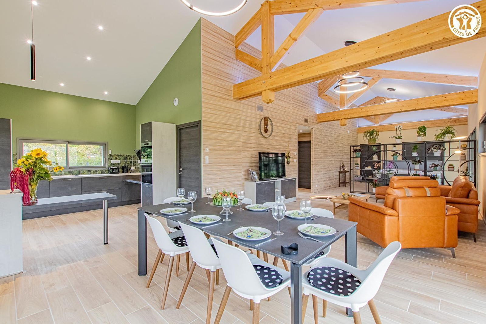 Composition : Maison individuelle. Wifi (fibre). Chauffage PAC. Climatisation. Gîte de plain-pied : séjour-cuisine-salon, 3 chambres (lit 2 p. 180x200cm / 2 lits 1 p. 90x200cm / 2 lits 1 p. 90x200cm superposés + 2 lits gigognes avec 1 lit 1 p. 90x200cm & 1 lit 1 p. 80x200cm) dont 1 avec salle d'eau PMR privée (douche/Wc), sde (douche), 2 Wc indépendants, buanderie. Spa intérieur (5 p.) + terrasse abritée (30m²) + jardin (1000m²) + local vélos + abri couvert voitures (3 pl.) privatifs. Petits commerces 5 km. Supermarchés 4.5 km.