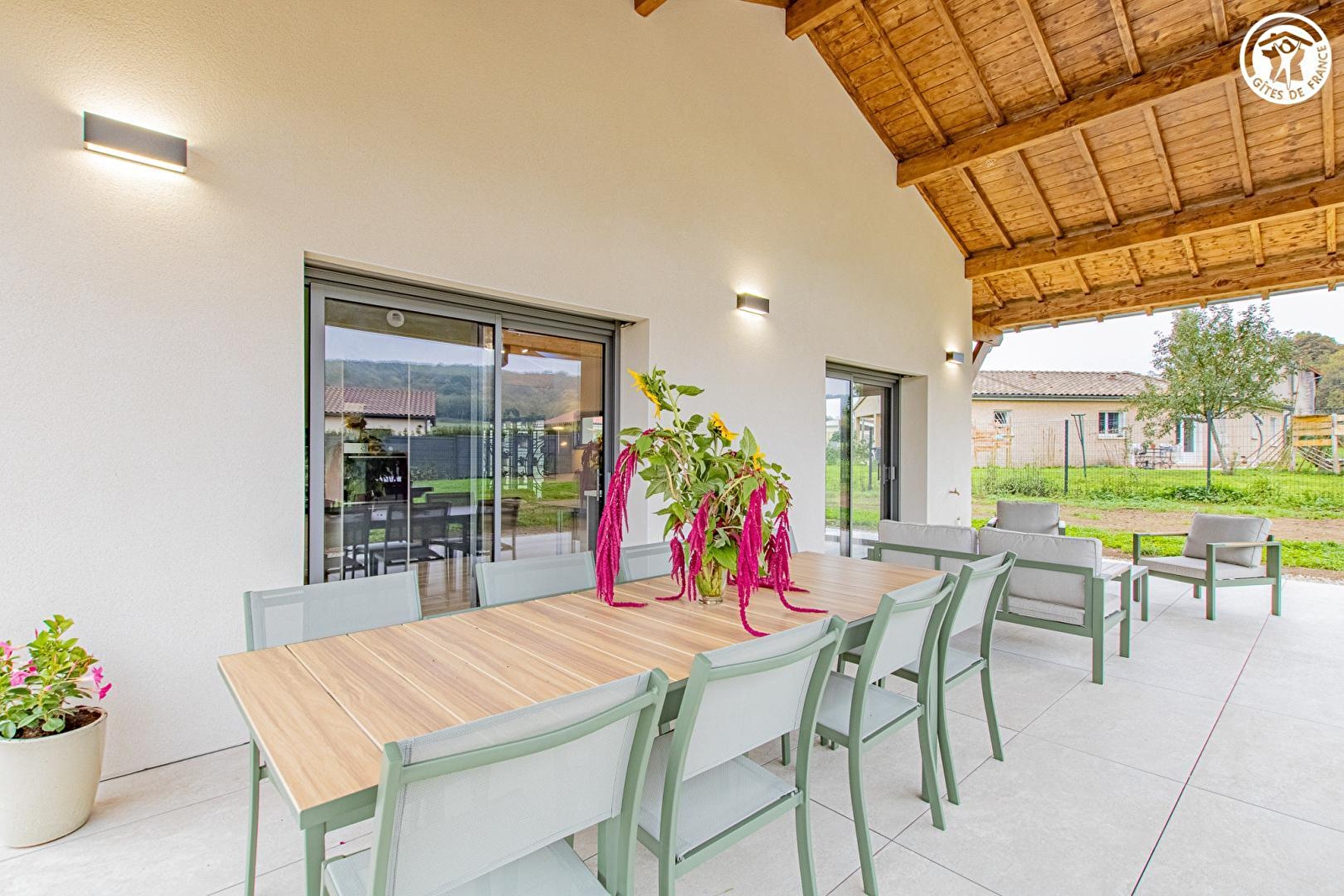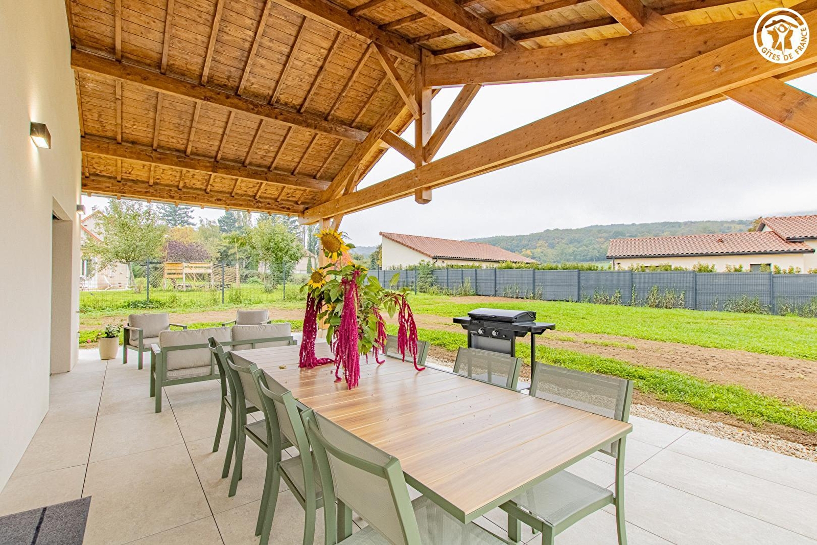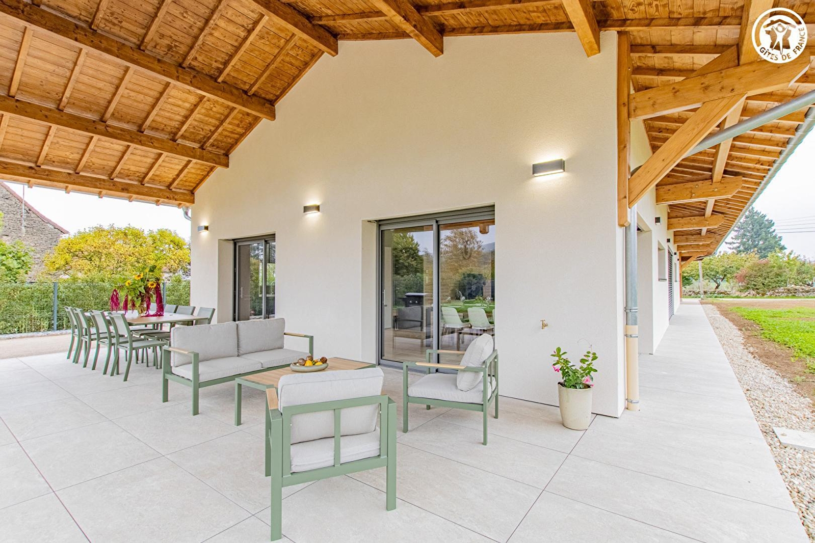 Belges d'origine et bourguignons de cœur & d'adoption (propriétaires de vignobles tout proche exploités en AOC Mâcon village / cépage Chardonnay), Isabelle & Étienne vous ouvrent les portes d'une très rare "maison passive" contemporaine d'avant-garde édifiée en 2025 ("éco-construction" littéralement exceptionnelle autonome à 90%), nichée au cœur d'un paisible hameau rural à deux pas des vignes & prairies environnantes, aux confins d'un pittoresque petit village bourguignon blotti sous les collines boisées du massif Sud Bourgogne (vaste espace forestier sauvage à parcourir lors de relaxantes balades à pied ou VTT, offrant de splendides vues panoramiques jusqu'au Mont Blanc par temps clair !). Calme & tranquillité en pleine douce campagne tournugeoise, bucolique écrin préservé mixant viticulture, agriculture & pleine nature, protégé en ZNIEFF pour ses richesses faunistiques & floristiques (accolée à une vaste "Zone Natura 2000"). Somptueux sites & paysages à découvrir aux alentours. Gîte de grand confort. Spacieux & lumineux. Exceptionnelle pièce de vie de 73m² dotée d'un beau volume "cathédrale" abritant un spa 5 places, une très insolite cave "télescopique" !) & une atypique mini "bibliothèque de plantes vertes". Très élégant cachet contemporain. Ambiance zen & très douce. Cosy & douillet. Terrasse abritée (40m²) sous un imposant auvent ouverte sur un jardin engazonné de 1000m², complétés par une grande cour, parfait terrain de pétanque.