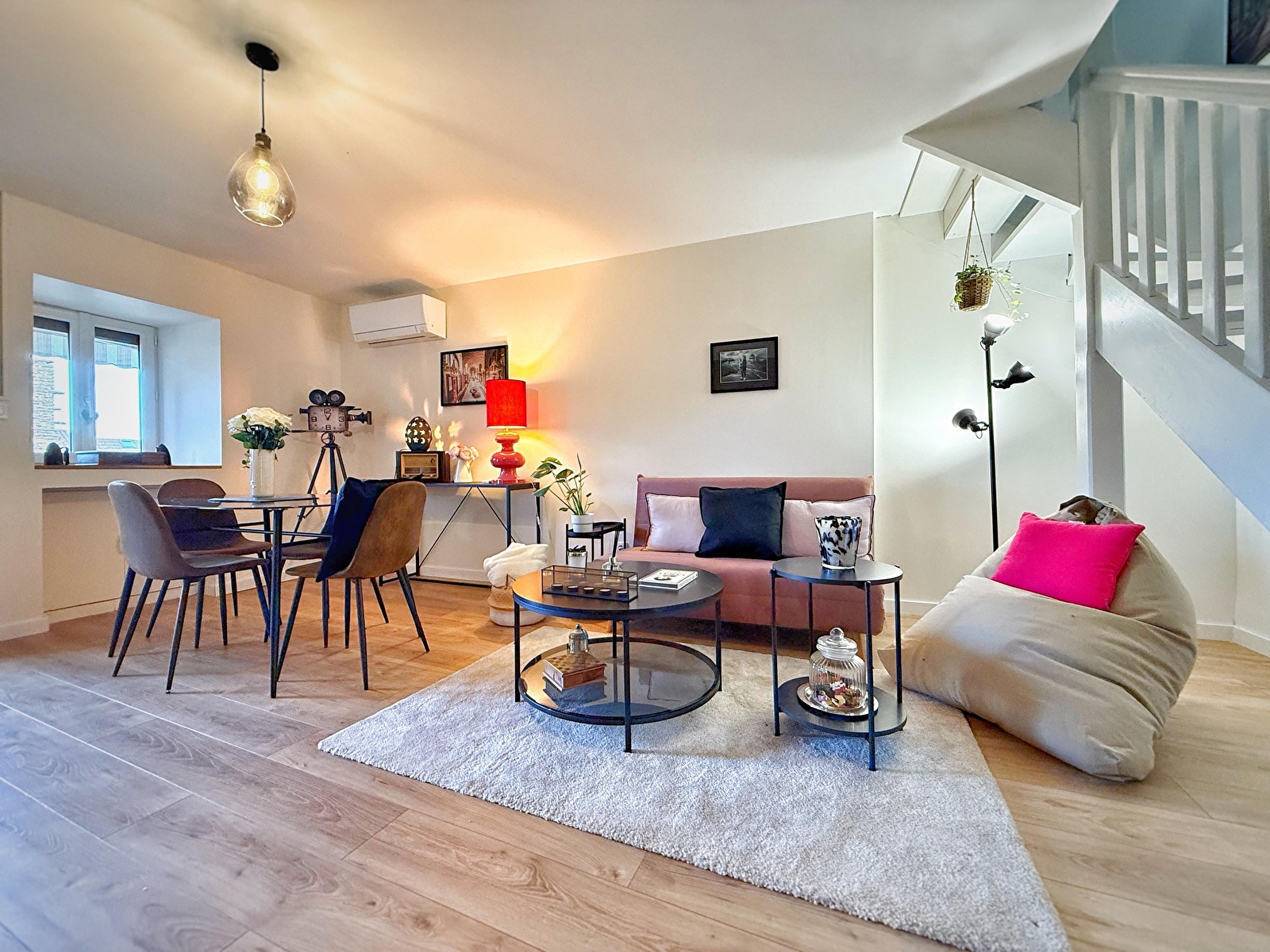 Charmante maison en pierre sur cave entièrement rénovée et climatisée de 50m² comprenant petite une terrasse, un salon avec un canapé lit 140 cm, une salle à manger, une cuisine équipée, une salle de douche et un WC et une chambre en mezzanine avec un lit 160 cm