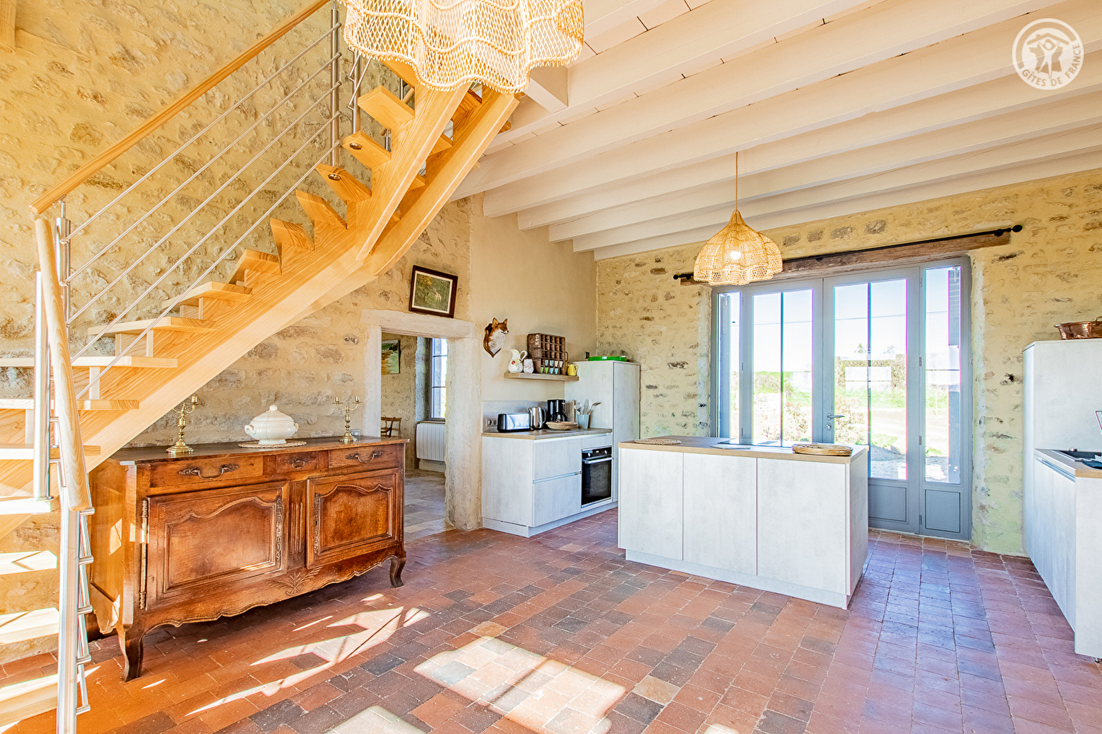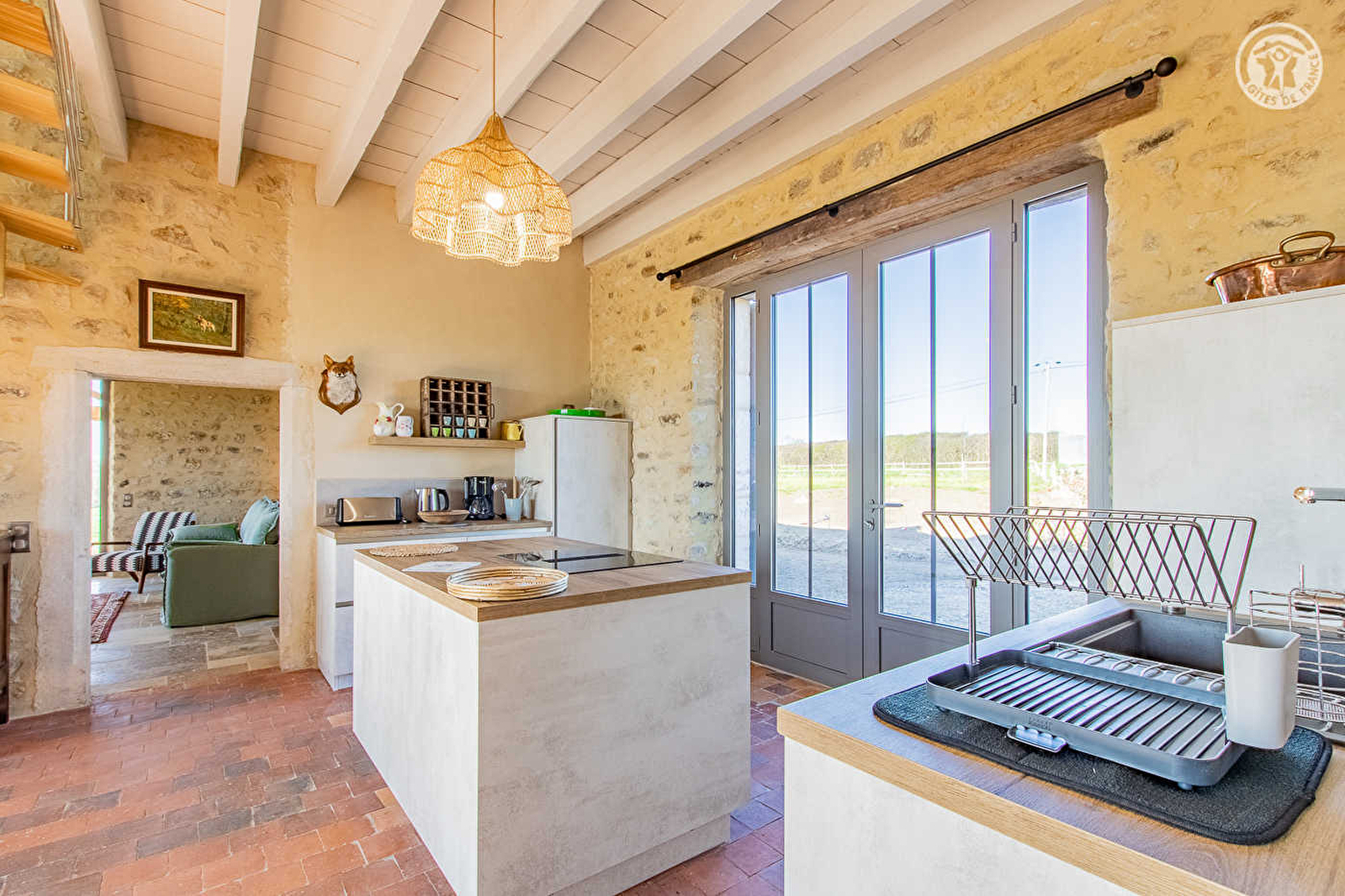 Composition : Maison individuelle sur 2 niveaux. Wifi. Chauffage PAC. Double poêle à bois. Climatisation à l'étage. Rdc : séjour-cuisine, salon, chambre (lit 2 p. 160x200cm) avec salle d'eau privative "ouverte" (douche/WC), Wc indépendant. 1er étage : vaste mezzanine/espace salle de jeux, 3 chambres (2 lits 1 p. 90x190cm / lit 2 p. 160x200cm / 2 lits 1 p. 90x190cm) dont une avec salle de bain privative "ouverte" (douche + baignoire + WC), salle d'eau (douche), Wc indépendant. Terrasse abritée + cour + jardin + local vélos + parking privatifs. Supermarché à 10 km. Toutes commodités 15 km. Gare 25 km.