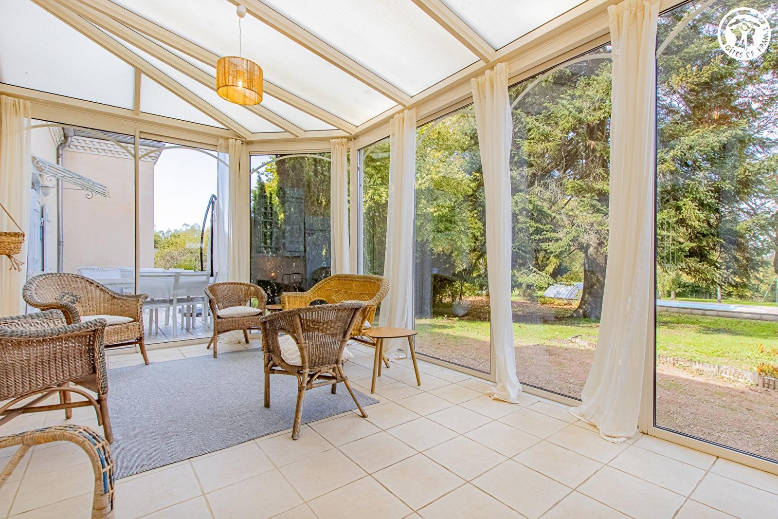 Élégante demeure bourgeoise de caractère fin XIXe, parée d'une vaste véranda, soigneusement réhabilitée & chargée d'histoire (jadis maison de l'intendant du château voisin), nichée à deux pas du cœur d'un petit village bressan typique en lisière de route & prairies, sur une exceptionnelle intimiste propriété close de 9000m² blottie à l'abri des regards derrière une barrière végétale boisée. Agréable douce campagne alentour préservée, parsemée d'étangs & rivières (protégée en ZNIEFF pour ses richesses faunistiques & floristiques), conjuguant champs, prairies bocagères & forêts sauvages, non loin des rives de la Saône (paradis des pêcheurs & autres kayakistes, espace naturel protégé en "Zone Natura 2000" pour ses rares écosystèmes). Gîte de très bon confort. Ultra spacieux. Chaleureux cachet campagnard un brin "vintage". Ambiance douillette sublimée par l'historique âme des lieux (superbe charpente, poutres, escalier en bois, manteaux de cheminée en marbre, briques, magistral manteau de cheminée en pierres & briques... d'époque). Énormément de charme. Agréable large terrasse ouverte sur un magnifique vaste parc engazonné peuplé d'arbres centenaires, soigneusement végétalisé & fleuri, doté d'une piscine (abritable sous dôme) & d'un terrain de pétanque.