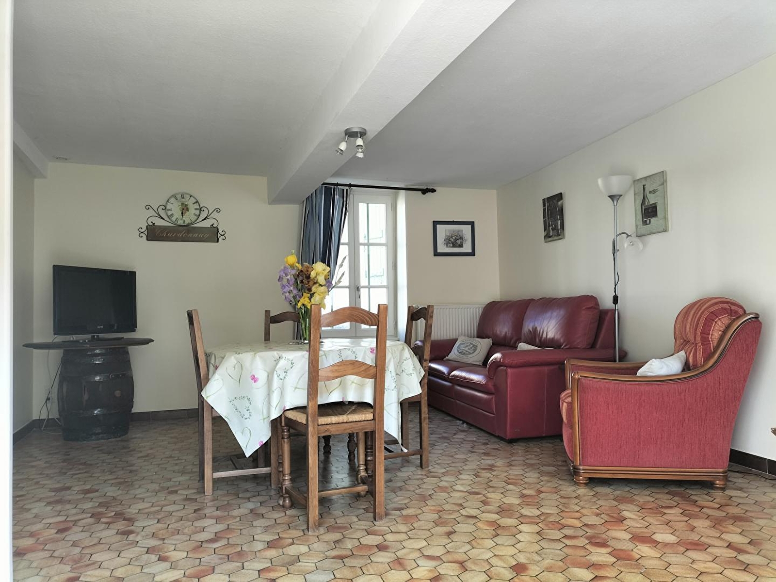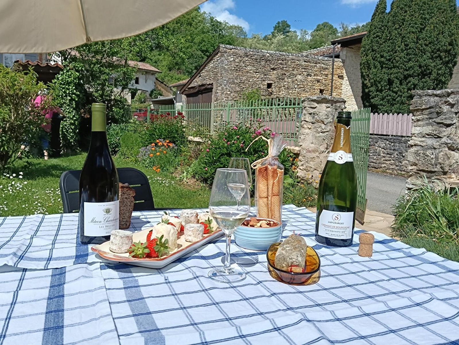 Viticultrice retraitée, Martine vous accueille au sein d'une authentique demeure traditionnelle du XIXe intégralement restaurée, chargée d'histoire (ancienne "métairie"), blottie en bordure de ruelle au cœur d'un paisible hameau viticole pétri de charme & parfaitement préservé, cerclé de vignes, sis à 3 km du bourg typique de Chardonnay, berceau historique du mythique cépage éponyme mondialement connu (élégante église romane classée du XIIe, manoir du XIIe ancienne dîme des moines bénédictins de l'abbaye Saint-Philibert de Tournus, dolmen néolithique "pierre de légende" classé au titre des Monuments historiques…). Calme & tranquillité en pleine campagne vallonnée du haut mâconnais (protégée en ZNIEFF pour ses richesses faunistiques & floristiques), niché sur un plateau exposé au creux d'un bucolique vallon de vignobles, prairies & forêts, sur les contreforts du massif Sud Bourgogne (vaste espace sauvage parsemés de sentiers pédestres & circuits VTT balisés de tous niveaux, offrant de splendides belvédères panoramiques jusqu'au Mont-Blanc par temps clair !). Cadre paysagé alentour de toute beauté. 100% reposant. Spacieux gîte de bon confort. Dépaysant cachet campagnard un brin "vintage", dialoguant avec quelques traces du bâti d'origine (poutres, manteau de cheminée en pierre & en marbre). Large terrasse exposée & ombragée (sud-ouest) ouverte sur un très agréable jardin clos de 150m², soigneusement végétalisée & très fleuri, doté en bonus d'un mini "jardin aromatique" (en bac).