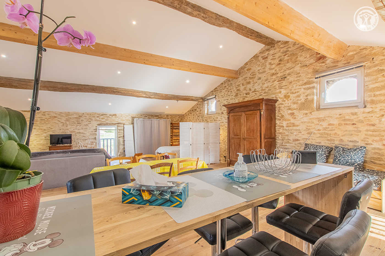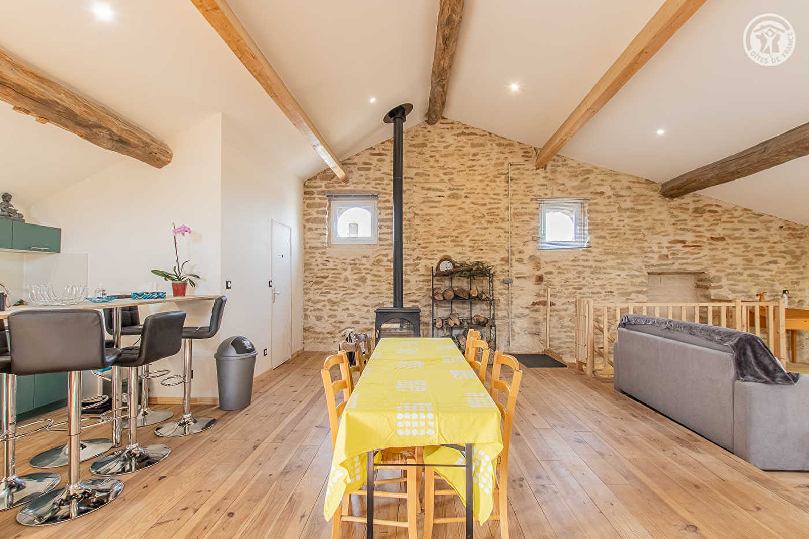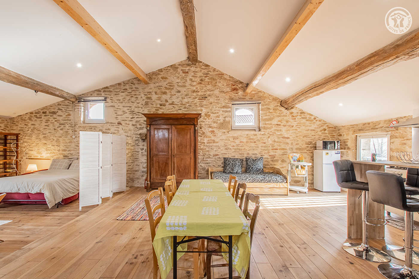 Fabienne, professeur de yoga (séances personnalisées sur place possibles sur demande) & Stéphane (passionné de sports & "fitness"), vous ouvrent les portes d'une authentique dépendance viticole & agricole du XIXe blottie en lisière d'une petite vigne, au cœur d'un bourg viticole typique de la campagne mâconnaise (abritant une église romane classée du XIIe). Niché au pied de la célèbre Roche de Solutré labellisée "Grand Site de France" pour ses exceptionnelles richesses patrimoniales & paysagères (l'un des plus grands gisements préhistoriques d'Europe riche de 50 000 ans de présence humaine, offrant une superbe vue dégagée jusqu'au Mont-Blanc !), Davayé dispose d'un cadre viticole vallonné, immergé au cœur d'un immense plateau préservé de vignobles, proche de plusieurs massifs forestiers sauvages. Somptueux paysages & panoramas à découvrir aux alentours. Vaste atypique "loft à la campagne" lové sous les toits à l'endroit de l'ancienne grange. Très beau volume. Chaleureux cachet campagnard aux accents contemporain sublimé par une restauration patrimoniale soignée (conservation des riches traces du bâti d'origine : murs en pierres, linteaux en pierres & bois, poutres, originales fenêtres en "œil de bœufs" parées de briques…). Beaucoup de charme & caractère. Ambiance cosy & cocooning. Insolite & dépaysant. Agréable & spacieuse "terrasse sur cour" protégée des regards par l'ancien mur d'enceinte de la propriété. Table de ping-pong & pétanque possible côté cour.