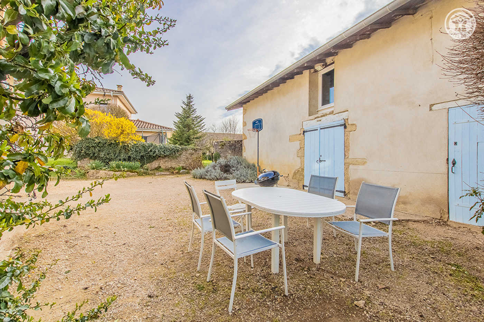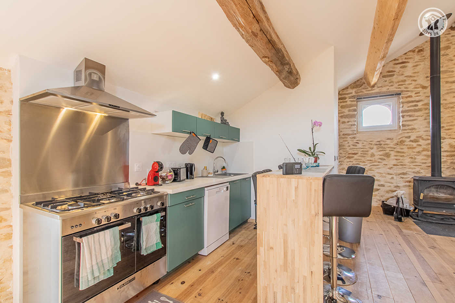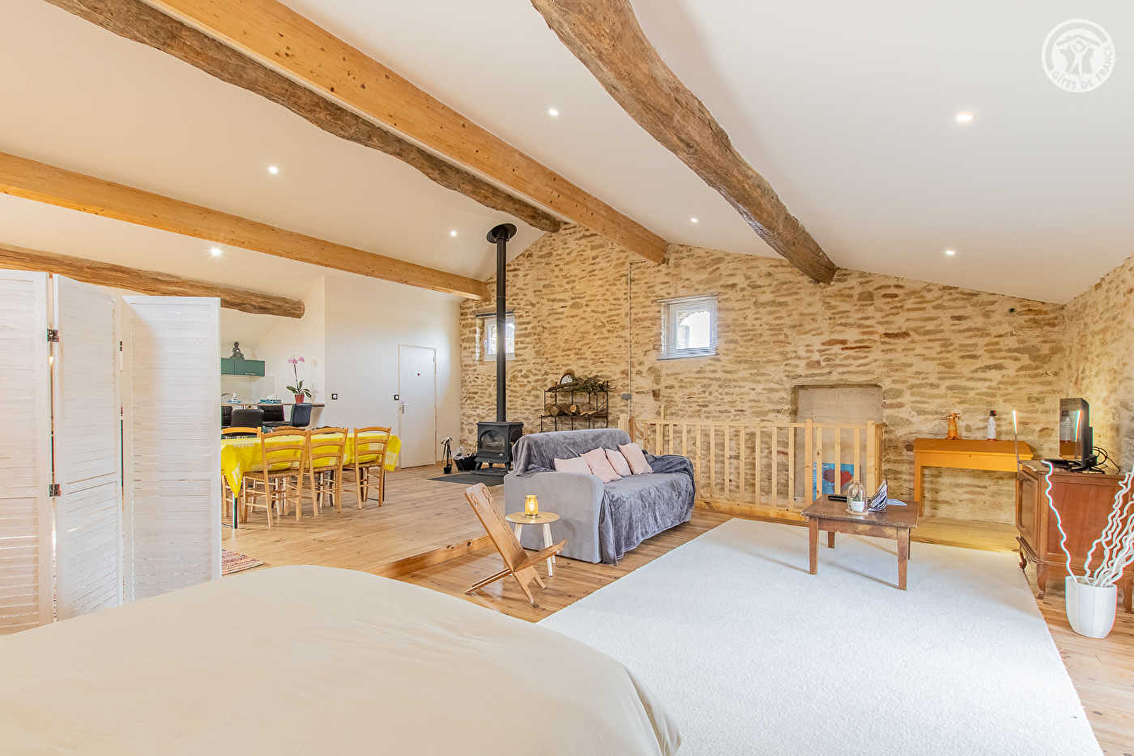 Fabienne, professeur de yoga (séances personnalisées sur place possibles sur demande) & Stéphane (passionné de sports & "fitness"), vous ouvrent les portes d'une authentique dépendance viticole & agricole du XIXe blottie en lisière d'une petite vigne, au cœur d'un bourg viticole typique de la campagne mâconnaise (abritant une église romane classée du XIIe). Niché au pied de la célèbre Roche de Solutré labellisée "Grand Site de France" pour ses exceptionnelles richesses patrimoniales & paysagères (l'un des plus grands gisements préhistoriques d'Europe riche de 50 000 ans de présence humaine, offrant une superbe vue dégagée jusqu'au Mont-Blanc !), Davayé dispose d'un cadre viticole vallonné, immergé au cœur d'un immense plateau préservé de vignobles, proche de plusieurs massifs forestiers sauvages. Somptueux paysages & panoramas à découvrir aux alentours. Vaste atypique "loft à la campagne" lové sous les toits à l'endroit de l'ancienne grange. Très beau volume. Chaleureux cachet campagnard aux accents contemporain sublimé par une restauration patrimoniale soignée (conservation des riches traces du bâti d'origine : murs en pierres, linteaux en pierres & bois, poutres, originales fenêtres en "œil de bœufs" parées de briques…). Beaucoup de charme & caractère. Ambiance cosy & cocooning. Insolite & dépaysant. Agréable & spacieuse "terrasse sur cour" protégée des regards par l'ancien mur d'enceinte de la propriété. Table de ping-pong & pétanque possible côté cour.