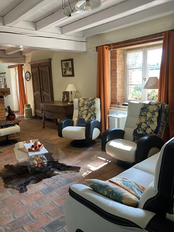 Composition : Maison individuelle. Wifi. Chauffage électrique. Cheminée (feu plaisir d'agrément). Rdc : séjour-cuisine, salon (canapé convertible 2 p. 140x190cm en appoint), salle d'eau (douche), WC indépendant. 1er étage : 2 chambres (2 lits 1 p. 90x190cm / 1 lit 2 p. 160x200cm), coin détente sur mezzanine. Terrain de 3000 m2 (jardin + cour) + terrasse couverte (35 m2) + terrain de pétanque naturel + ping-pong. Garage (1 place) + local vélos + parking privatifs. Commerces & services 12 km.