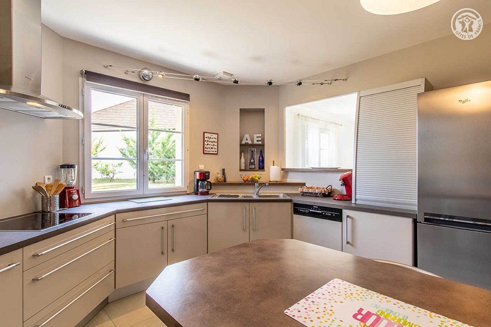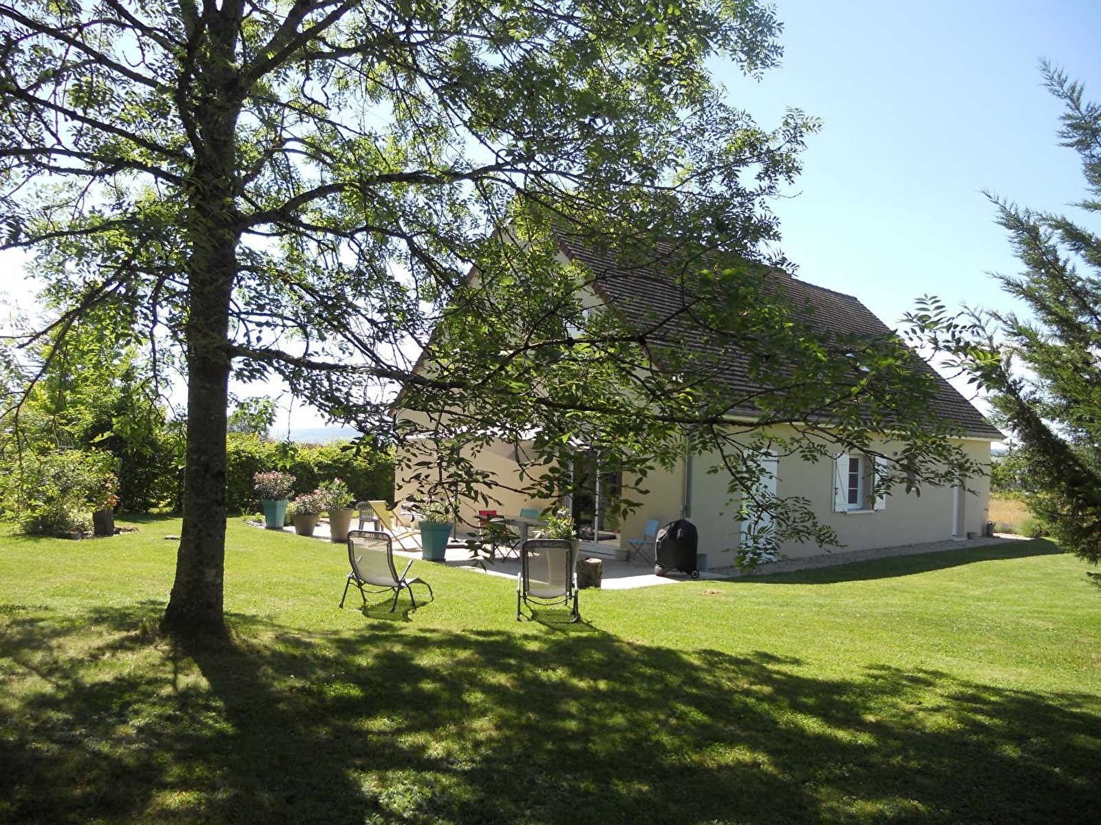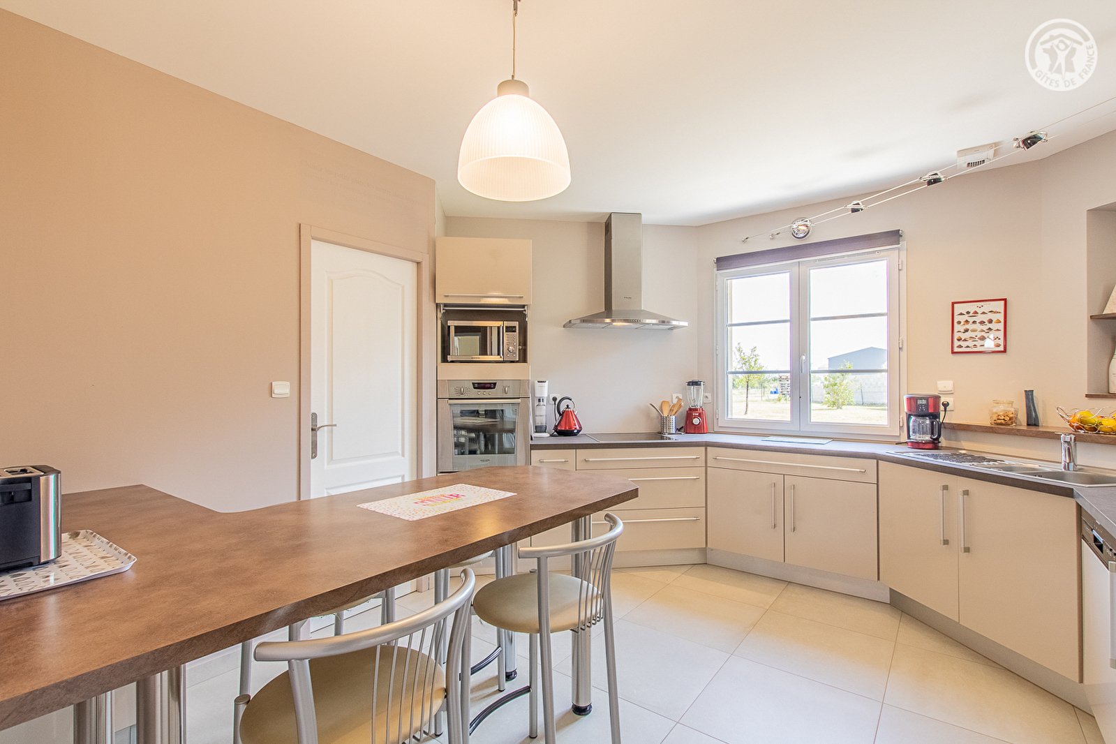 Robert & Jocelyne, nés et issus tous deux de vieilles familles Demignoises, vous accueillent au sein d'une élégante villa contemporaine de style de 2007, sise sur une vaste propriété privée de 4 ha en grande partie « naturelle ». Hameau résidentiel calme jouxtant le cœur d'un paisible charmant ancien village viticole typique & commerçant des Côtes Chalonnaises (pont à cinq arches, église du XVème siècle, somptueux château du XVIIe style directoire abritant un musée de la vénerie, nombreuses maisons de caractère… à découvrir). Au creux d'un agréable & reposant cadre rural préservé, en lisière immédiate de champs & prairies, blotti en pleine campagne vallonnée sur un plateau exposé face aux majestueux coteaux de vignobles des célèbres grands crus de Bourgogne sculptant l'horizon. Magnifique panorama & paysages. Vaste et belle propriété de 1700m² - soigneusement engazonnée, végétalisée et arborée - parfaite « aire de jeux » & terrain de foot pour le plaisir des petits & grands, disposant d'une large terrasse (exposée & ombragée) et d'une grande cour en gravier (appréciable terrain de pétanque naturel !). Gîte de très bon confort. Ultra spacieux & lumineux. Chaleureux cachet campagnard entre traditions et modernité alliant ambiance « bourgeoise » cossue & raffinée et esprit résolument contemporain. Douce atmosphère zen & cosy. Beaucoup de charme. Équipement complet de qualité.