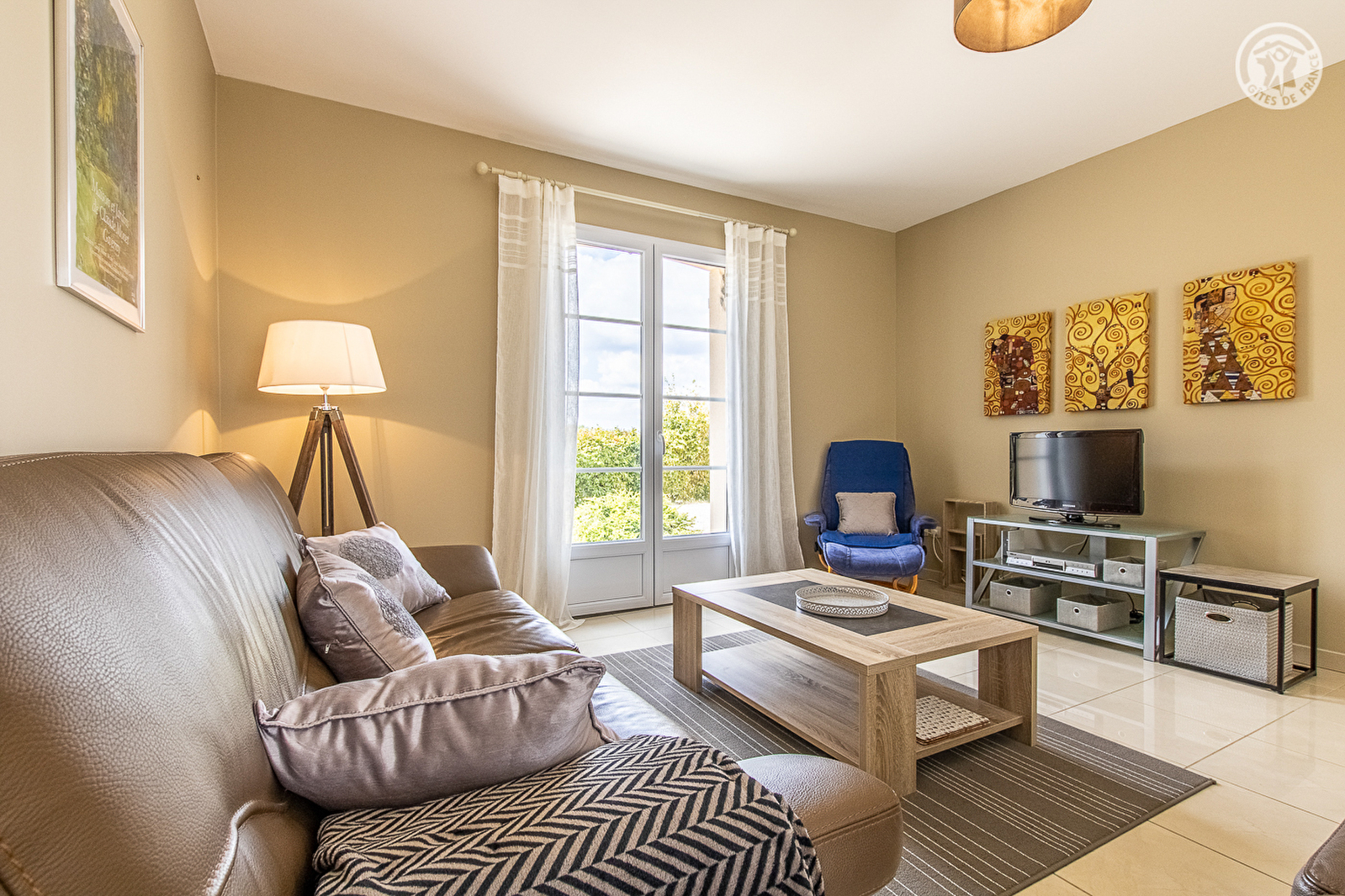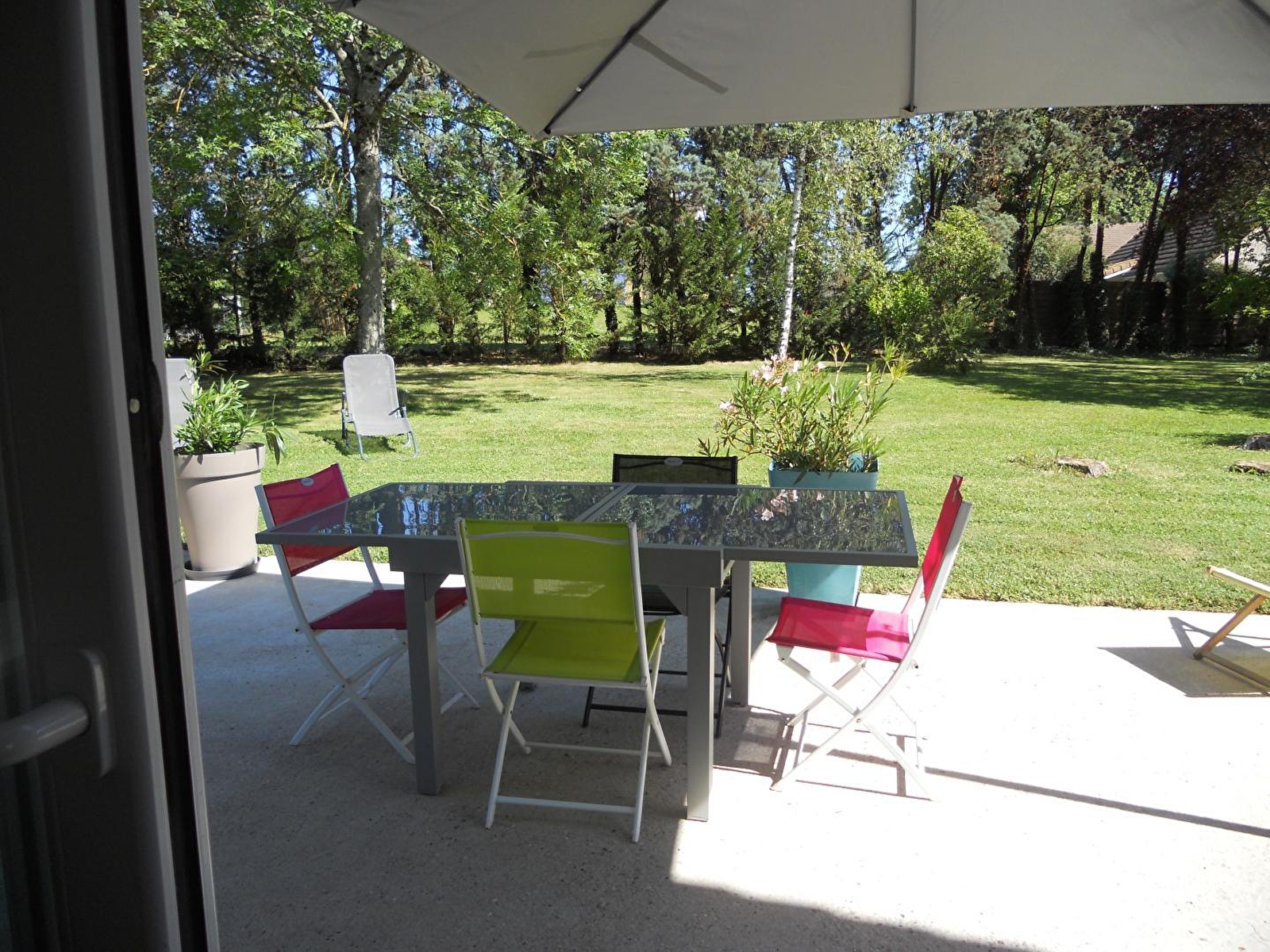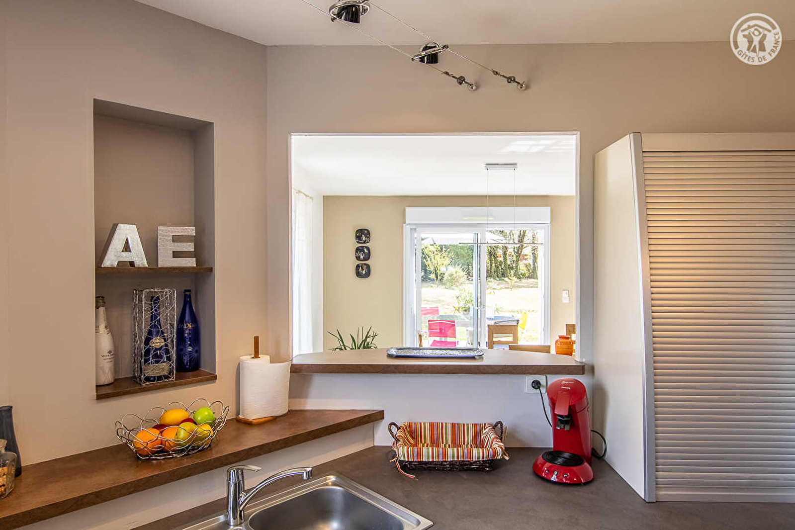 Composition : Maison individuelle sur 2 niveaux jouxtant l'habitation des propriétaires (indépendance totale sans vis-à-vis). Wifi. Chauffage électrique. Rdc : cuisine, séjour-salon, chambre (lit 2 p. 160x200cm) avec salle d'eau privative (douche), WC indépendant. 1er étage : 3 chambres (lit 2 p. 140x190cm / 2 lits 1 p. 90x190cm / lit 1 p. 100x200cm), sdb (baignoire/WC). Terrain (1700m²) + terrasse + garage + local vélos + parking privés. Commerces et services 7.5 km.