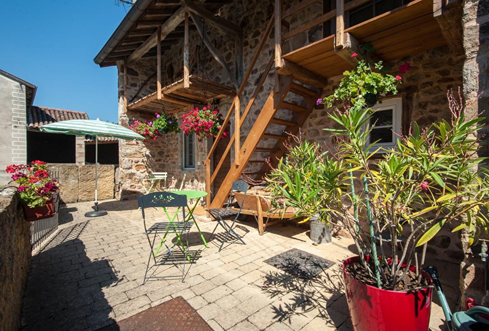 Michel (né dans le hameau) & Geneviève vous ouvrent les portes d'un authentique & très élégant corps de ferme traditionnel de caractère du XVIIIème siècle, pétri d'histoire & restauré dans les règles de l'art, blotti au calme en lisière de pâture accueillant en saison de paisibles agneaux & brebis (sans nuisance). Totale tranquillité au cœur d'un mini hameau rural typique, parfaitement réhabilité, lové à flanc de coteau sud exposé au creux d'un ravissant écrin préservé de nature & verdure, sur un vaste plateau "ouvert" de bucoliques prairies bocagères dominant la verdoyante vallée de la Grosne, adossé aux collines boisées du massif Sud Bourgogne accessibles à deux pas (nombreux sentiers balisés, à parcourir à pied ou VTT lors de reposantes balades). Véritable petit coin de paradis pour petits & grands aux confins de la douce campagne vallonnée du Haut Clunisois (territoire protégé en "Zone Natura 2000" & ZNIEFF pour ses riches écosystèmes faunistiques & floristiques). Cadre & site absolument ressourçant et enchanteur. Splendides paysages et vue panoramique sur la campagne environnante avec les monts du Clunisois, Mâconnais & Beaujolais s'affichant en toile de fond. Spacieux gîte de très bon confort. Chaleureux cachet campagnard aux accents contemporains sublimé par un magnifique escalier "colimaçon" en fer forgé (provenant d'une chapelle datant du XIXème), comme par les riches traces du bâti d'origine (murs en pierres, poutres & reconstitution du "séchoir"). Beaucoup de charme. Ultra douillet. Ambiance cocooning & cosy. Large terrasse close (exposée & ombragée), fermée par les fameuses "pierres levées" ayant donné leur nom à la maison.