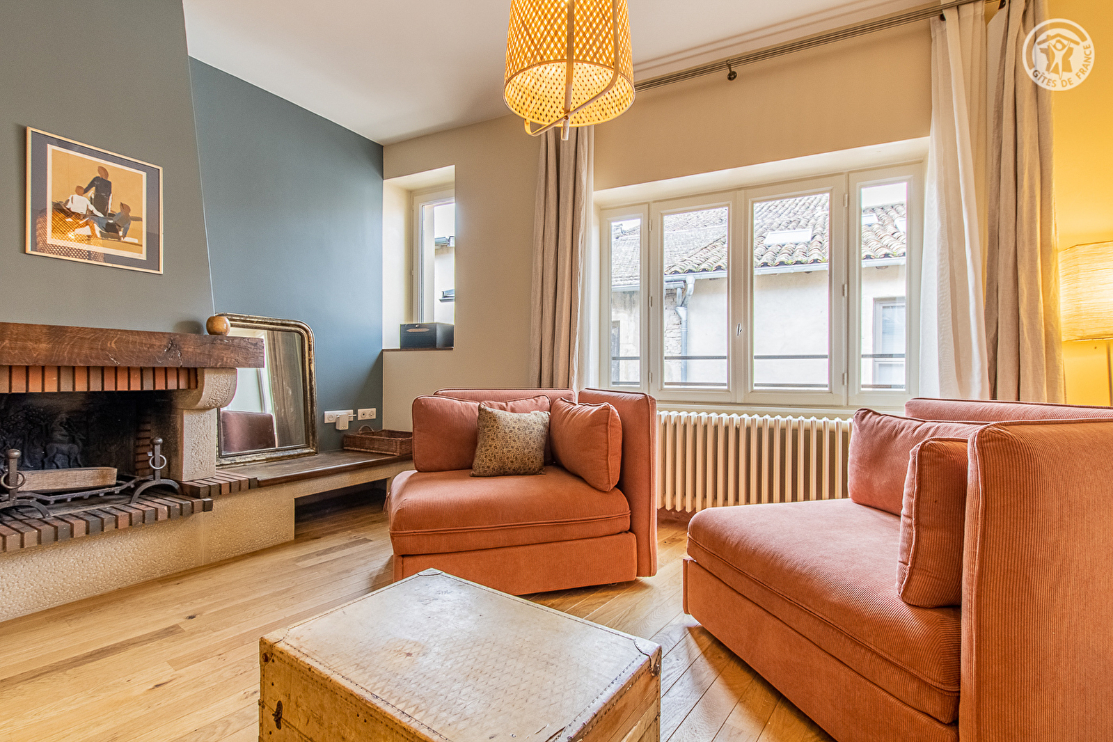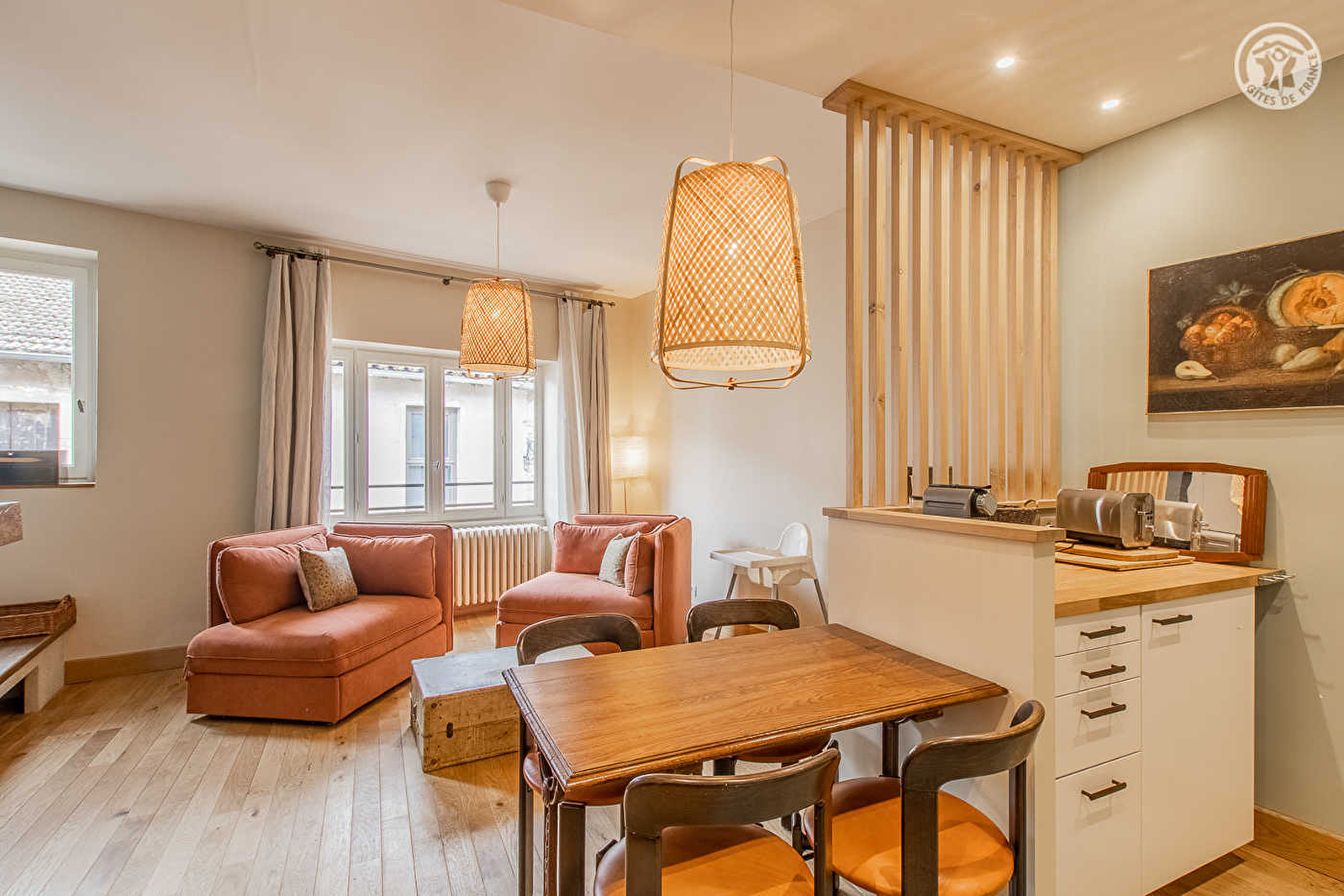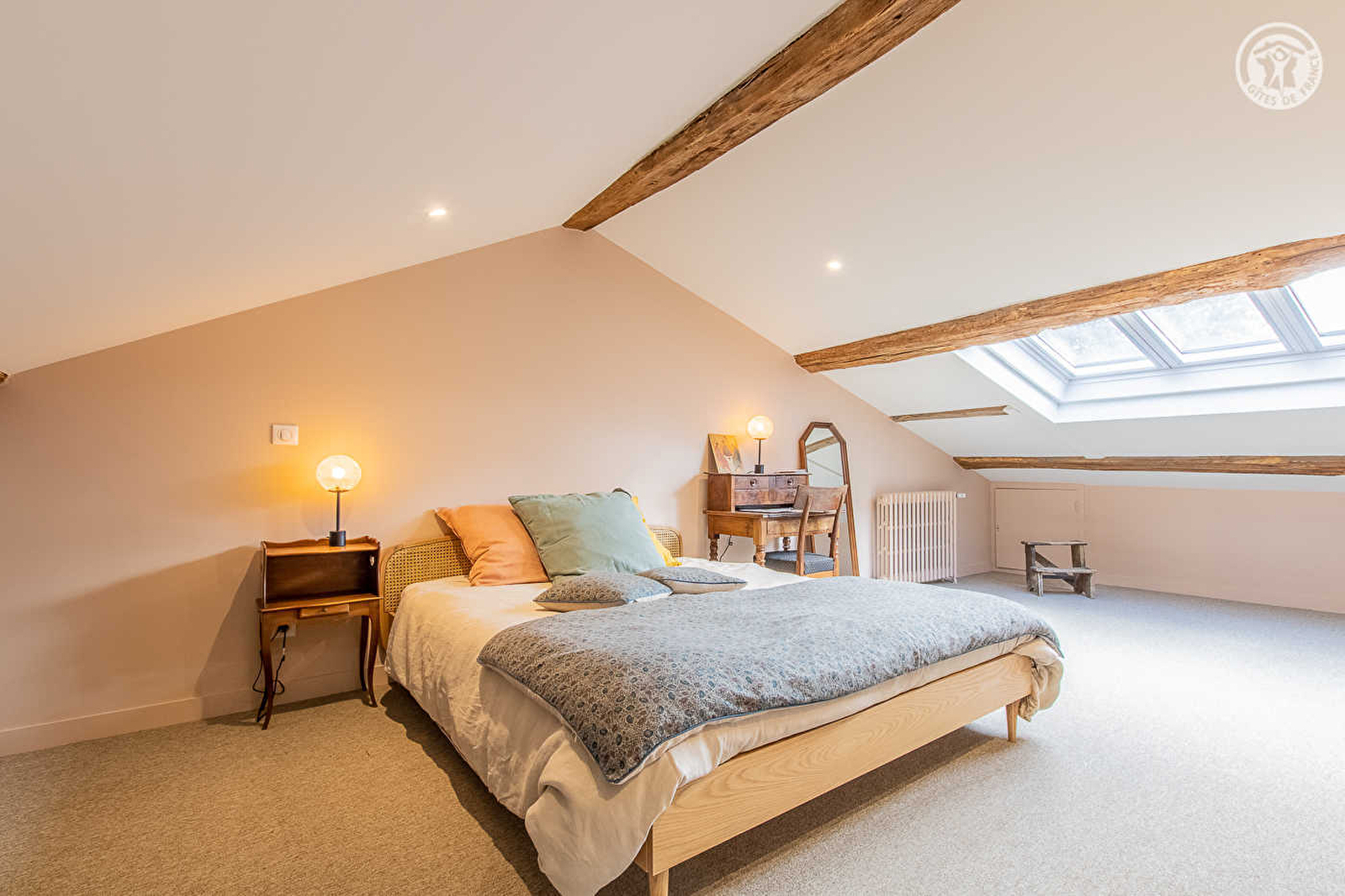 Authentique maison de bourg du XVIIème siècle, soigneusement restaurée & pétrie d'histoire, sise sur les toutes premières pentes de la ville, en toute bordure d'une charmante & paisible petite ruelle strictement résidentielle. Emplacement particulièrement privilégié blotti au calme au cœur même du centre historique de l'illustre bourg monastique, joyau patrimonial de réputation mondiale, à deux pas de l'intégralité des commerces & services. Lové sur les contreforts boisés du massif Sud Bourgogne entre deux vastes forêts domaniales sauvages, au creux de la bucolique vallée de la Grosne en grande partie protégée en « Zone Natura 2000 » pour son remarquable écosystème, cœur spirituel de l'Europe médiévale dotée du très rare et prestigieux label « Patrimoine Européen », Cluny dispose d'un inestimable patrimoine historique (exceptionnel site abbatial des Xe/XVIIIe, plusieurs tours médiévales dont la célèbre Tour des Fromages, nombreuses demeures romanes & gothiques, deux majestueuses églises, somptueux Hôtel-Dieu de 1703…) et jouit d'un superbe écrin préservé, alternance de coteaux de vignobles, bocages, collines boisées & rivières. Magnifique campagne alentours montueuse & vallonnée, riche de splendides panoramas & paysages, à découvrir lors de balades en pleine nature, à pied ou vélos. Gîte de très bon confort. Chaleureux cachet contemporain d'inspiration scandinave mixé à un esprit « brocante » soigné. Beaucoup de style & charme. Ambiance zen, douce & très cosy. Vaste chambre lovée sous les toits, sublimée par les poutres d'origine, offrant une belle vue sur le bourg dont l'abbaye et ses principaux monuments.