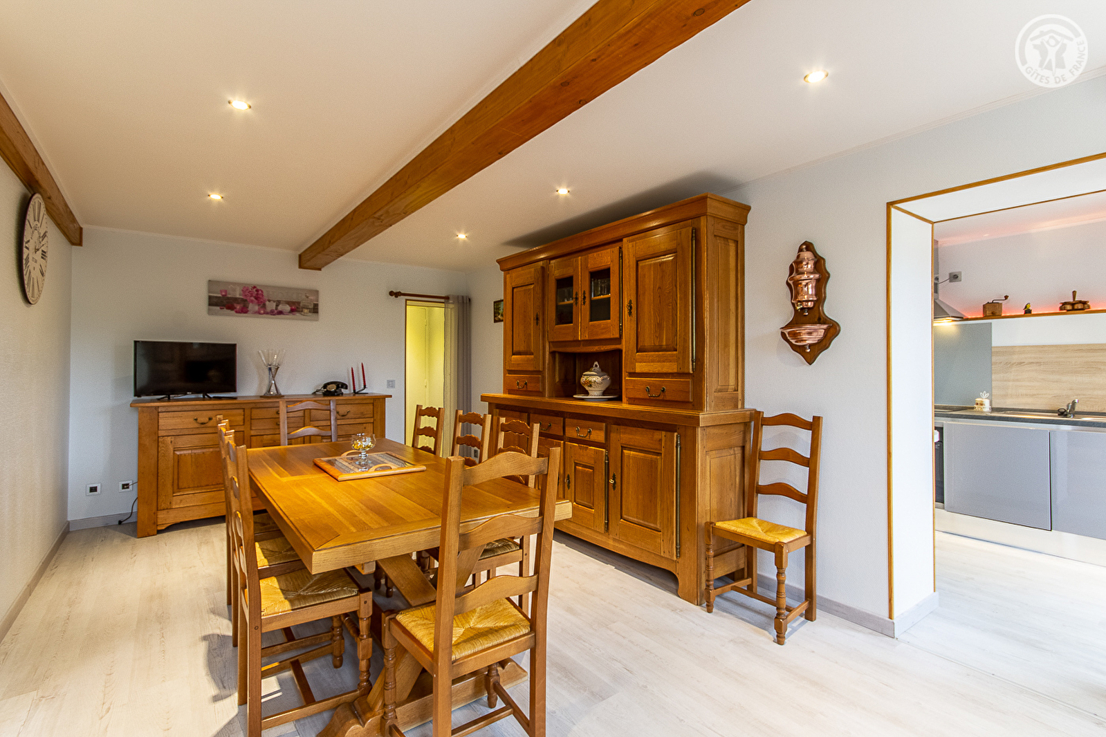 Composition : Maison individuelle. Wifi. Chauffage électrique. Buanderie indépendante (accès par extérieur). Rdc : Séjour-cuisine-salon (grande pièce ouverte délimitée en 3 espaces bien distincts), salle d'eau (douche multijets), wc indépendant. 1er étage : 3 chambres (lit 2 p. 160x200cm / lit 2 p. 140x190cm / lit 2 p. 160x200cm). Cour close privée avec terrasse en gravier. Spa 6 p. (fermé l'hiver du 01/10 au 31/03). Parking + local vélos fermé sécurisé privés. Toutes commodités à 15 km.