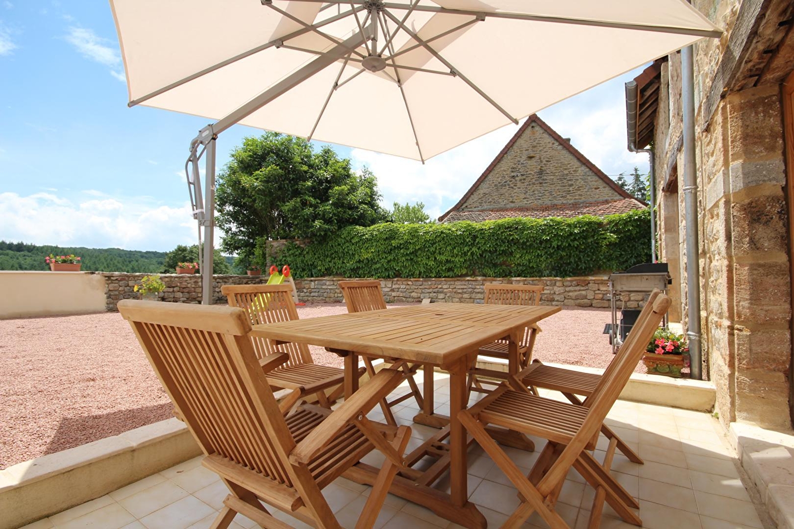 Nadine (ancienne guide équestre) vous accueille au sein d'une ravissante demeure traditionnelle de caractère du XIXe, chargée d'histoire & soigneusement restaurée (jadis atelier de "charronnerie" puis café-auberge de village), blottie au calme sur une vaste propriété naturelle de 3 ha abritant, en lisière du gîte, ses paisibles chevaux en "pâture". Quiétude & total tranquillité en pleine campagne charolaise préservée (protégée en ZNIEFF pour ses riches écosystèmes), lové au creux d'un petit hameau rural typique, sur un plateau vallonné de douces prairies bocagères parsemées de petites rivières (accueillant en saison les célèbres vaches charolaises), à deux pas d'une vaste forêt sauvage (à parcourir lors de relaxantes balades à pied ou VTT). Bucolique cadre champêtre & naturel alentour, littéralement enchanteur. Gîte de bon confort. Ultra spacieux. Grande pièce de vie. Chaleureux cachet campagnard un brin "vintage" (dont une belle cuisine "eighties") dialoguant avec l'âme totalement dépaysante des lieux (rénovation patrimoniale soignée : poutraisons, plafonds à la française & murs en pierres d'origine). Agréable pièce de détente nichée à l'endroit de l'ancienne salle du "bistrot", proposant baby-foot, billard & table de ping-pong. Terrasse exposée ouverte sur une large cour, littéral terrain de pétanque "naturel", dotée d'un ancien four à pain/pizza restauré (à disposition des hôtes). Superbe vue dégagée sur la campagne environnante. Magnifique panorama & paysages.