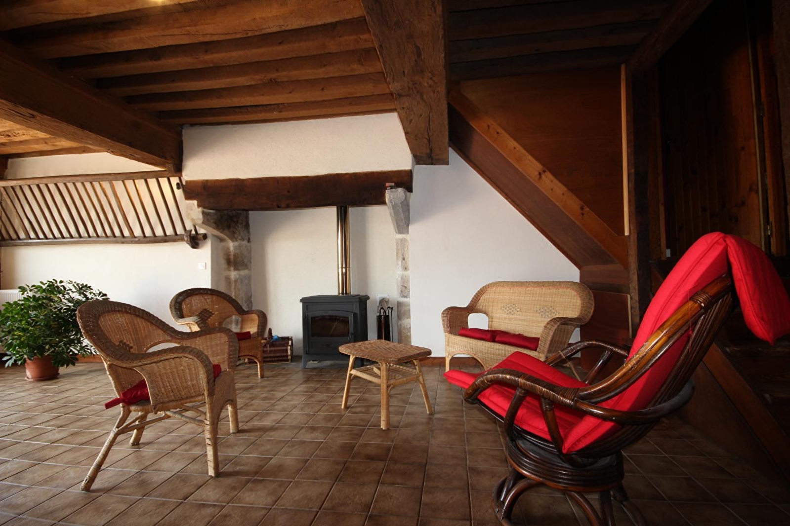 Composition : Maison individuelle jouxtant la maison de la propriétaire (totale indépendance). Wifi (fibre). Chauffage central gaz + poêle bois. Rdc : séjour-salon (canapé convertible 2 p. 140x190cm), cuisine, Wc indépendant, salle détente (baby-foot, billard, ping-pong). 1er étage : 2 chambres (lit 2 p. 140x190cm / 2 lits 1 p. 90x190cm), salle d'eau (douche), wc indépendant. Terrasse + cour + parking privés. Jardin commun. Accueil cavaliers possible (sans box). Petits commerces & supermarché à 9 km.
