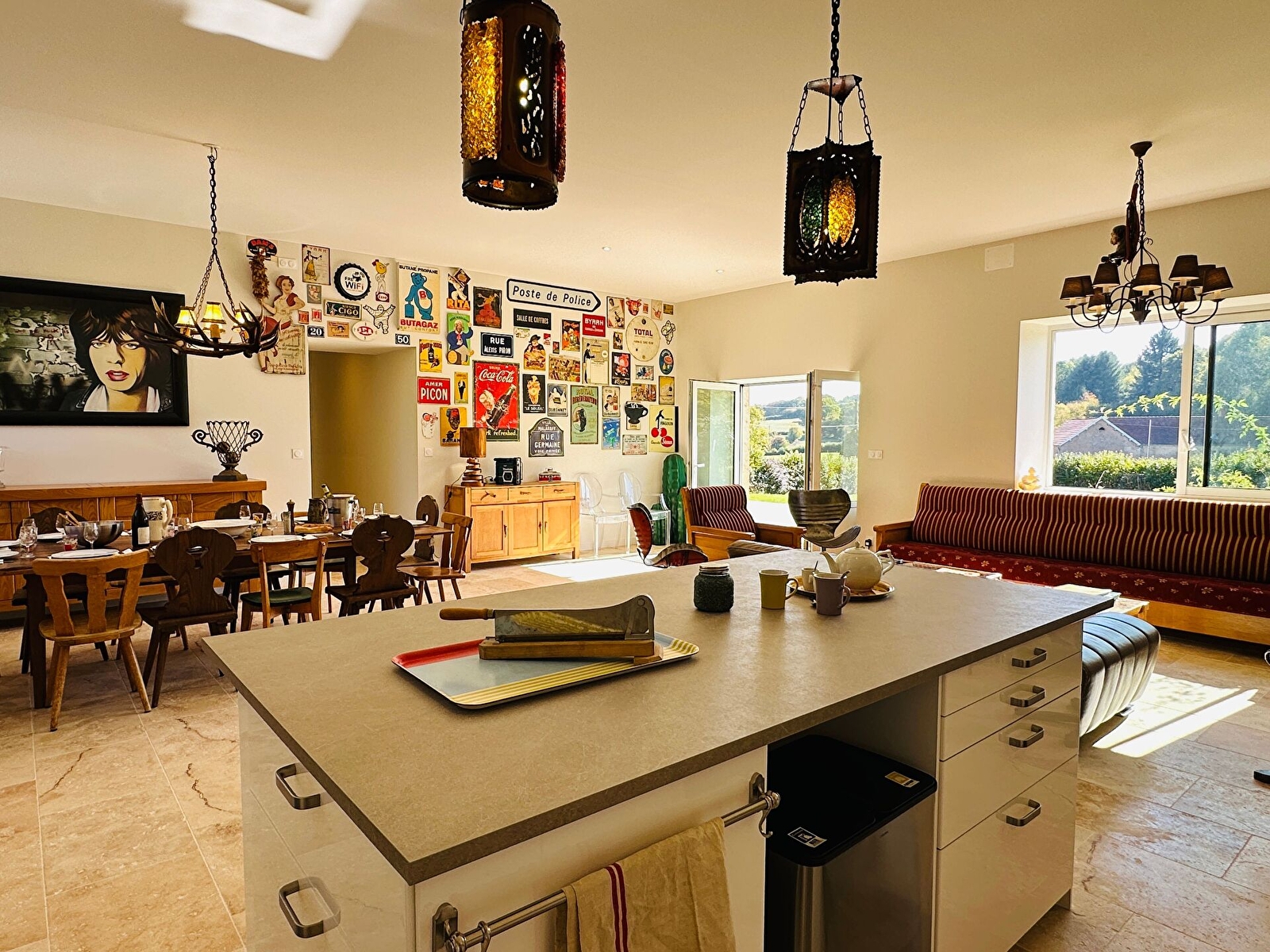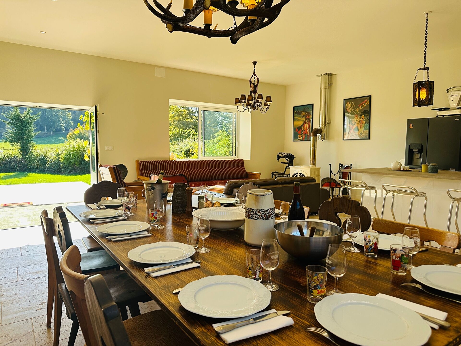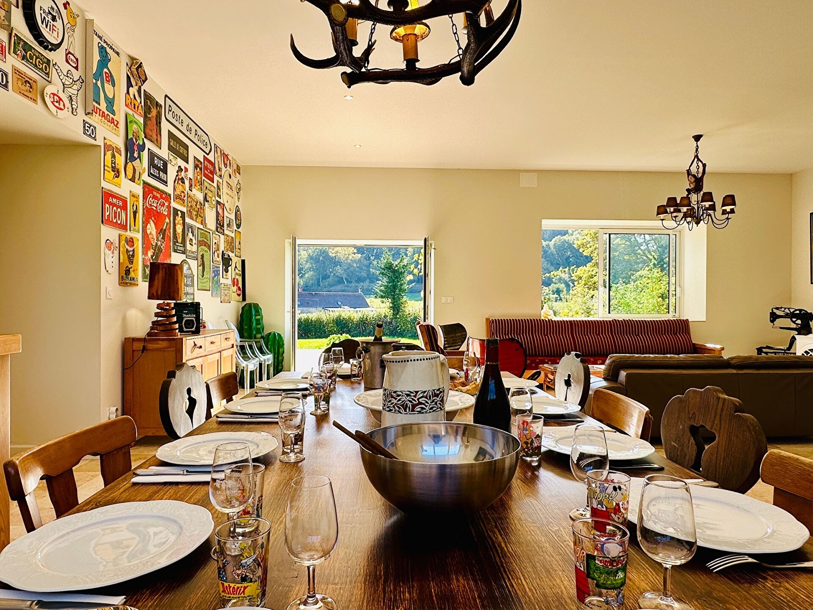 Une vaste pièce à vivre lumineuse et chaleureuse vous attend. Elle comprend une cuisine ouverte entièrement équipée, un espace repas convivial pour partager de bons repas et un coin salon avec un poêle à bois (bois fourni), parfait pour les soirées d’hiver. Cet espace offre un accès direct à une grande terrasse avec mobilier de jardin et barbecue charbon.