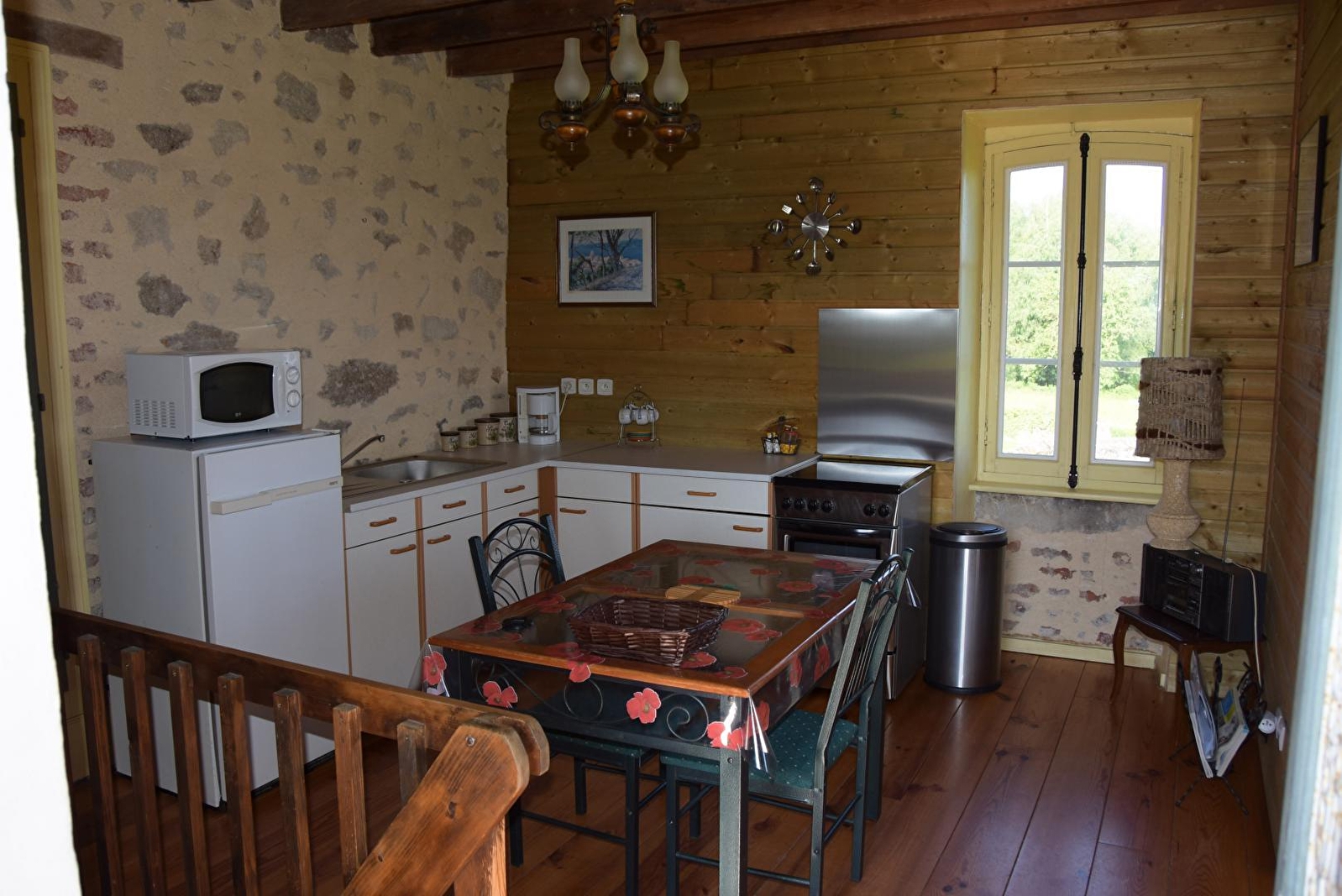 Composition : Maison individuelle voisinant la maison du propriétaire abritant une petite salle de réception (totale indépendance sans vis-à-vis). Wifi (fibre). Chauffage électrique. Lave-linge commun dans une buanderie partagée avec la salle de réception. Accès gîte par escalier extérieur. 1er étage : séjour-cuisine. Rdc : chambre (lit 2 p. 140x190cm), salle d'eau (douche/Wc). Balcon-terrasse + balcon + jardin + parking privés. Supermarchés 4 km. Toutes commodités 5.5 km.
