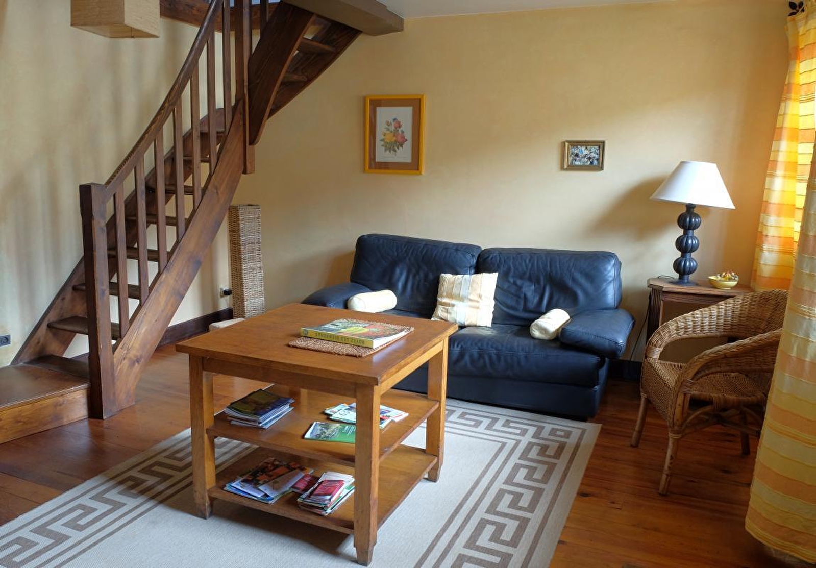 Composition : Maison de village mitoyenne. Accès : 100m chemin empierré carrossable. Wifi. Chauffage central gaz. Rdc surélevé (5 marches) : séjour-cuisine, salon (canapé d'appoint 2 p. 140x190cm), 1 chambre (lit 2 p. 160x200cm), sdb (baignoire), WC indépendant. 1er étage : salon TV, 2 chambres (2 lits 1 p. 90x190cm / lit 2 p.140x190cm + lits 1 p. 90x190cm), salle d'eau (douche/WC). Terrasse + balcon abrités + cour close + jardin clos (300m²) + parking privatifs. Toutes commodités dont supermarché 7.5 km.