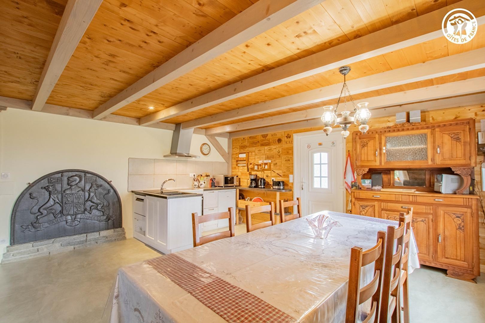 Lina vous ouvre les portes d'une authentique ferme bressane traditionnelle (ayant conservé sa façade d'antan), blottie en "belvédère" sur une mini colline dominant un vaste champ de culture à la lisière d'une petite forêt longée par une bucolique rivière poissonneuse. Totale tranquillité, niché au sein d'un petit hameau rural dispersé en pleine campagne bressane, au creux d'un apaisant écrin préservé de nature & verdure (protégé en ZNIEFF pour ses richesses faunistiques & floristiques), à deux pas d'une vaste forêt sauvage parsemée de grands étangs (protégés en "Zone Natura 2000" pour leurs exceptionnels biotopes, notamment ornithologiques, car abritant des espèces très rares). Cadre 100% apaisant. Littéral havre de paix & repos. Possibilité d'observer la faune sauvage (chevreuils, lièvres, renards, faisans…). Gîte de bon confort. Vaste pièce de vie où trône une authentique & magistrale plaque de cheminée médiévale en fonte avec "armoiries". Chaleureux cachet mixant ambiance campagnarde aux touches contemporaines & esprit montagnard boisé. Cosy & douillet. Belle propriété fleurie & très soignée de 1500m² (engazonnée, arborée & végétalisée) dotée d'une belle terrasse panoramique, d'un petit bassin, d'un "mini" jardin aromatique (à disposition des hôtes) comme de divers petits espaces aménagés de détente & repos. Belle vue dégagée sur la campagne environnante & la chaine du Jura en toile de fond.