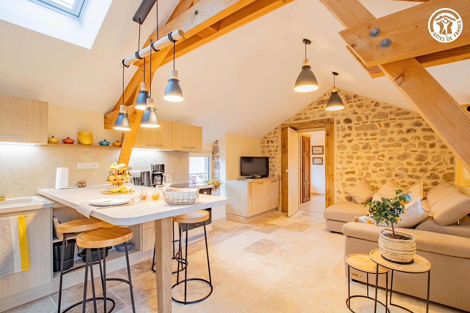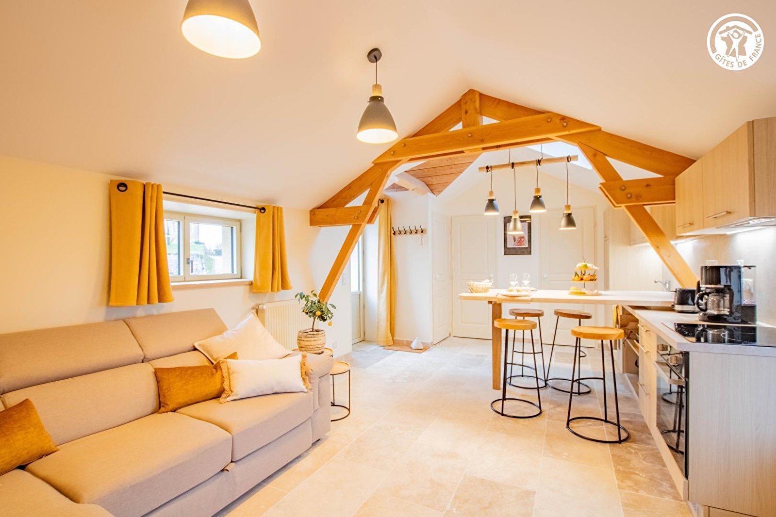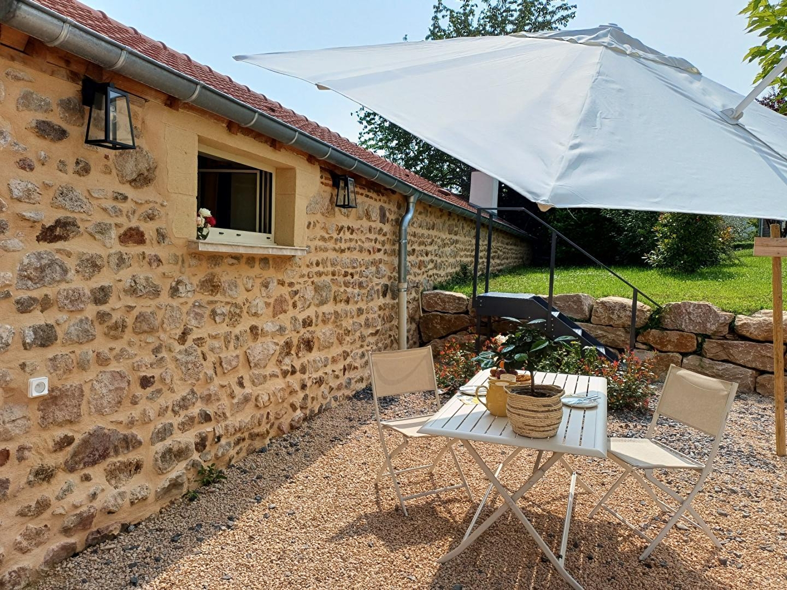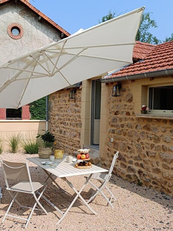 Noëlle & Axel (passionné d‘histoire, auteur d'un ouvrage local), vous ouvrent les portes d'une ravissante authentique dépendance agricole datant du début XIXe, soigneusement restaurée dans les règles de l'art, nichée en bordure de ruelle face à la très élégante église romane du bourg édifiée au XIIe. Calme & tranquillité, blotti en plein cœur d'un paisible & pittoresque petit village parfaitement sauvegardé de la douce compagne clunisoise (classée & protégé en "Zone Natura 2000" pour ses richesses faunistiques & floristiques) perché à flanc de colline au creux d'un magnifique écrin paysagé vallonné de prairies bocagères parsemées de bucoliques petites rivières & étangs, sous les crêtes boisées de la vaste forêt domaniale des Trois Monts (littéral "poumon vert" du territoire à parcourir lors de reposantes balades à pied ou VTT). Gîte de très bon confort lové "sous les toits" (beaux volumes). Chaleureux cachet d'esprit "campagne chic", cossu & raffiné, dialoguant avec les riches traces du bâti d'origine (murs en pierre & linteaux en bois). Beaucoup de charme & de caractère. Ambiance cosy, cocooning & douillette. Large cour en gravier dotée d'un espace terrasse, dominée par un jardinet "surélevé". Accès au vaste & très agréable jardin clos (3000m²) des propriétaires soigneusement paysagé (engazonné, végétalisé & arboré) abritant une belle piscine chauffée (4x12m) en commun, agrémentée d'une terrasse couverte.