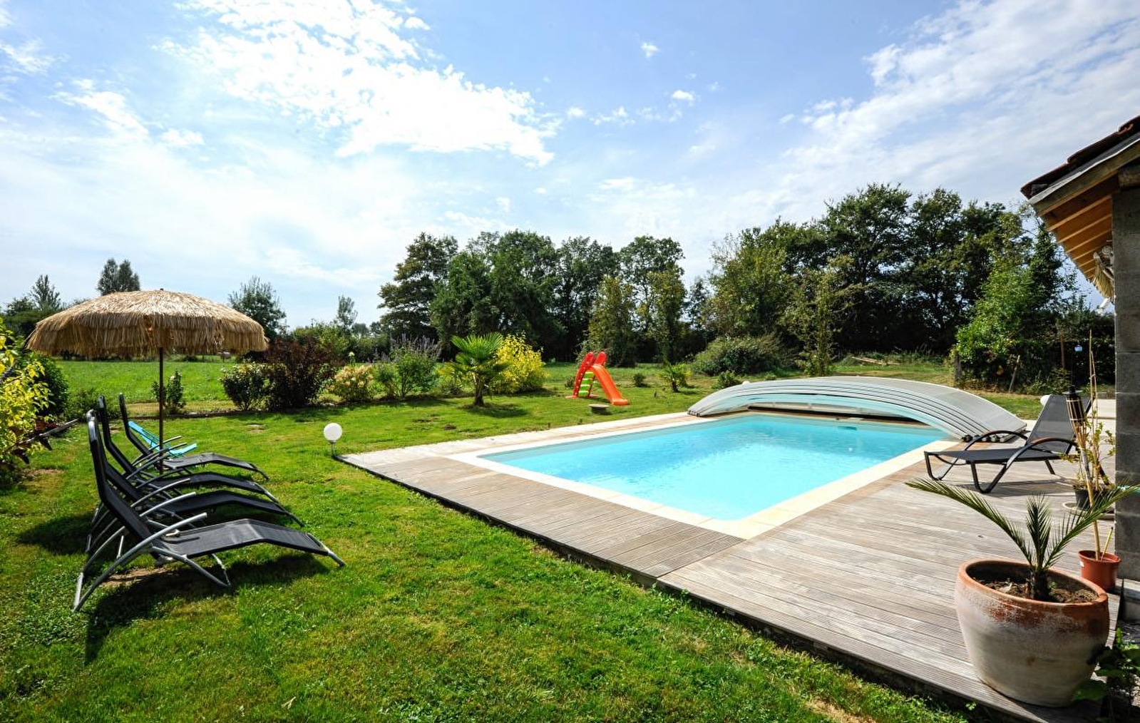 Sylvie & Jean-Louis vous accueillent au sein d’une authentique dépendance agricole du XIXe de caractère intégralement réhabilitée jadis liée à l’élégante ferme traditionnelle voisine, elle également soigneusement restaurée, qu’ils occupent aujourd’hui. Au cœur d’un petit hameau rural résidentiel niché en pleine campagne bressane louhannaise, au creux d’un apaisant écrin préservé conjuguant champs de cultures, rivières & prairies de pâtures, parsemé d’étangs comme d’espaces forestiers, en toute proximité des rives de la Saône & de la Seille, remarquable écosystèmes tous deux classés & protégés en "Zone Natura 2000" pour leurs très riches écosystème faunistiques & floristiques (réserve d'oiseaux migrateurs, espèces végétales rares, nombreux poissons, animaux & faune sauvage… ). Spacieux gîte de très bon confort. Très beaux volumes. Chaleureux cachet campagnard boisé aux airs de doux "chalet" montagnard. Ambiance cosy & douillette. Agréable intimiste jardin (espace réservé) doté d’une double terrasse privative (dont une insolite "plage" de repos en forme de cercle), lové sur une vaste propriété en commun très soignée (engazonnée, arborée & végétalisée) dotée d’une belle piscine (8x4m), d’une balançoire, d’un toboggan et d’une grande cour (littéral terrain de pétanque naturel).