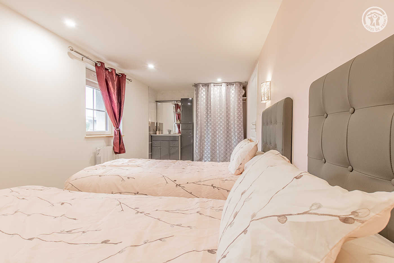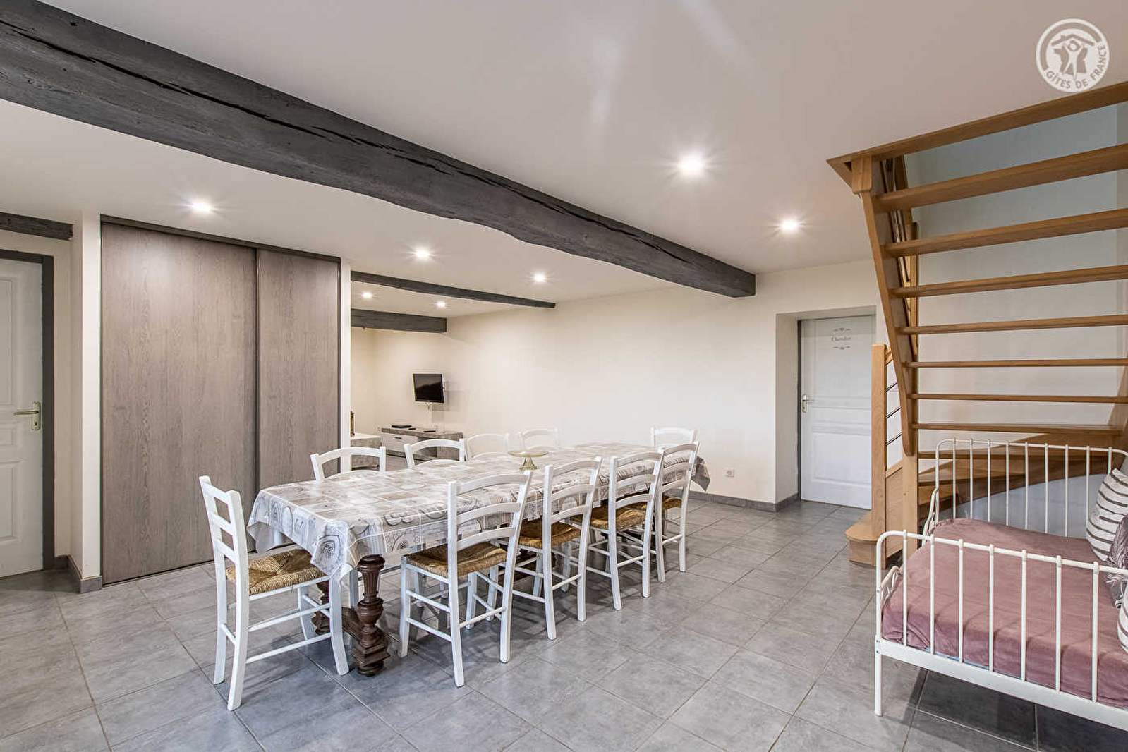 Composition : Maison indépendante voisinant le second gîte des propriétaires (totale indépendance sans vis-à-vis). Wifi. Chauffage électrique. Climatisation à l'étage. Rdc : séjour-cuisine-salon, 2 chambres (disposant chacune de 2 lits 1 p. 90x190cm jumelables en lit 2 p. de 180x190cm), salle de bain (baignoire), salle d'eau (douche), Wc indépendant. 1er étage : 2 chambres (disposant chacune de 2 lits 1 p. 90x190cm jumelables en lit 2 p. de 180x190cm), espace couchage en appoint et/ou salle de jeux sur une mezzanine palière (1 lit 1 p. 90x190cm), Wc indépendant. Terrasse couverte + terrain clos + parking privatifs. Commerces 6 km (Maximarché). Toutes commodités 15 km. Gare 16 km.