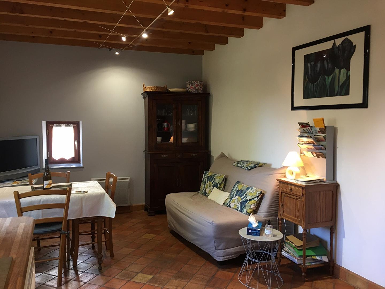 Composition : Maison de village mitoyenne jouxtant l'habitation des propriétaires (indépendance totale). Wifi. Chauffage électrique. Rdc : séjour-cuisine-salon (canapé BZ convertible 2 p. 140x190cm en appoint), Wc indépendant. 1er étage : chambre (lit 2 p. 160x200cm) avec salle de bain en espace ouvert (baignoire). Terrasse abritée + parking privés. Jardin clos en commun avec propriétaires. Local vélos. Toutes commodités 4.5 km.