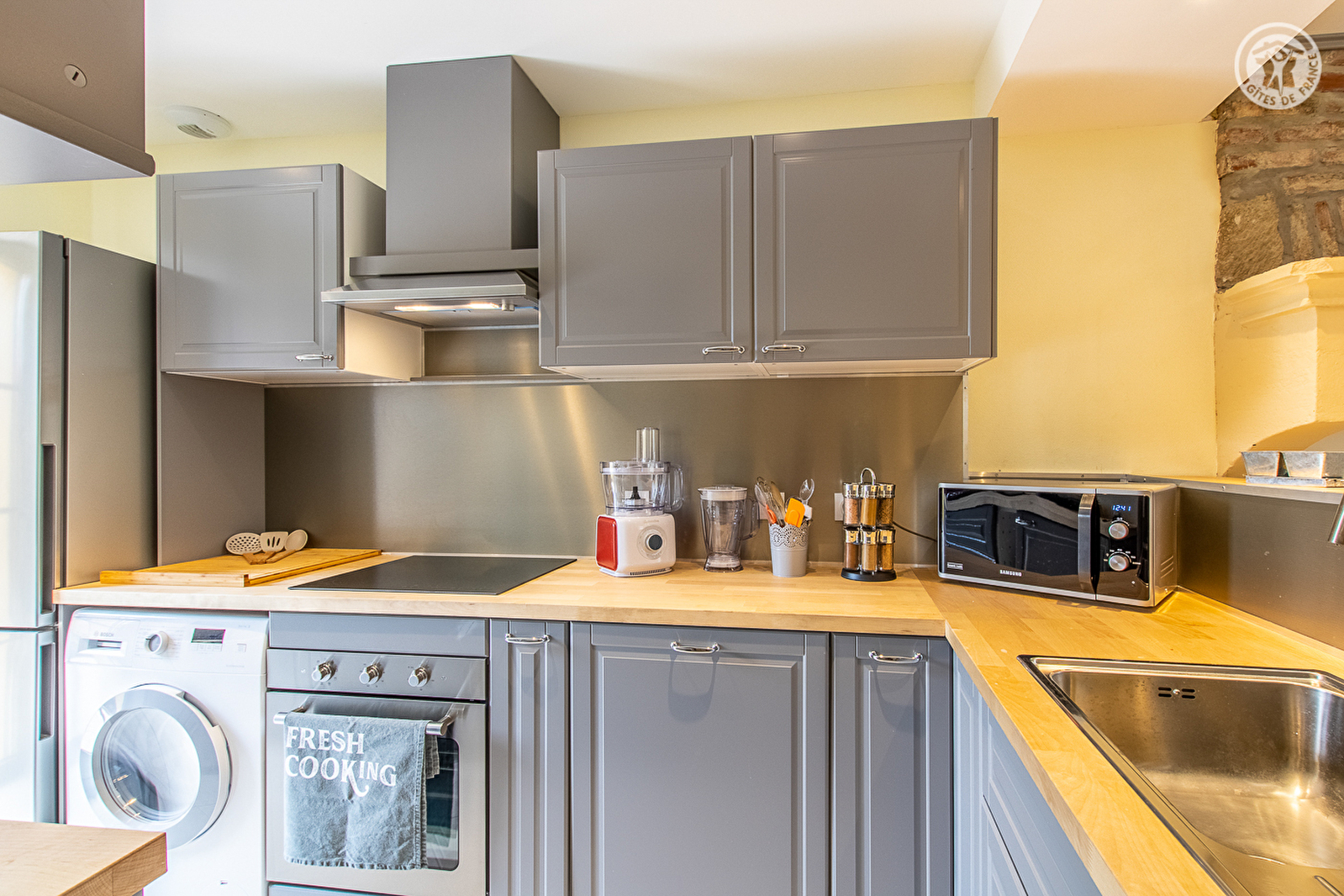 Composition : Maison de village mitoyenne voisinant l'autre gîte des propriétaires (totale indépendance entre les deux). Wifi (fibre). Chauffage électrique + poêle bois. Rdc : séjour-cuisine-salon (baby-foot), 1 chambre (lit 2 p. 160x200cm) avec TV & salle d'eau privée (douche), Wc indépendant. 1er étage : mezzanine-salon (canapé convertible 2 p. 140x190cm d'appoint), 2 chambres (lit 2 p. 140x190cm dans chaque) dont 1 avec TV, salle d'eau (douche/Wc). Terrain clos (200m² / table ping-pong) + terrasse + local vélos + parking privés. Toutes commodités 9 km.