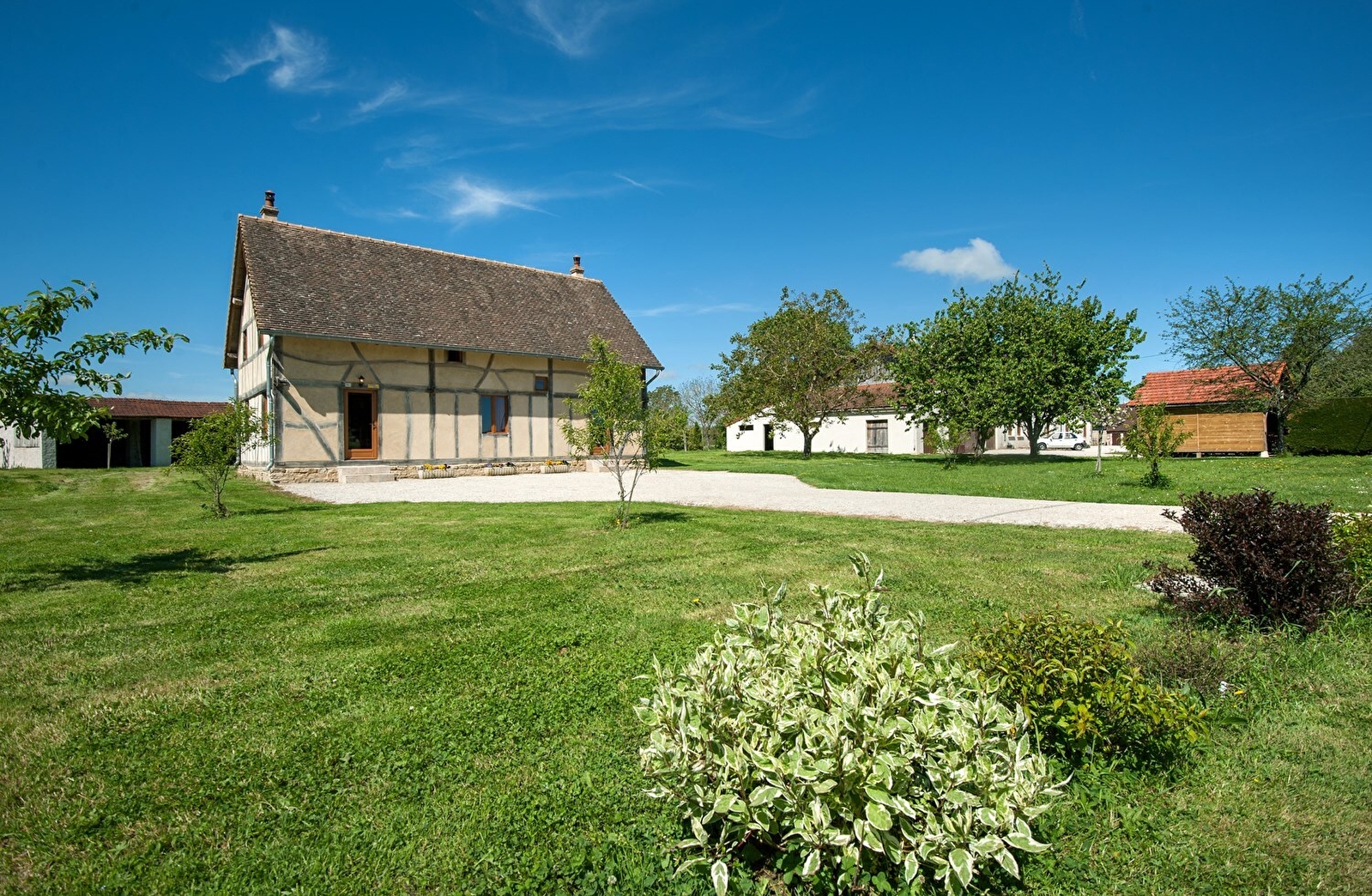 Très élégante demeure contemporaine aménagée dans le strict respect des codes architecturaux traditionnels du pays (construite et aménagée en briques & pans de bois avec torchis, telle une authentique ferme bressane d'époque) sise sur un ancien petit domaine agricole familial intégralement revisité en confortable villégiature (propriété comprenant 3 gîtes). Calme & tranquillité totales au cœur d'un paisible petit hameau rural résidentiel de la douce campagne chalonnaise, lové en lisière immédiate de champs & prairies, à deux pas d'un bucolique étang & de la vaste forêt domaniale de Gergy, immense « poumon vert » du territoire à parcourir lors d'apaisantes promenades à pied comme en VTT. Agréable environnement champêtre & naturel préservé, à 3 km du bourg typique d'Allerey-sur-Saône, chargé de grande histoire de par sa rente de situation (situé tout à la fois sur les rives de la Saône & l'ancienne voie romaine Agrippa), tour à tour port fluvial majeur du pays Beaunois & de ses vins jusqu'au XVIIème siècle, important nœud ferroviaire de voyageurs & marchandises (19ème/début 20éme) puis l'un des 20 rares « camp-hôpital américain » durant la 1ère guerre mondiale. Spacieux gîte de bon confort. Chaleureux cachet campagnard de style & caractère. Large terrasse privative ouverte sur un agréable jardin en commun engazonné & arboré, espace réservé aux deux gîtes niché sur une vaste propriété soignée & fleurie disposant d'un verger fruitier (cerisiers, pruniers, pêchers, pommiers, poiriers… / cueillette possible).