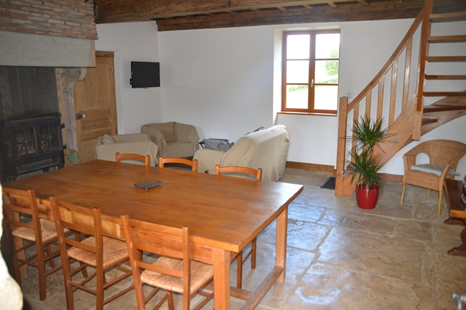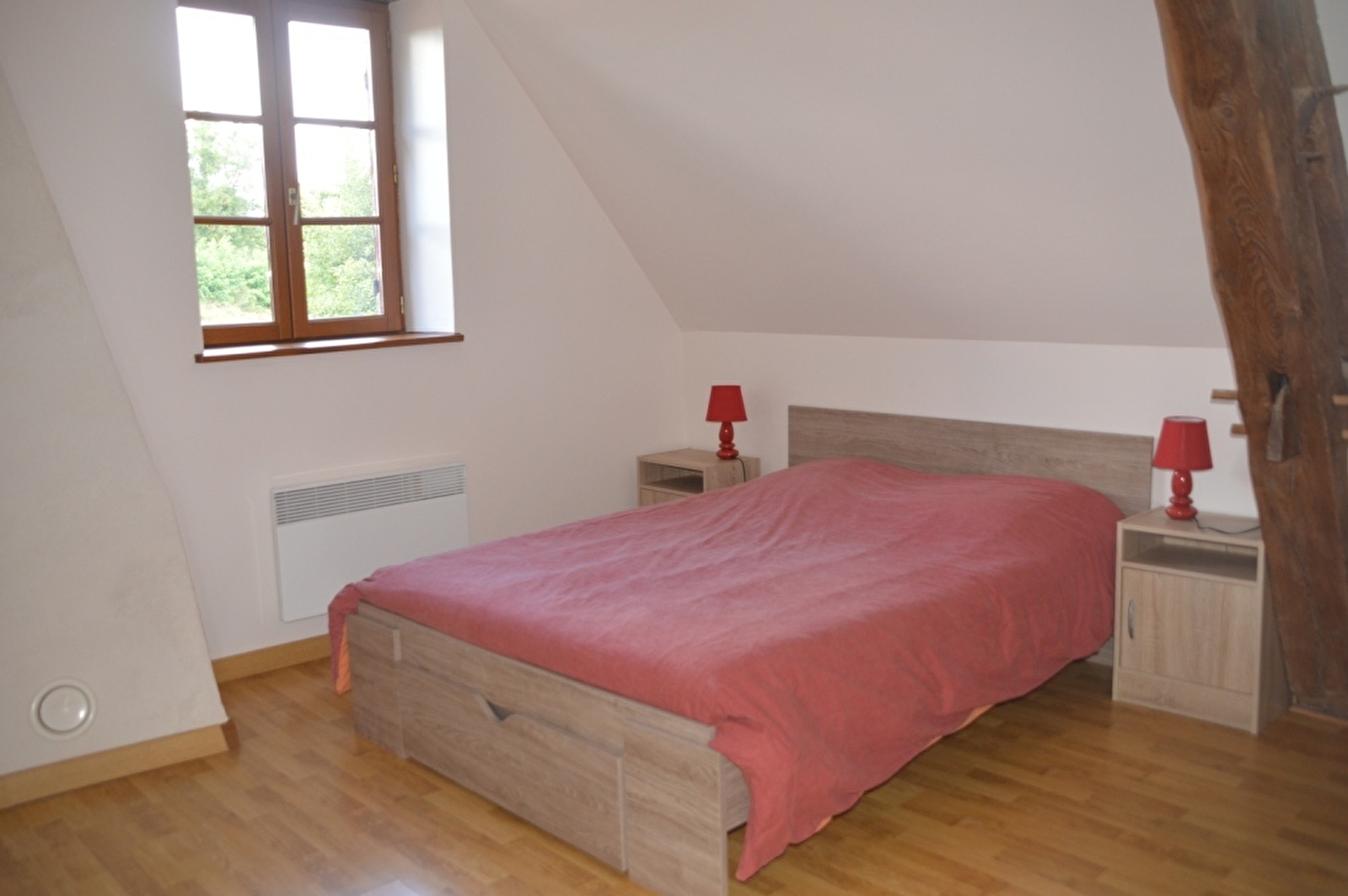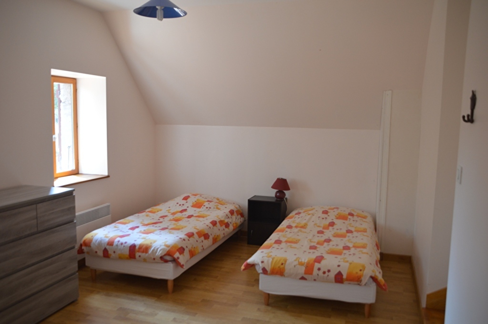 Composition : Maison individuelle (accès par 250m de chemin de terre carrossable). Poêle à granulés bois + poêle à bois au rdc. Chauffage électrique à l’étage. Rdc surélevé (3 marches) : séjour-cuisine, séjour-salon (canapé convertible 2 p. 140x190cm en appoint), Wc indépendant. 1er étage : 2 chambres (lit 2 p. 140x190cm / lit 2 p. 140x190cm + 2 lits 1 p. 90x190cm), salle d’eau (douche), Wc indépendant. Balcon-terrasse abrité + terrasse sur cour (gravier) + jardin (3000m²) + local vélos + parking privés. Petits commerces & supermarché 14 km. Toutes commodités 18 km.