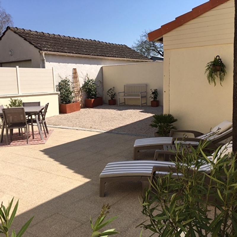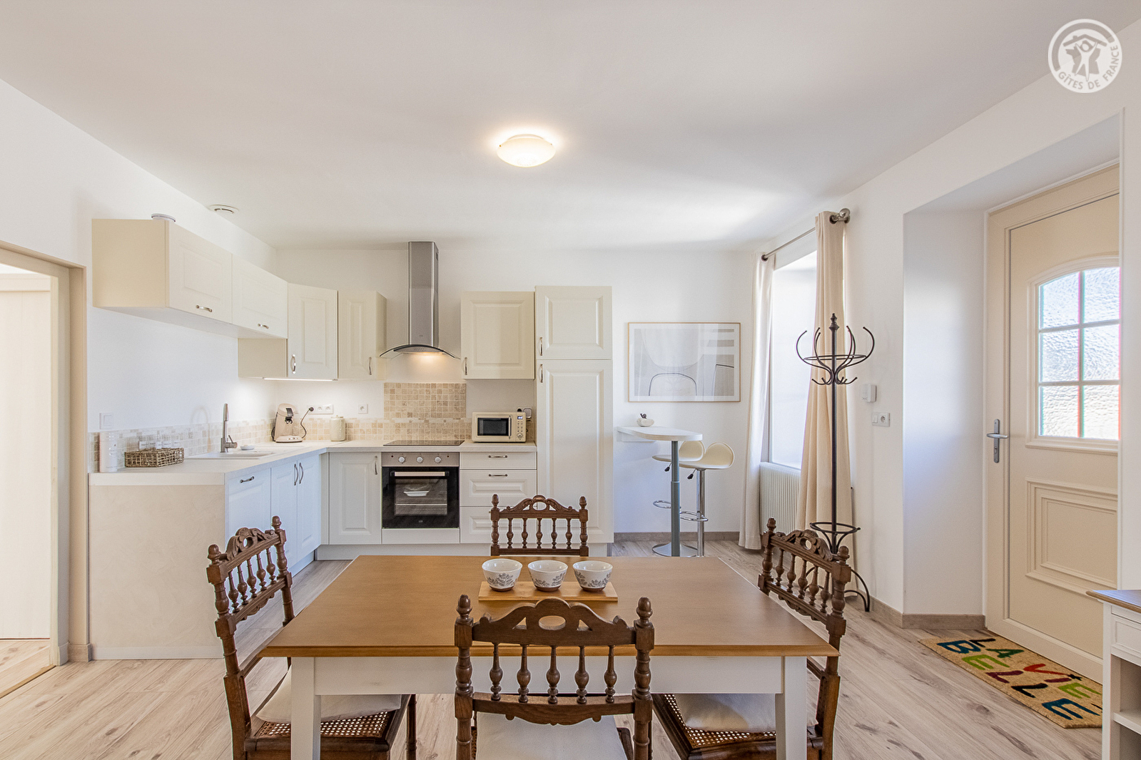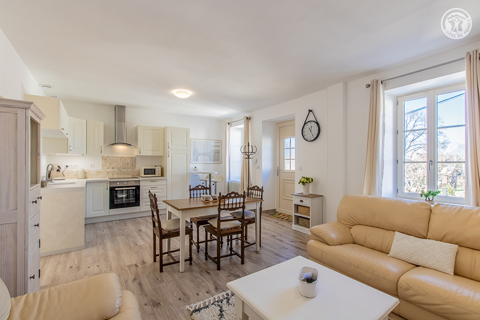 Composition : Maison individuelle jouxtant l'habitation des propriétaires (totale indépendance sans vis-à-vis). Wifi. Chauffage central gaz. Rdc surélevé (3 marches) : cuisine-séjour-salon, 1 chambre (lit 2 p. 160x200cm), salle d'eau (douche), Wc indépendant. Terrasse (50m²) + balcon + jardinet + local vélos + parking privés. Commerces (dont supérette) à 500m. Supermarché et Gare à 8.5 km.