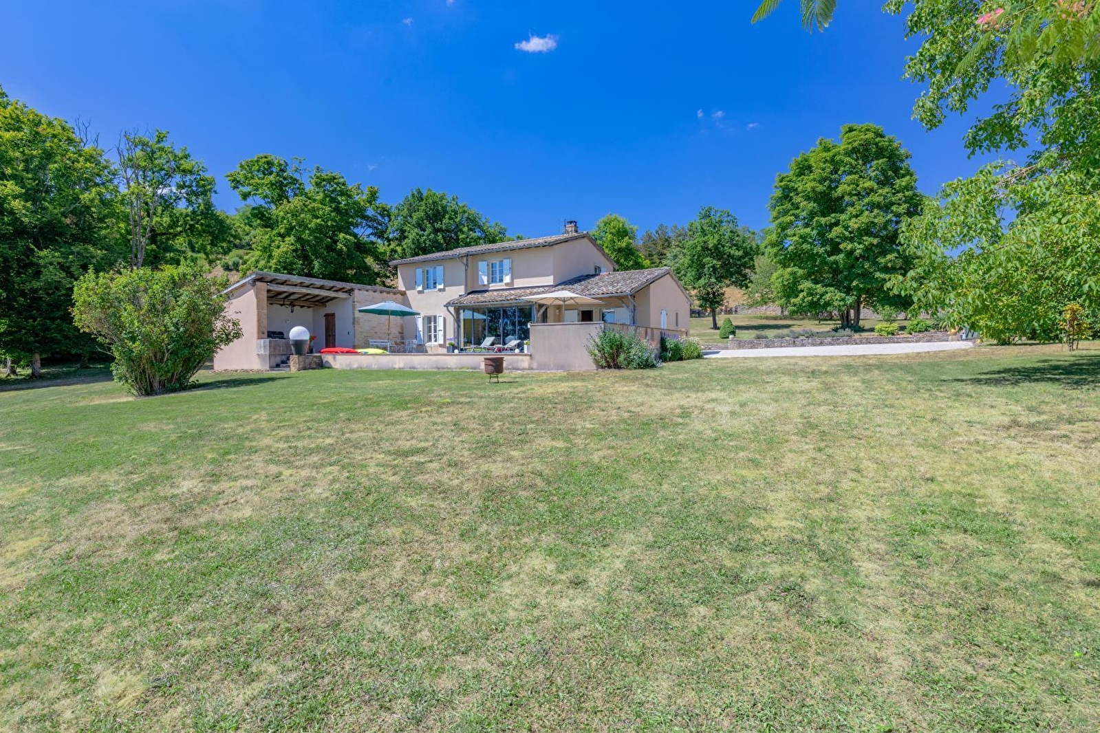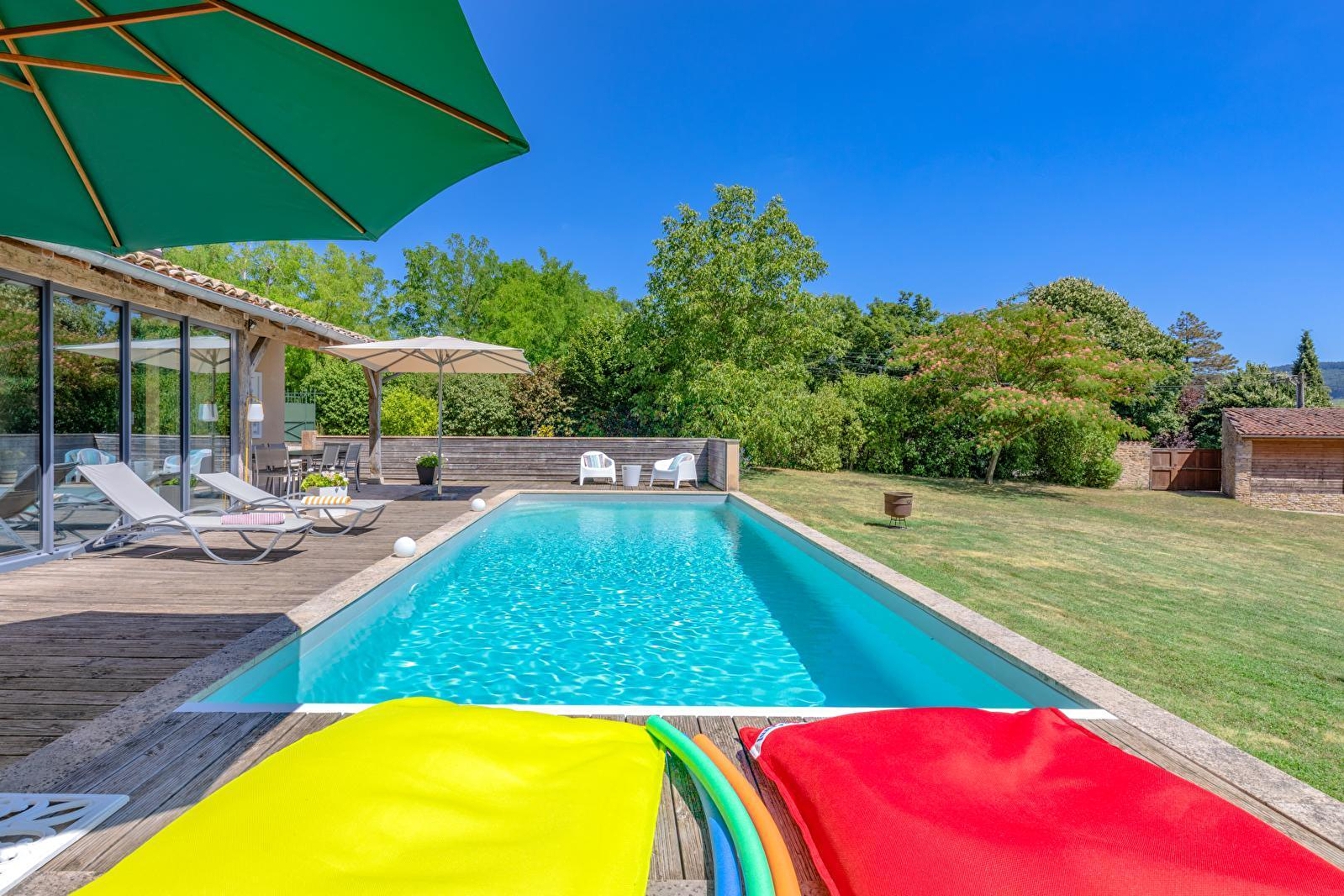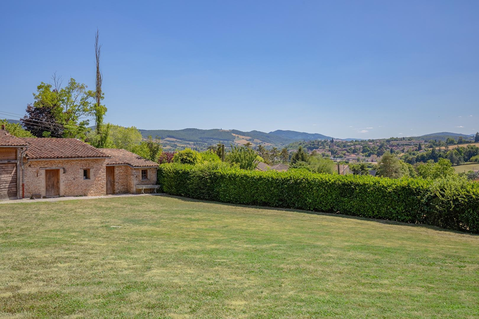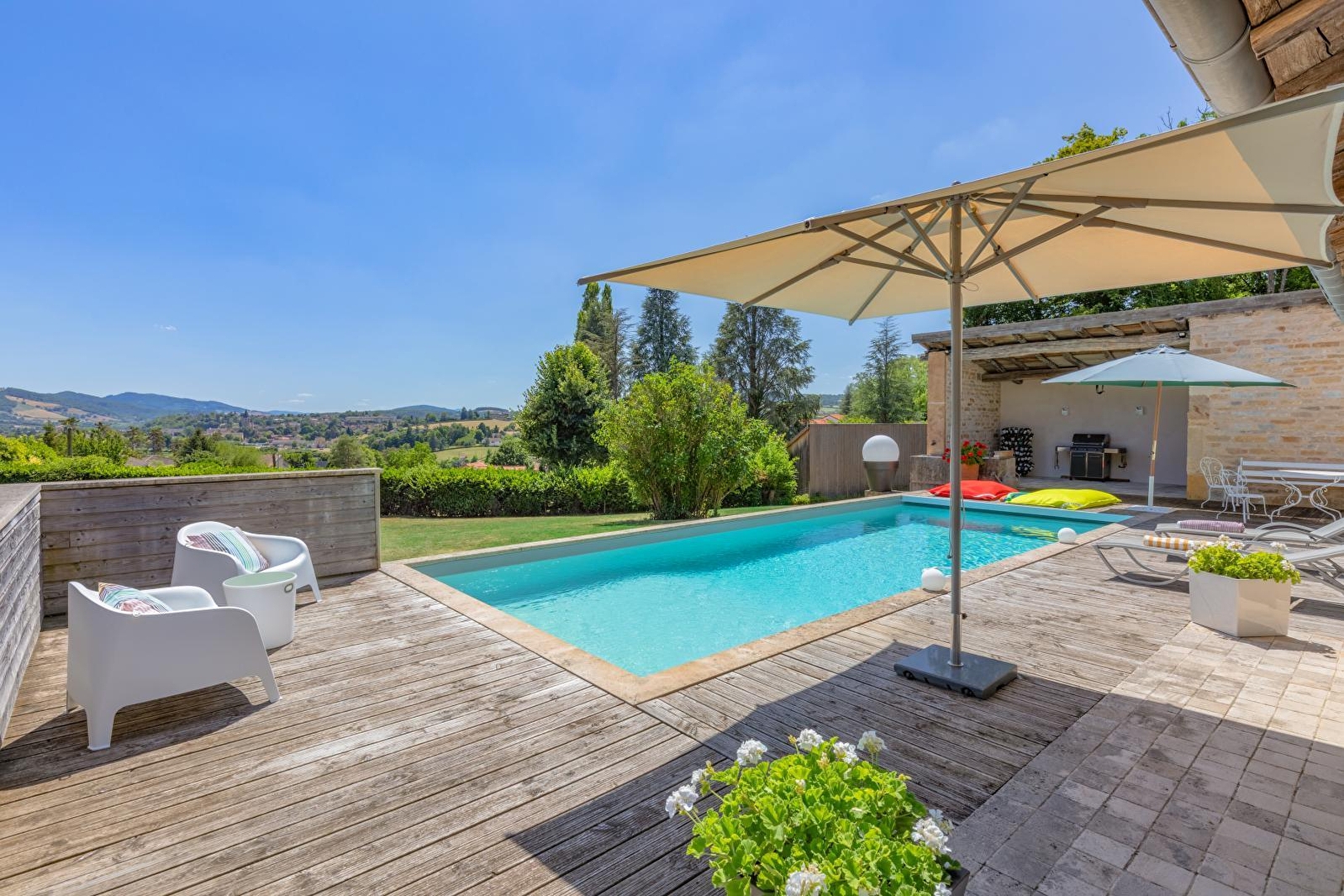 Ravissante villa contemporaine de pays édifiée dans les "nineties" (années 90) sublimée par d'authentiques matériaux traditionnels de caractère (poutres, tomettes, portes moulurées, charpente extérieur, appentis en pierres etc…), blottie à flanc de colline en "vigie" & "belvédère panoramique", sur un coteau sud-est exposé dominant l'illustre cité bourguignonne de renommée mondiale, "cœur spirituel" de l'Europe médiévale à l'inestimable patrimoine historique. Calme & tranquillité niché en bordure de ruelle & lisière d'une petite prairie boisée, au sein d'un paisible hameau résidentiel juché sur les hauteurs du bourg (qui abritait jadis des vignes), à deux pas de la douce campagne clunisoise préservée alentour, bucolique écrin champêtre & naturel vallonné, conjuguant prairies bocagères, vignobles, rivières & forêts sauvages. Spacieux gîte de grand confort. Élégant cachet campagnard aux accents contemporains, cossu & raffiné. Chaleureuse ambiance "enveloppante" digne d'un douillette "maison de famille". Énormément de charme & caractère. Équipement complet de qualité. Vaste terrasse exposée (complétée par une terrasse abritée) ouverte sur une belle piscine (10x4m), au creux d'une apaisante propriété engazonnée de 4500m² (quasi close avec portail électrique), soigneusement fleurie, végétalisée & arborée (cerisiers, amandier, pommiers, noisetiers, noyer… / cueillette possible), bordée de pittoresques murs en pierres sèches. Superbe vue dégagée sur Cluny & son abbaye et les monts du Clunysois. Magnifique panorama & paysages.