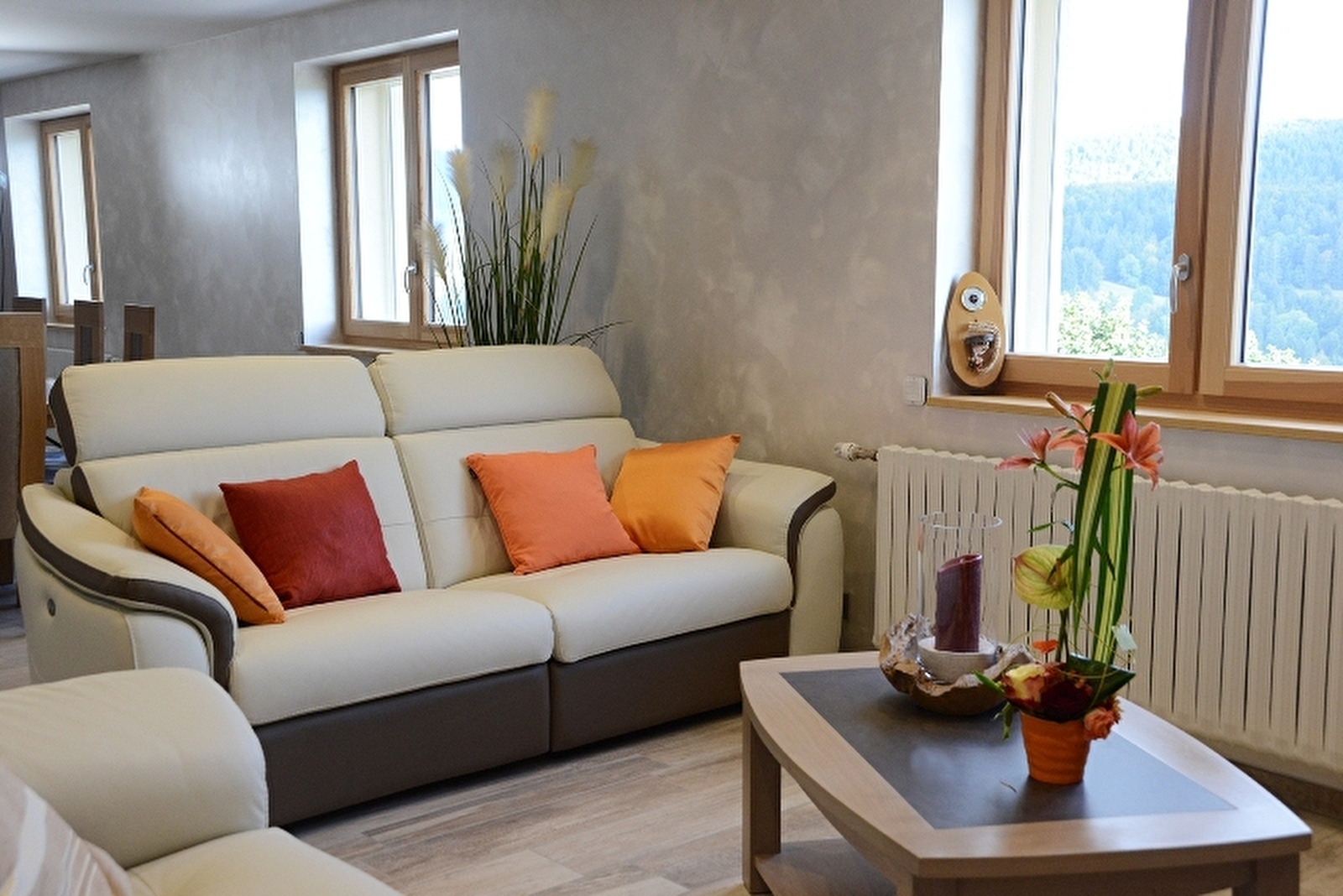 Un surprenant gîte entièrement rénové au 1er étage dans une maison mitoyenne entièrement indépendante. Venez pousser la porte de ce gîte le clos des Grillons et découvrez la qualité et le confort de cette belle prestation qui a presque tout d'un 4 épis. Un vaste séjour lumineux s'offre à vous avec une cuisine moderne entièrement équipée, une salle à manger confortable et un espace salon reposant. Le gîte dispose de 3 chambres décorées avec goût dont une avec 1 lit en 160x200. Une chambre dispose également d'un lit pour 1 personne supplémentaire si besoin. La propriétaire a imaginé une petite salle de jeux pour enfants. Une spacieuse salle de bain avec 2 lavabos, 1 douche à l'italienne et une baignoire d'angle. 2 wc indépendants. La visite se poursuit avec la découverte de l'espace "zen attitude" : fauteuil de massage, 1 espace douche et l'accès au bio sauna (une fonction sauna sec ou humide). Grand espace extérieur non clos avec salon de jardin et plancha. Un gîte à découvrir absolument. Lits faits à l'arrivée. Pour info : hôtel canin à proximité. Possibilité de louer le gîte pour 2 ou 4 personnes : voir tarifs sur le site des propriétaires. Ménage pour 5 - 7 pers 130 euros