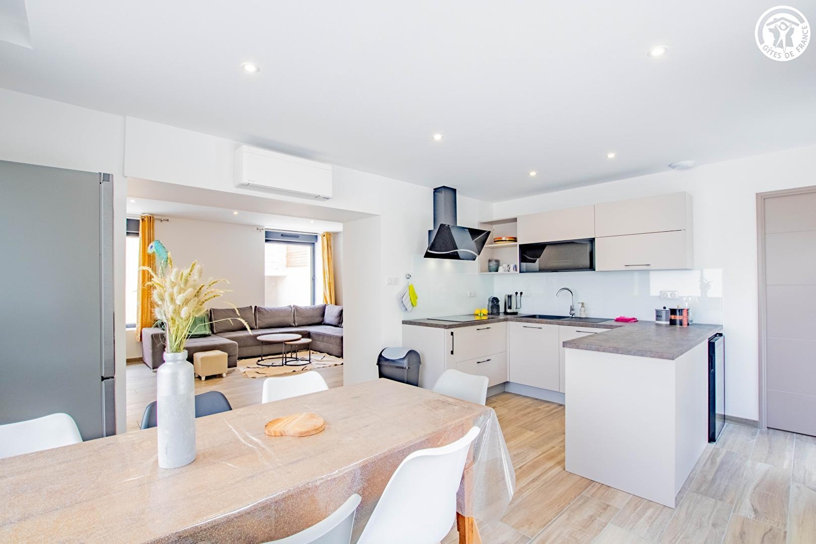 Composition : Maison de village mitoyenne jouxtant le local professionnel des propriétaires (bureau + second gîte). Wifi (fibre). Chauffage PAC. Climatisation. Rdc : Séjour-cuisine-salon, 1 chambre (lit 2 p. 160x200cm) avec salle d'eau privée (douche), Wc indépendant. 1er étage : 2 chambres (lit 2 p. 160x200cm / 2 lits 1 p. 90x200cm + 2 lits 1 p. superposés 90x190cm), sde (douche/Wc). Terrasse + jardinet + spa 5 p. (fermé 01/10 au 31/03 sauf vacances Noël/jour de l'an) + parking privés. Cour en commun avec borne recharge électrique véhicules. Toutes commodités 3.5 km. Supermarché 4 km.
