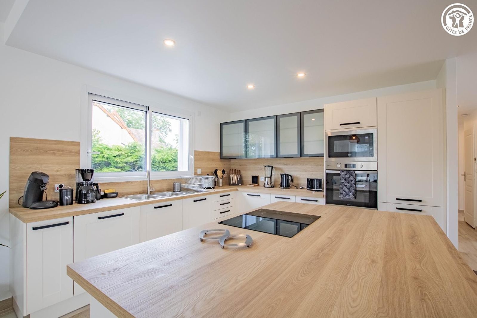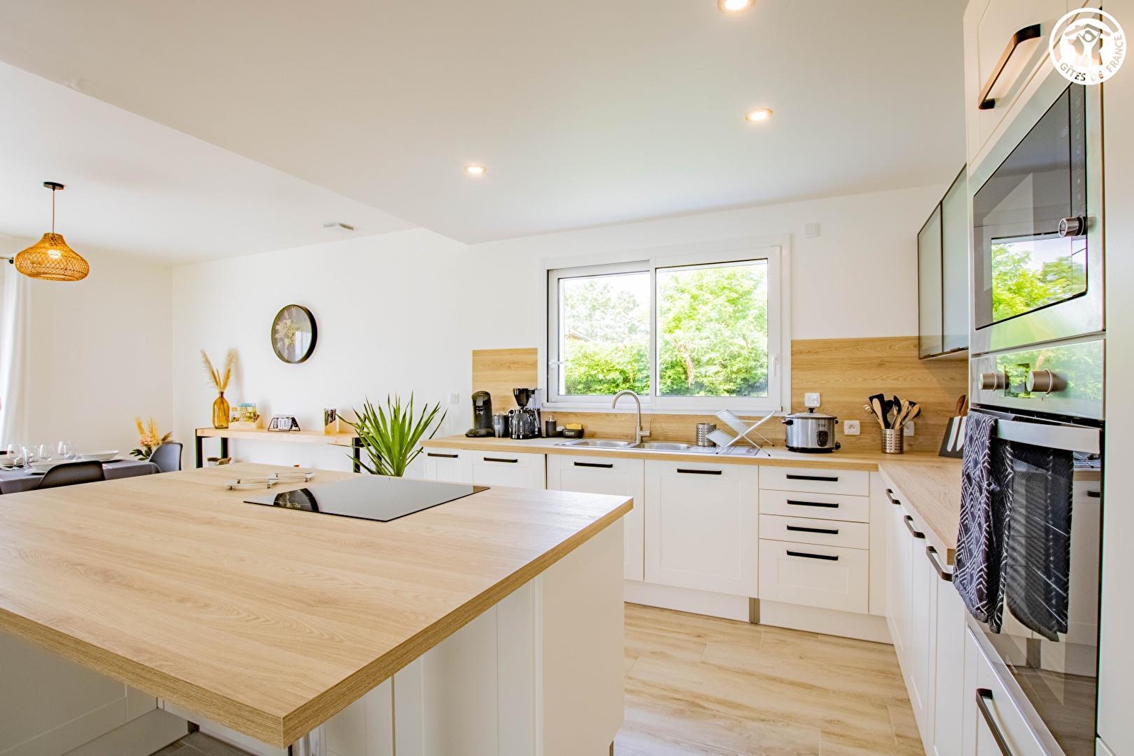 Composition : Maison individuelle voisinant la maison des propriétaires (totale indépendance). Wifi (fibre). Chauffage PAC. Gîte sur deux niveaux. Rdc : séjour- cuisine-salon (1 convertible 1 p. 115x190cm en appoint), 1 chambre (lit 2 p. 160x200cm) avec salle d'eau privative (douche), Wc indépendant. 1er étage : 3 chambres (lit 2 p. 140x190cm / 2 lits 1 p. 100x200cm / lit 2 p. 140x190cm), salle de bain (baignoire), Wc indépendant. Terrasse couverte + jardin clos (150m²) + garage (1 place) + local vélos + parking privés. Toutes commodités dont supermarchés à 5 km.