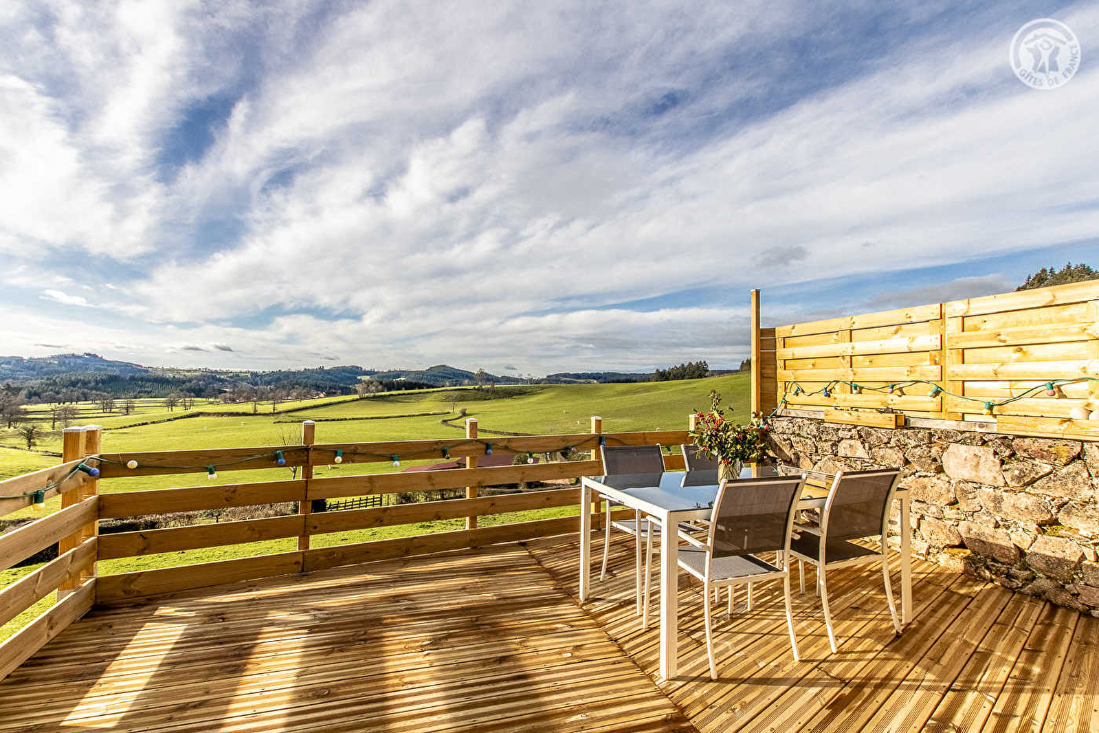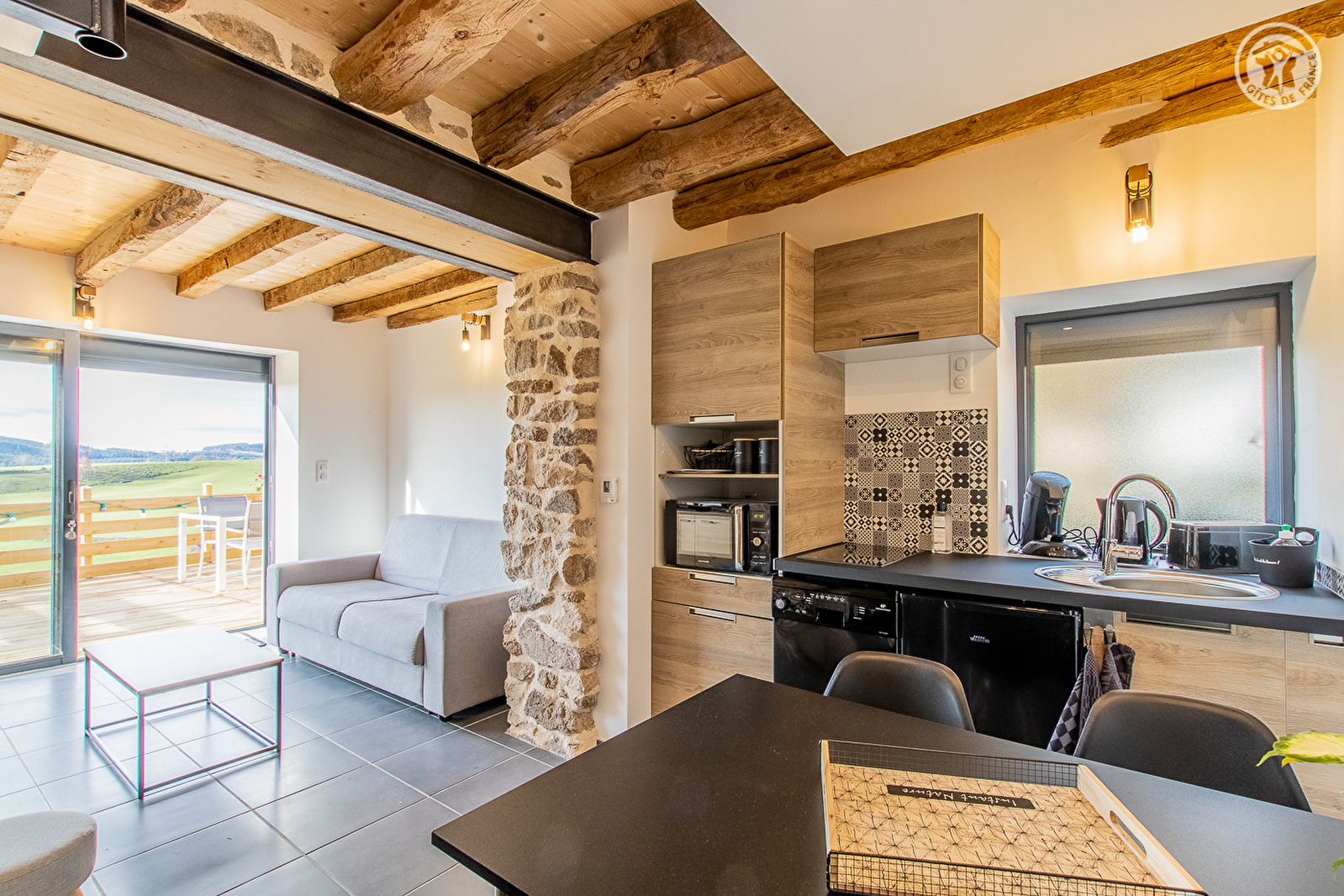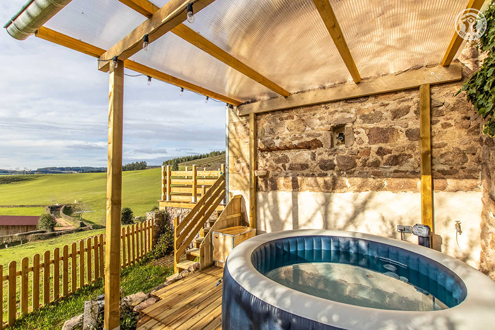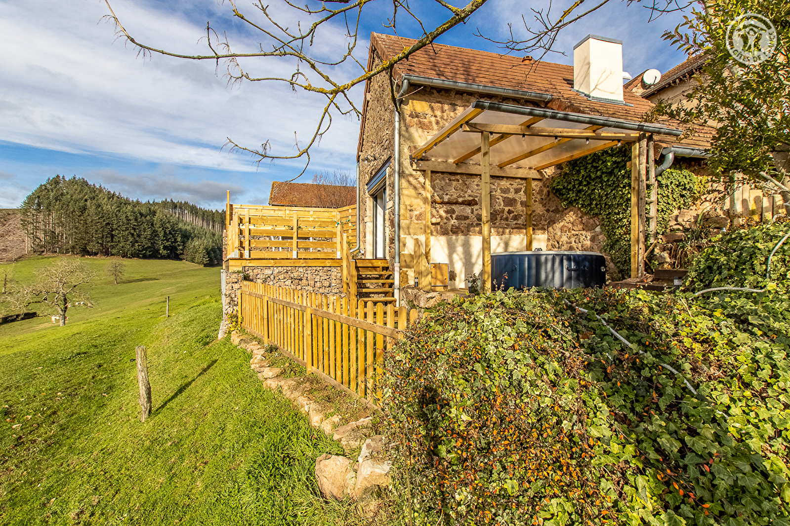 Jean-Paul & Patricia vous accueillent au sein d’une ravissante authentique dépendance de caractère du XIXe soigneusement restaurée avec goût, sise sur un ancien domaine agricole composé de divers bâtiments tous parfaitement réhabilités, aux confins d’un mini hameau rural. Cadre & site littéralement enchanteurs, blotti à flanc de coteau sud-ouest exposé, dominant en "balcon" un sublime plateau de bocage, avec en guise de proches voisines privilégiées les célèbres paisibles vaches charolaises. Somptueux panorama & paysages. Calme & tranquillité totale, lové en lisière immédiate de prairies & forêts, au creux d’un magnifique cirque champêtre vallonné, niché sous les crêtes boisées des collines alentour, magnifique écrin préservé de verdure & nature adossé sur les flancs du mont Saint-Cyr, point culminant de Bourgogne du sud (belvédère unique offrant une exceptionnelle vue panoramique jusqu’au Mont-Blanc par temps clair !). Gîte de très bon confort d’architecture "compacte" moderne. Chaleureux cachet contemporain mixant influences nordiques & industrielles allié à une restauration soignée (poutres & murs en pierre d’origine), sublimée par la conservation d’un ancien four à pain traditionnel (visible en "vitrine" dans le gîte). Ambiance cocooning & cosy. Beaucoup de charme. Agréable large terrasse panoramique en balcon. Bonus magique, vous disposez d’un spa extérieur abrité ouvert sur un paysage de carte postale !