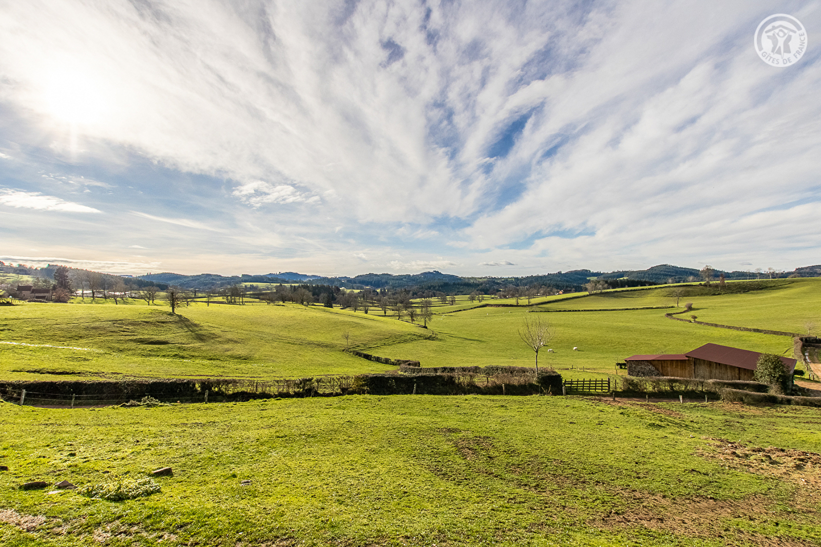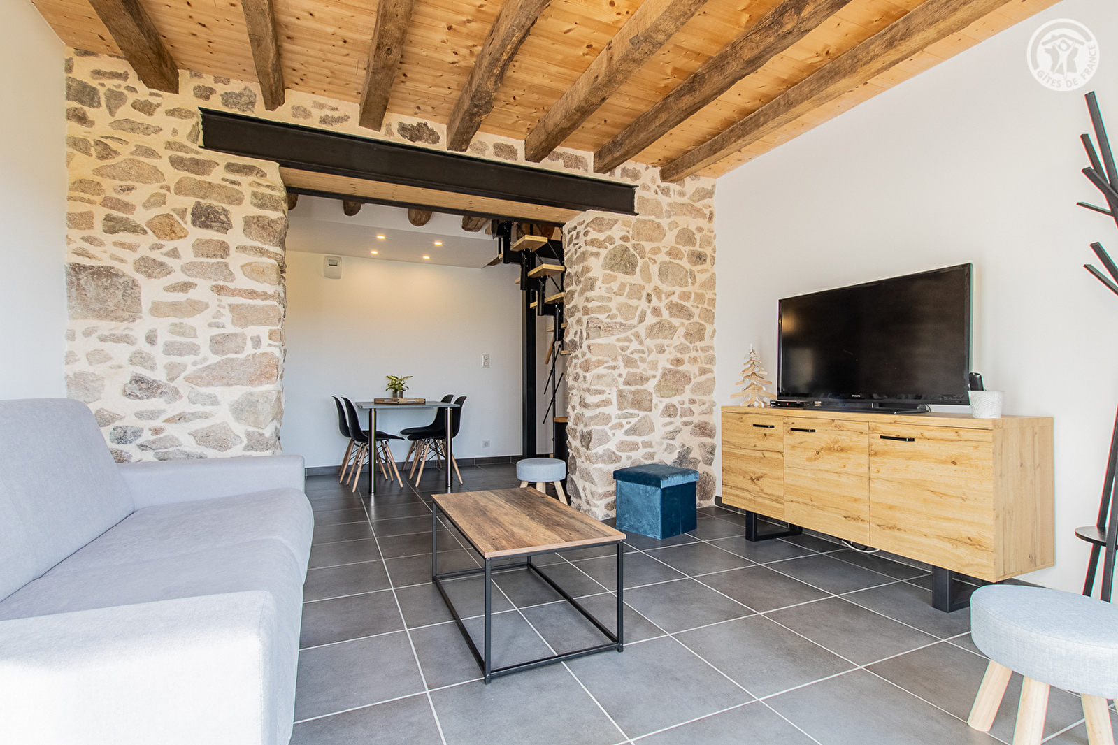 Composition : Accès propriété par 400m de chemin de terre carrossable. Maison individuelle jouxtant la maison des propriétaires et un second gîte (indépendance totale sans vis-à-vis / accès au gîte par escalier descendant à flanc de pente depuis la cour-parking). Wifi (fibre). Chauffage électrique. Rdc surélevé : cuisine-séjour-salon (canapé convertible 2 p. 140x190cm). 1er étage : 1 chambre (lit 2 p. 140x190cm), salle d’eau (douche/wc). Balcon-terrasse + spa abrité (4 places) + micro jardinet + local vélos + parking privés. Commerces 9 km. Supermarché 14 km.