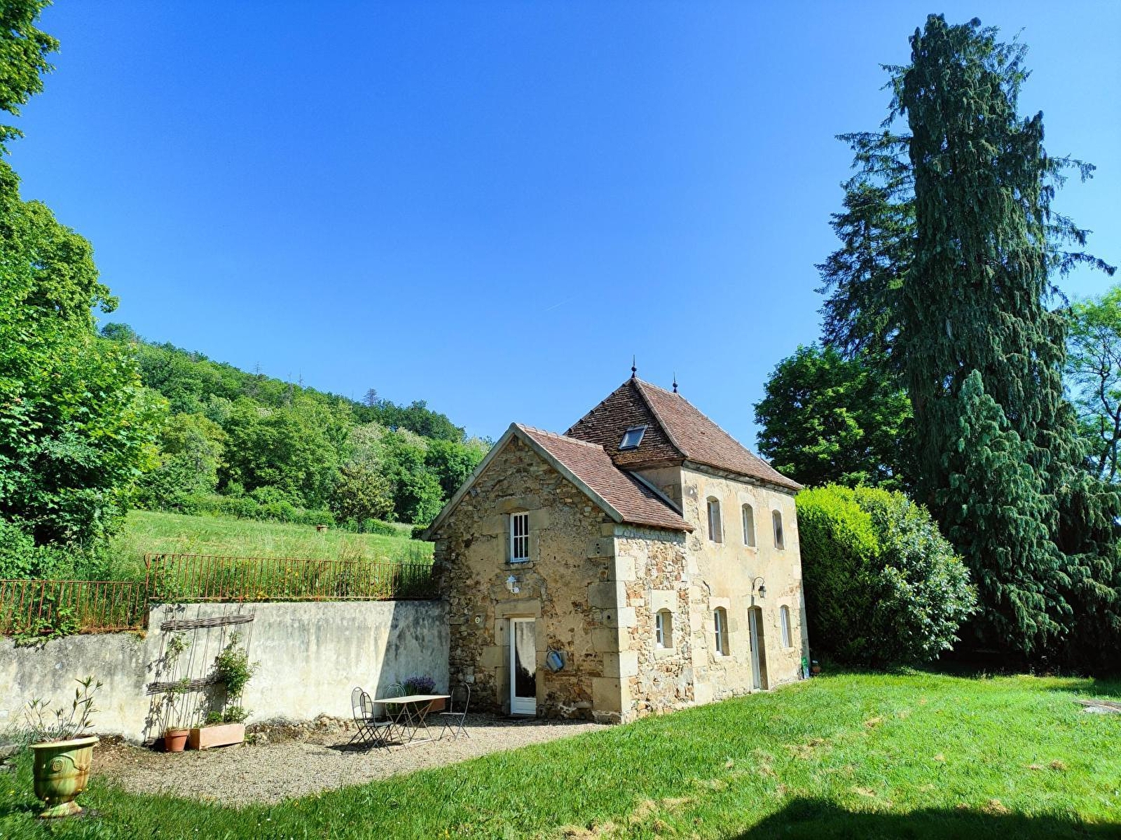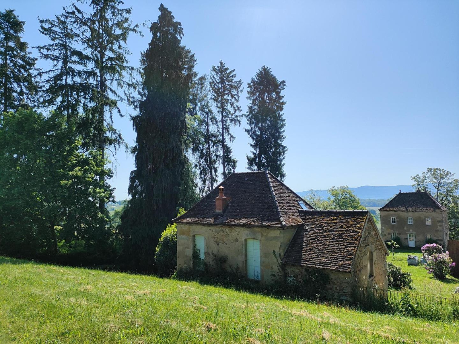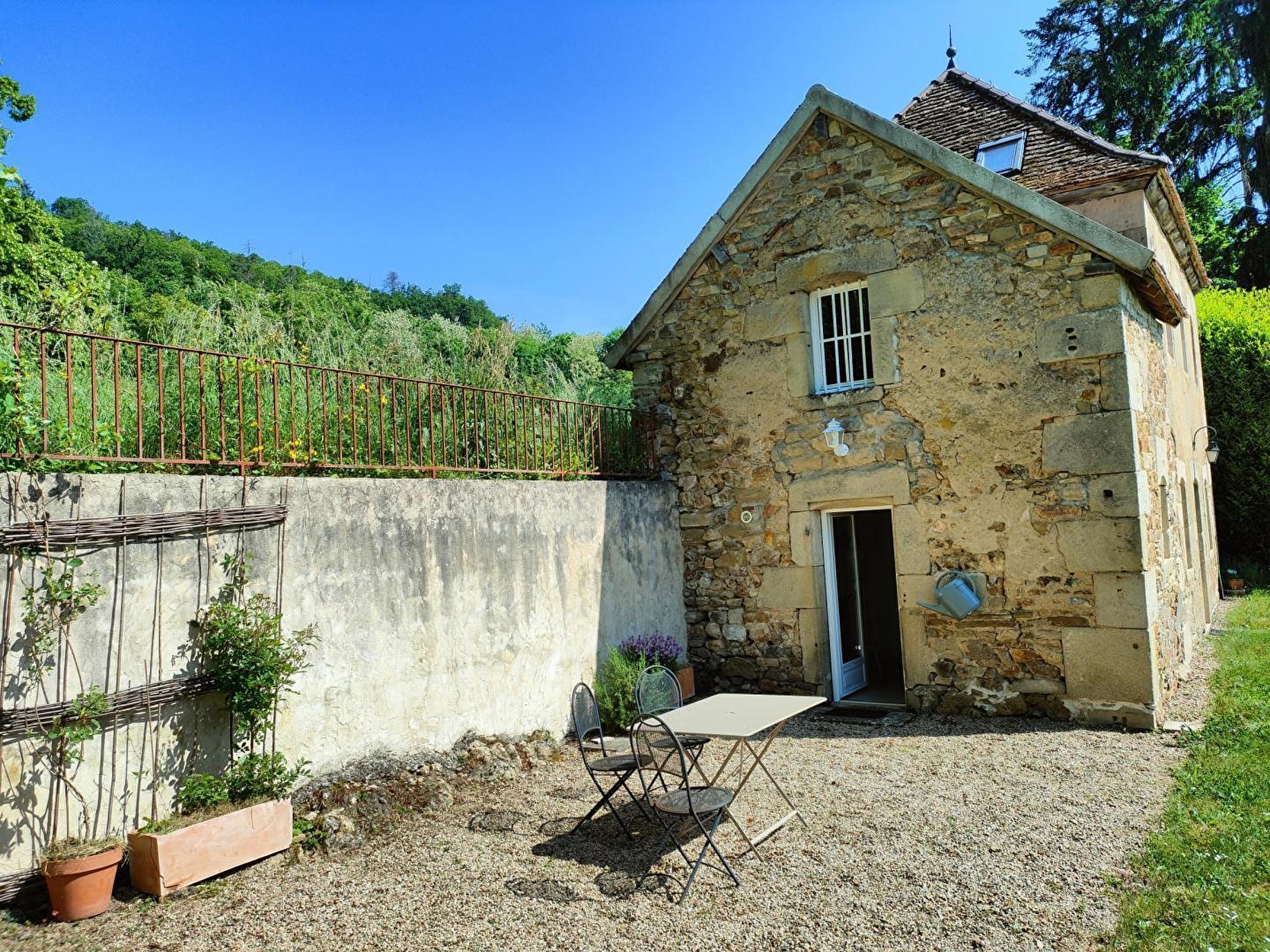 Ravissante authentique dépendance agricole du début XIXe intégralement restaurée, nichée sur une vaste propriété privée en grande partie boisée, au sein d'un paisible "mini hameau" composé de 2 gîtes. Calme & totale tranquillité en pleine campagne morvandelle vallonnée, niché en lisière immédiate de forêt, à flanc de coteau sud-est dominant un vaste plateau de prairies bocagères. Très belle vue dégagée sur la campagne morvandelle et la ville d'Autun depuis le site (non loin du gîte). Blotti au fond de la verdoyante vallée du Méchet & sa rivière poissonneuse, au cœur d'un splendide écrin paysagé de montagne douce parsemé de profondes forêts sauvages (à parcourir lors de reposantes balades à pied ou VTT), le petit bourg de la Grande Verrière (l'un des plus anciens villages du Morvan sis à 3.5 km), abrite un patrimoine notable (châteaux médiévaux dont certains en ruines & manoirs) et dispose d'un sublime environnement préservé de verdure & nature. Gîte de bon confort. Chaleureux cachet campagnard sublimé par une restauration patrimoniale soignée (linteaux en pierres, briques & bois d'époque, magnifique plafond vouté d'origine en pierres côté cuisine, poutres….). Atmosphère totalement dépaysante d'une ancienne demeure pétrie d'histoire. Beaucoup de charme & énormément de caractère. Large terrasse en gravier ouverte sur un agréable jardin engazonné. Accès à un cours de tennis privé à deux pas (commun aux 2 gîtes de la propriété).