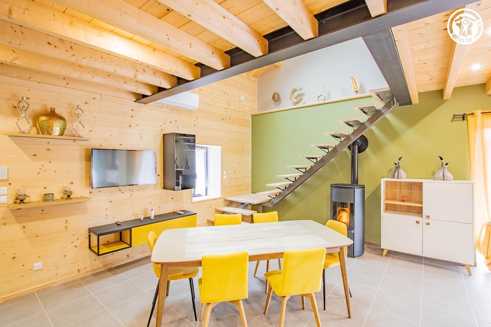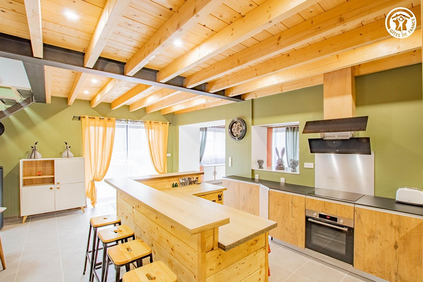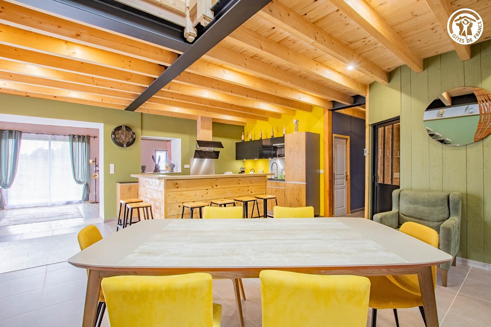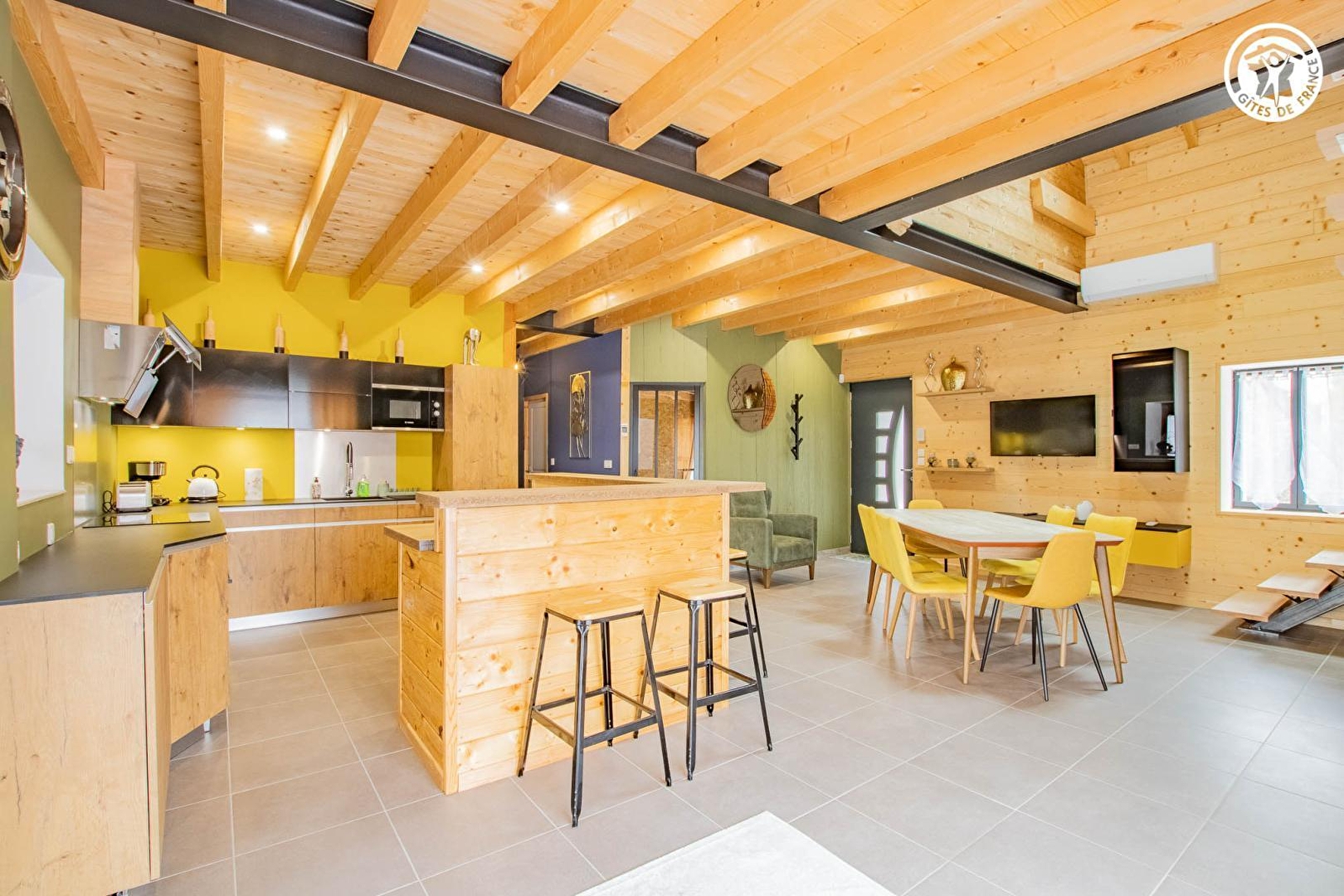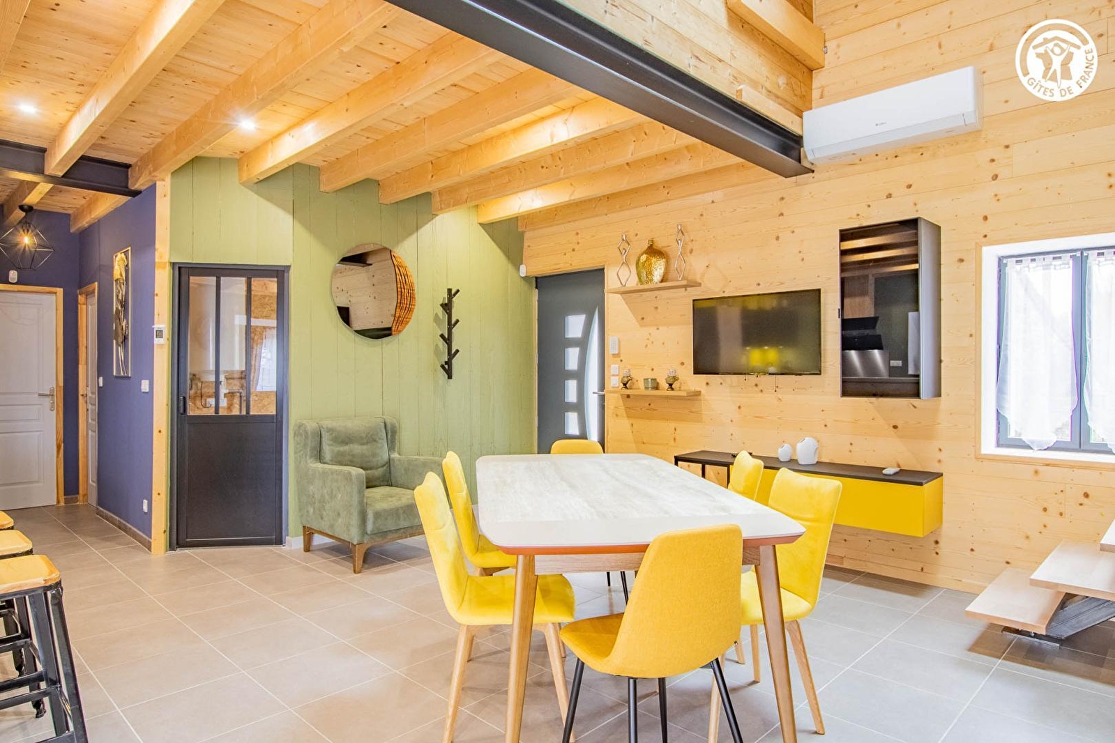 Anne & Charles ("compagnon charpentier" ayant œuvré à l'intégralité des travaux de structure du gîte) vous accueillent au sein d'une authentique ferme de pays datant du XVIIIème siècle soigneusement restaurée, blottie en "cul de sac" en lisière d'une bucolique plaine de champs & prairies, aux confins d'un hameau résidentiel. Agréable cadre préservé en pleine campagne péri-urbaine, en toute proximité de l'intégralité des commodités, à deux pas de la vaste forêt sauvage de la Ferté parsemée d'étangs (littéral "poumon vert" du territoire sur 18km², à parcourir lors de reposantes balades à pied ou VTT), au sein d'un petit village de la proche "couronne" chalonnaise lové sur les rives de la Saône, célèbre pour abriter la demeure de Nicéphore Niepce l'inventeur de la photographie qui y résida & mourut ("Maison du Gras" labellisée "Maisons des Illustres"), "iconique" site historique de réputation mondiale (visitable) où il fit l'intégralité de ses recherches & découvertes et d'où fut prise la toute première photographie officielle de l'histoire (l'illustre "Point de vue du Gras"). Spacieux gîte de grand confort. Vaste pièce de vie de 70m². Très élégant cachet campagnard aux accents contemporains, d'esprit "scandinave", conjugué à une chaleureuse ambiance montagnarde boisée. Beaucoup de charme, style & caractère. Cosy & ultra douillet. Triple terrasse à disposition dont deux abritées (balcon-terrasse & une privative côté chambre). Terrain naturel "brut". Belle vue dégagée sur la campagne environnante.