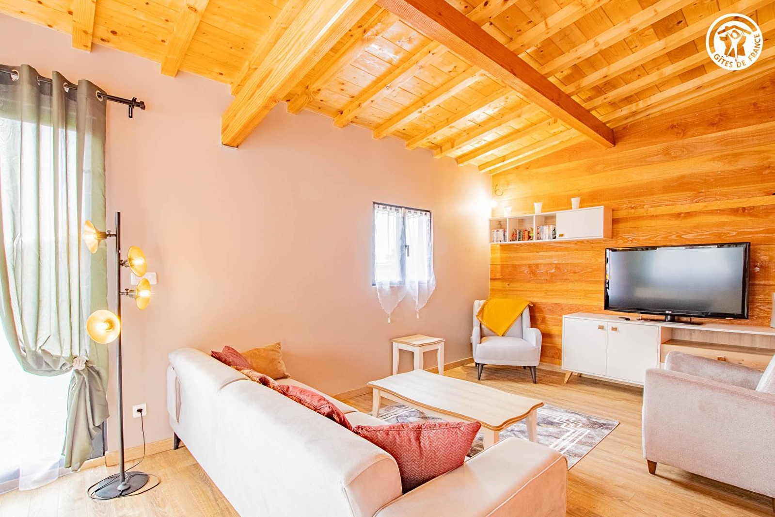 Composition : Maison mitoyenne à une habitation. Wifi (fibre). Chauffage électrique + poêle à granulés bois. Climatisation. Rdc : séjour-cuisine-salon, chambre (lit 2 p. 160x200cm) avec TV & terrasse abritée privées, salle d'eau (douche), Wc indépendant. 1er étage : salon TV en mezzanine, 2 chambres (lit 2 p. 160x200cm / 2 lits 1 p. 90x190cm), sbd (baignoire/Wc). Terrasse + balcon-terrasse abrité + terrain naturel + parking privés. Supermarché à 3.5 km. Toutes commodités 8 km.
