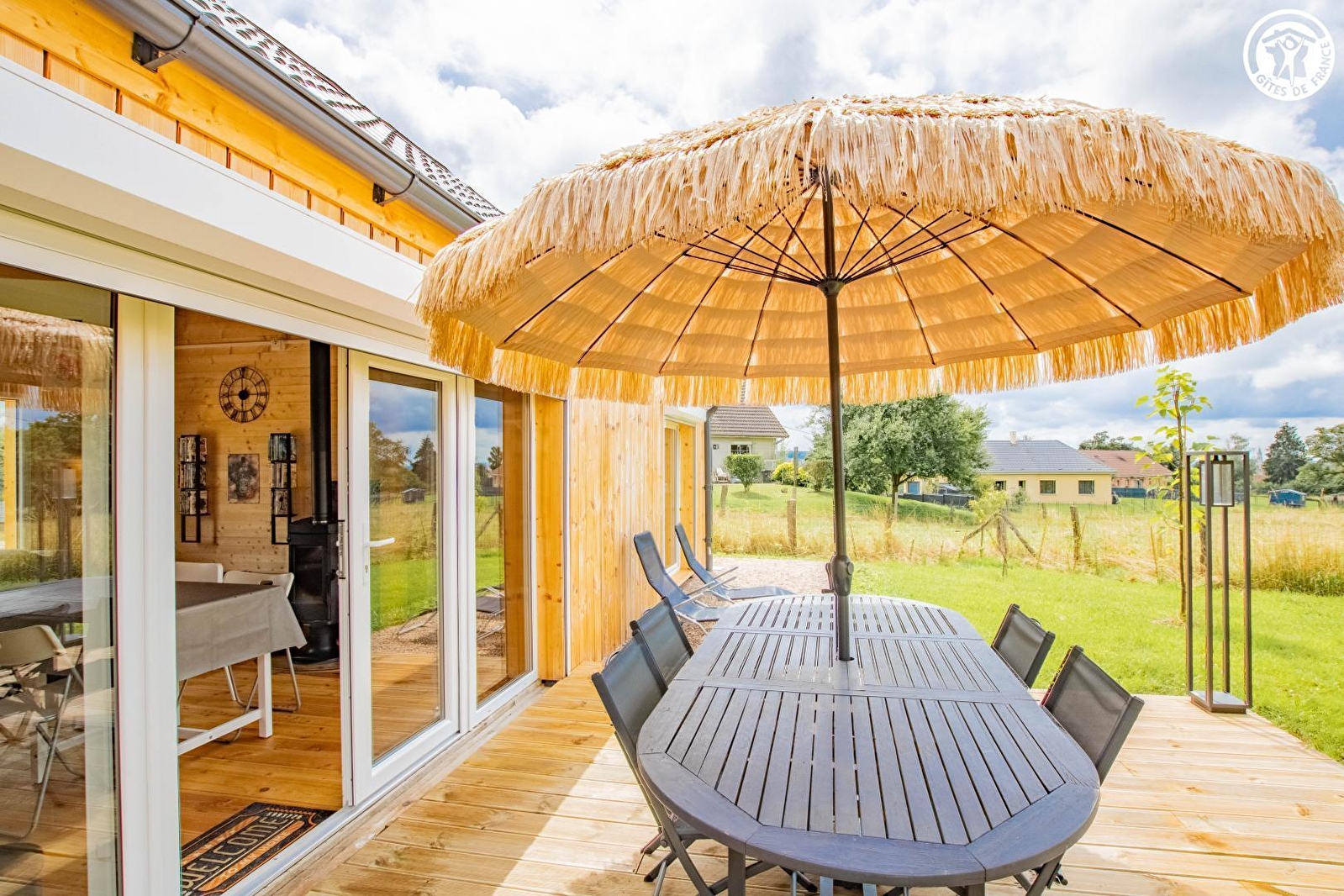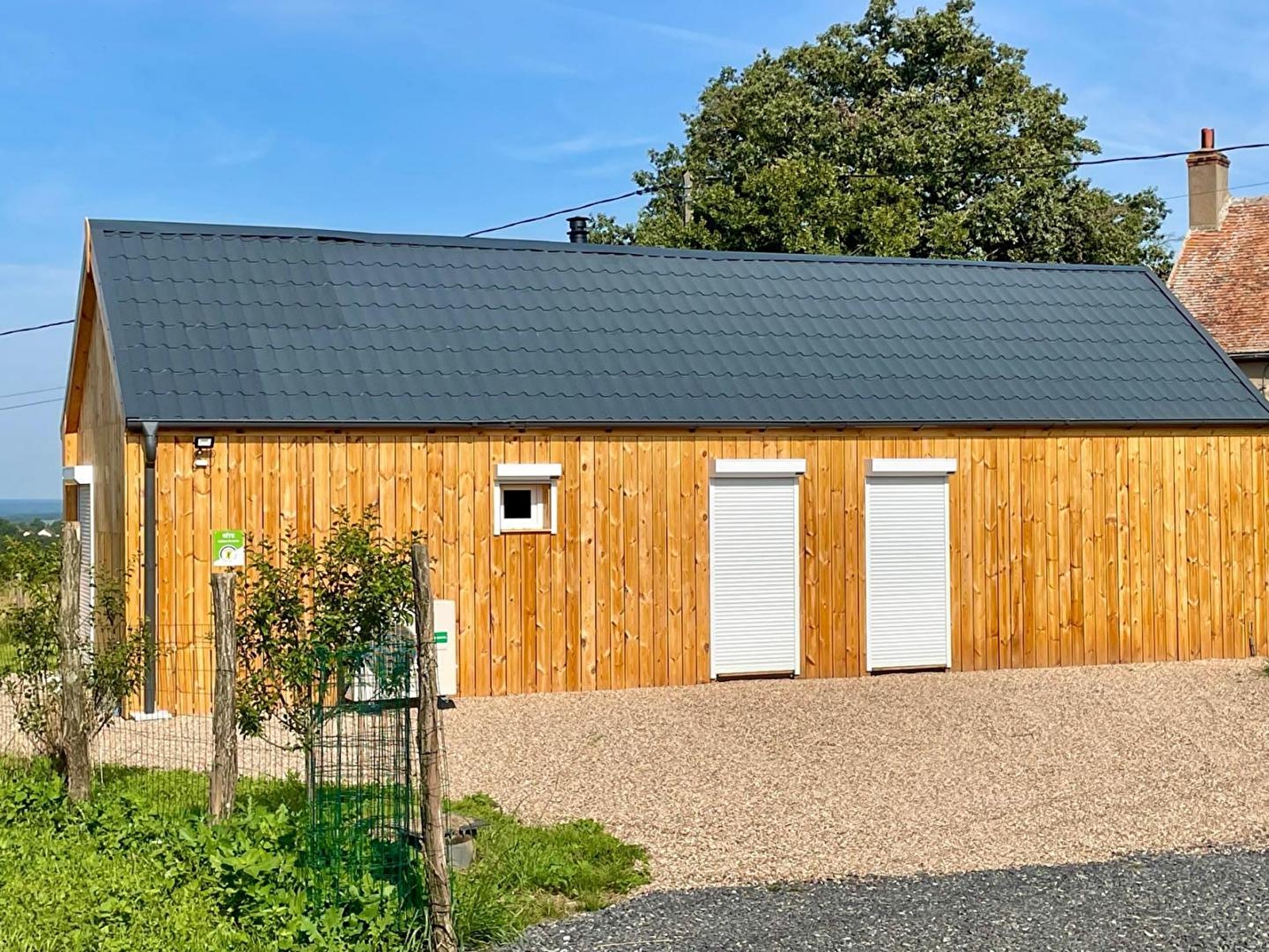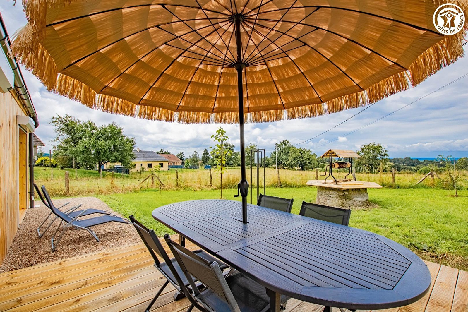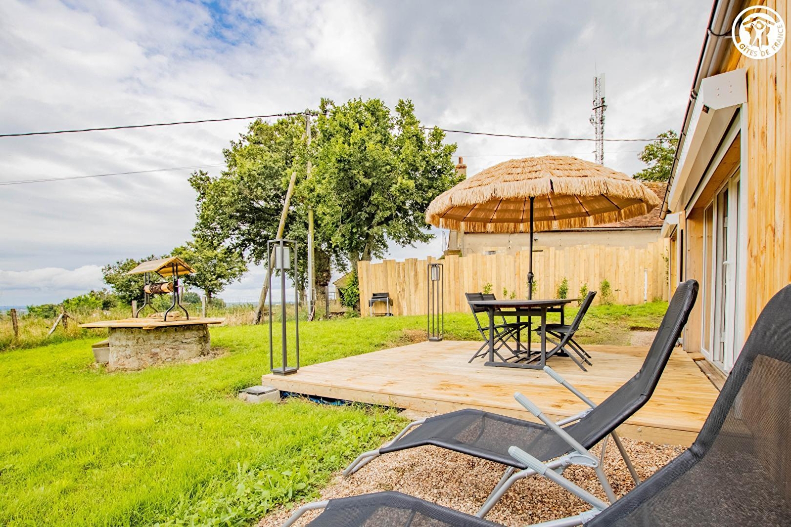 Ravissant "cottage" contemporain niché au calme en "belvédère & balcon panoramique" sur un coteau ouest bien exposé, dominant la ville & un verdoyant vallon, aux confins d’un paisible quartier résidentiel adossé à flanc de colline. Totale tranquillité en pleine campagne brionnaise, lové au sein d’un apaisant cadre préservé de douce campagne vallonnée, en lisière immédiate de champs & prairies (avec les célèbres vaches charolaises comme proches voisines en saison), au creux d’un bucolique plateau de bocage parsemée de belles forêts sauvages, à deux pas du bourg médiéval & de l'intégralité des commodités, comme des établissements thermaux, du casino, du parc public Puzenat chargé d'histoire (6 ha clos aux rares & remarquables arbres centenaires, où paissent des daims !) & des très nombreux équipements de loisirs que compte la ville (dont golf & étang de pêche). Historique cité thermale (reconnue depuis l'antiquité par les romains pour les vertus de ses "eaux"), Bourbon-Lancy dispose d'un très riche patrimoine (église romane du XIe, enceinte médiévale et ses maisons à colombages, quartier des remparts, divers châteaux, églises & chapelles…) et profite d’un magnifique écrin champêtre & naturel alentours, conjuguant agriculture & "pleine nature", entre sublime bocage, forêts, rivières & étangs. Gîte de bon confort. Beaux volumes. Très lumineux. Chaleureux cachet campagnard boisé aux accents contemporains, d’esprit "chalet". Ambiance douillette & cosy. Large terrasse exposée ouverte sur un agréable petit jardin. Belle vue dégagée sur la campagne environnante.