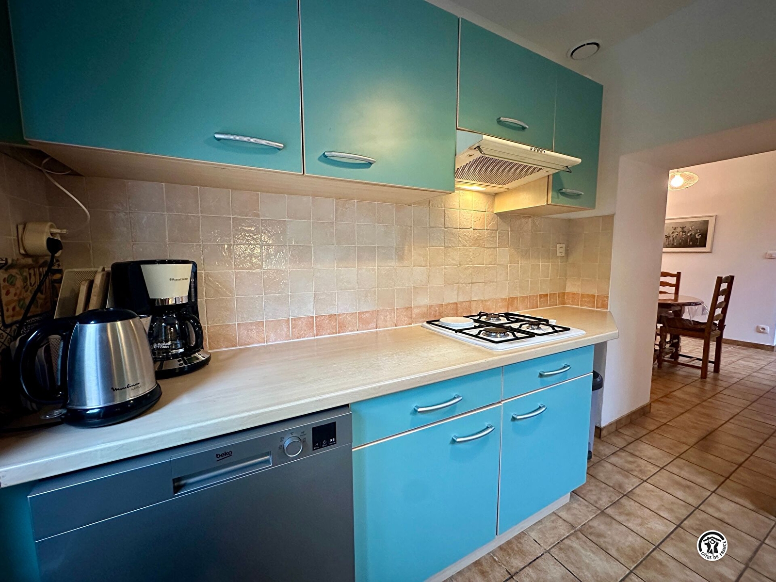 Au rez-de-chaussée, une vaste entrée dessert deux espaces distincts : d’un côté, un salon cosy et confortable, équipé d’une télévision écran plat. De l’autre, une salle à manger attenante à une cuisine fonctionnelle avec lave-vaisselle et micro-ondes. Le four posable électrique se trouve dans le garage. WC indépendant.