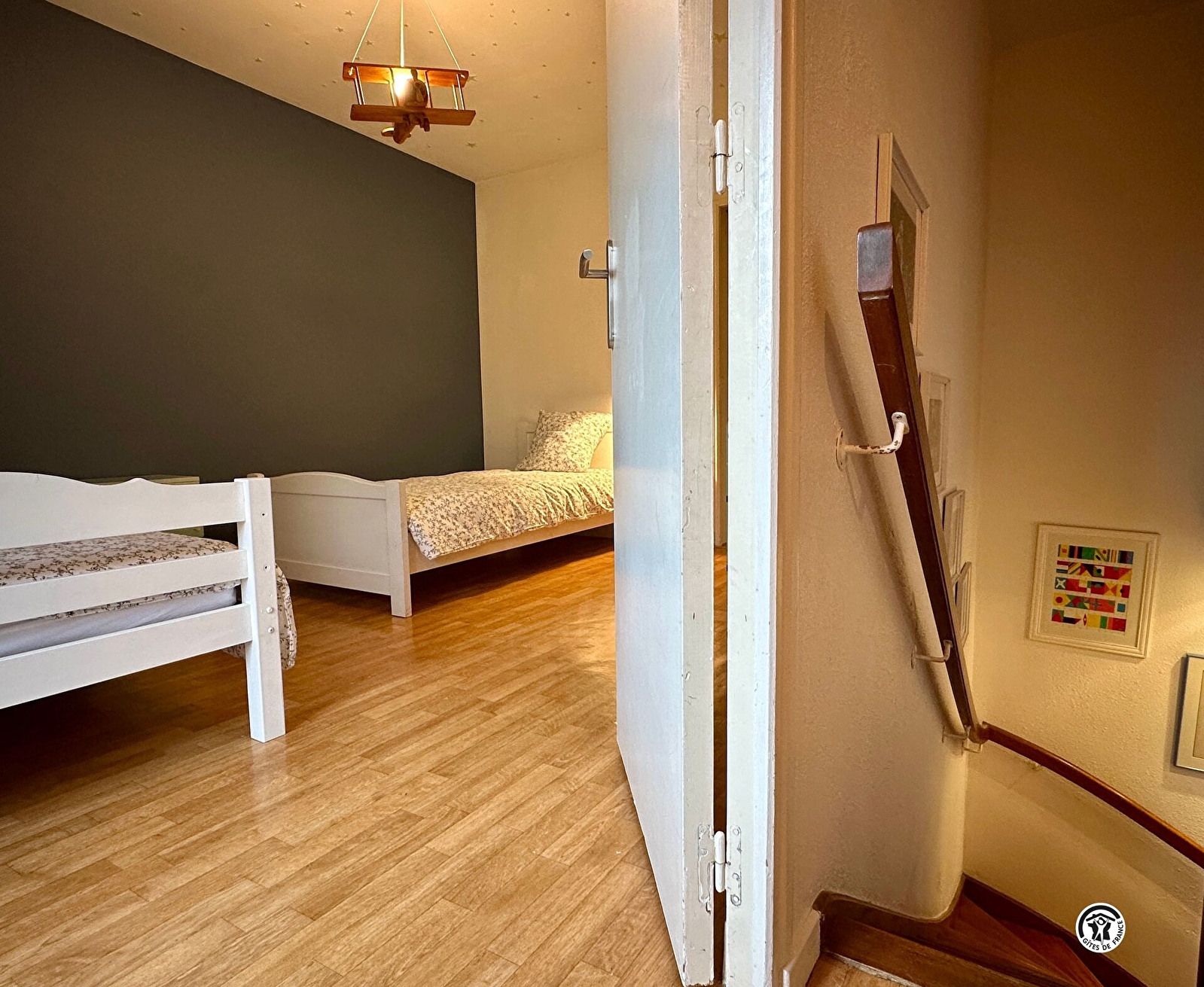 À l’étage, le palier distribue : une chambre avec un lit double de 140 x 190cm, une salle d’eau avec douche et WC. Une deuxième chambre avec deux lits simples (90 x 190 cm), que l’on traverse pour accéder à une grande chambre mansardée climatisée dotée d’un coin nuit avec un lit double (160 cm) et d’un coin bibliothèque / salle de jeux (séparé par un rideau) équipé d’un clic-clac (couchage supplémentaire 15 €/nuit/pax).